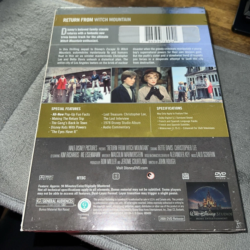 Movie/TV Title:Return from Witch MountainRelease Year:2009UPC:0786936789041Rating:GActor:Bette Davis, Christopher Lee, Ike Eisenmann, Kim RichardsSub-Genre:Live-Actiongtin13:0786936789041Director:John HoughFormat:DVDGenre:Children's & Family