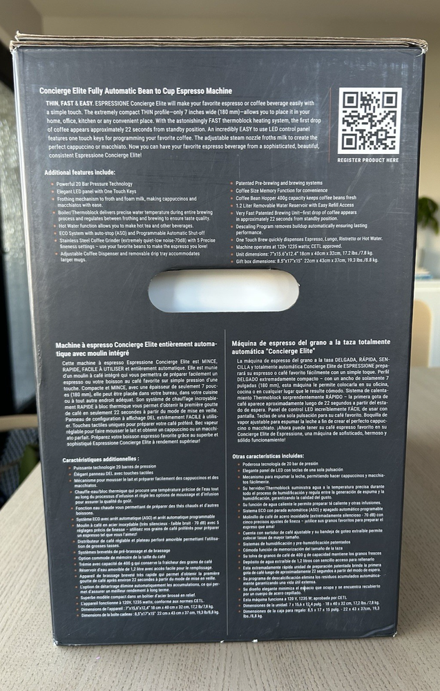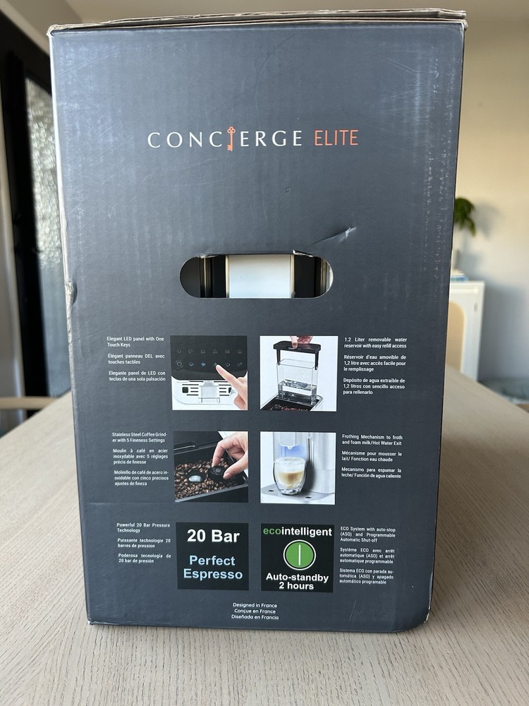 Brand New, Open Box, Retails for $400+ From website: “Turn whole beans into fresh espresso in under 30 seconds with the Concierge Elite Fully Automatic espresso machine from Espressione. The exceptionally compact machine is only 7 inches wide but holds a coffee shop's worth of brewing power. The high-performance 20-bar pump provides a well-balanced extraction for the ideal aroma, flavor and crema with just the touch of a button. The 400-gram bean hopper maintains an airtight seal for fresh flavor, and the adjustable spout fits a variety of cup sizes. Froth milk to perfection for cappuccinos or macchiatos in the comfort of your own kitchen.”