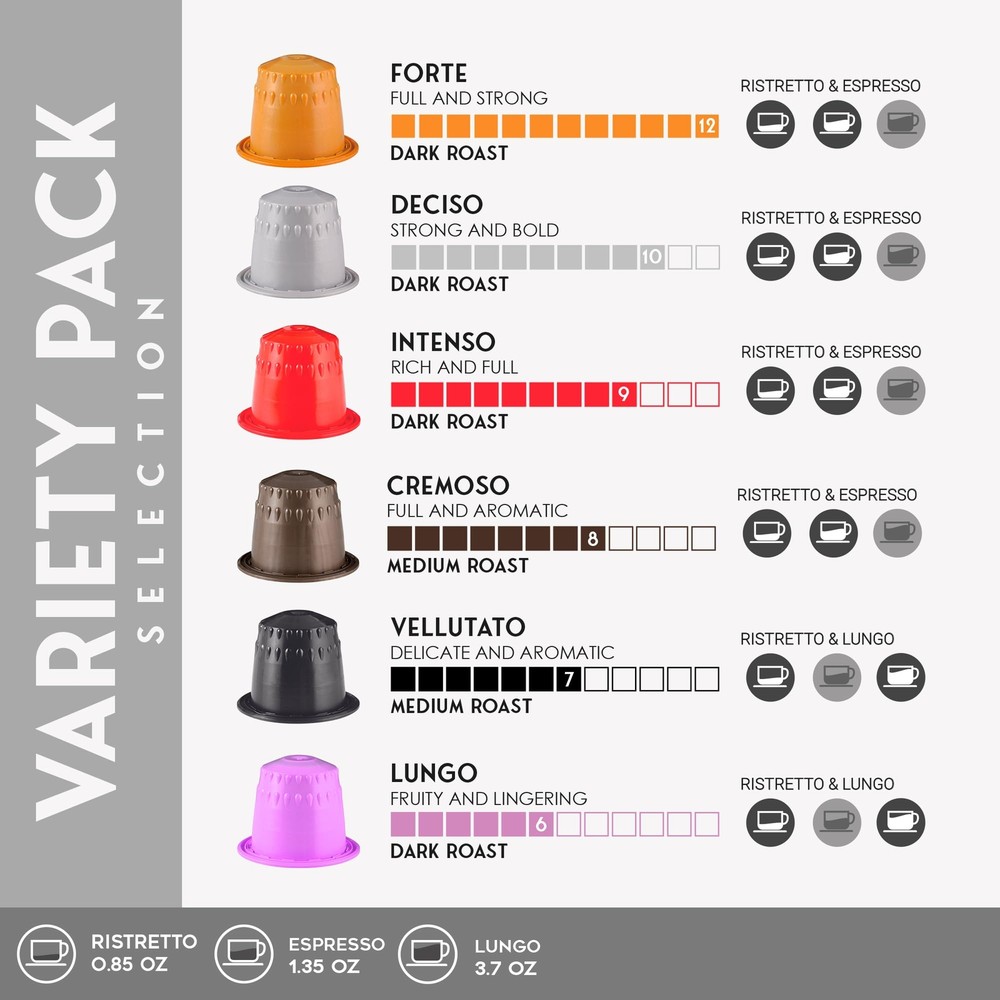Capsules Compatible with Nespresso Machines, 100 Count - VARIETY PACK, Italian Coffee Pods Expresso Become your own barista - Nespresso Expresso Italia capsules, created to deliver the authentic taste of Italian espresso. These recyclable capsules are compatible with Nespresso Original line machines and come in 13 different intensities. Certified Compatibility - Our capsules have undergone rigorous testing to ensure perfect compatibility with Nespresso Original Line machines, and have been verified by an external laboratory for your peace of mind. Enjoy with confidence - Prepare the perfect espresso in just 2 minutes with capsules. These single-dose capsules are hermetically sealed and contain the same high quality ingredients every time, guaranteeing a consistent and delicious coffee experience. Experience a wide range - From medium to dark roast intensities, including FORTE and DECAF, with capsules for capsule coffee makers. Each set includes 10 capsules with the best coffee blends, offering the taste of European-style espresso in the comfort of your home or office. Disclaimer - Please note that is not affiliated with Nespresso in any way. Nespresso is a registered trademark of Societe des Produits Nestle S.A. Our products are not endorsed, sponsored, authorized or approved by Nespresso USA Inc. Shipping We offer FREE shipping on all orders! We ship within Three business days of payment, usually sooner. We use a selection of shipping services such as UPS, FedEx, USPS etc. We only ship to the lower 48 states, no APO/FPO addresses or PO Boxes allowed. Local pickups and combined shipping options are not provided at this time. Return You can return a product for up to 30 days from the date you purchased it. Any product you return must be in the same condition you received it and in the original packaging. Please keep the receipt. Payment We accept payment by any of the following methods: PayPal Please pay as soon as possible after winning an auction, as that will allow us to post your item to you sooner! Feedback Customer satisfaction is very important to us. If you have any problem with your order, please contact us and we will do our best to make you satisfied. Contact Us If you have any queries, please contact us via ebay. We usually respond within 24 hours on weekdays. Please visit our eBay store to check out other items for sale! Thank you for shopping at our store.