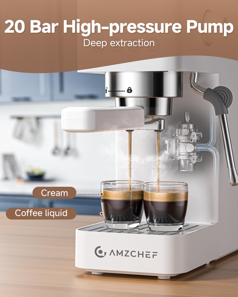 Professional 20 Bar Pressure System - Italian pump delivers 20Bar high pressure for richer crema and bolder flavor than low-pressure machines, perfect for crafting café-quality espresso at home 1350W Efficient Heating - Powerful preheating system heats in just 30 seconds while warming cups to preserve optimal temperature and flavor. With PID temperature control system controls the water temperature to a precise +/- 2°C, ensuring optimal espresso extraction Powerful Steam Milk Frother - Stainless steel milk frothing system supports 360° free rotation, powerful steam produces fine and dense milk froth with high water content, perfect for lattes/cappuccinos and other fancy coffees One-Touch Easy Operation - Intuitive button design makes it easy to get started even if you've never made coffee before. You can choose between single/double cup extraction or customise the extraction time to precisely control the strength of your espresso