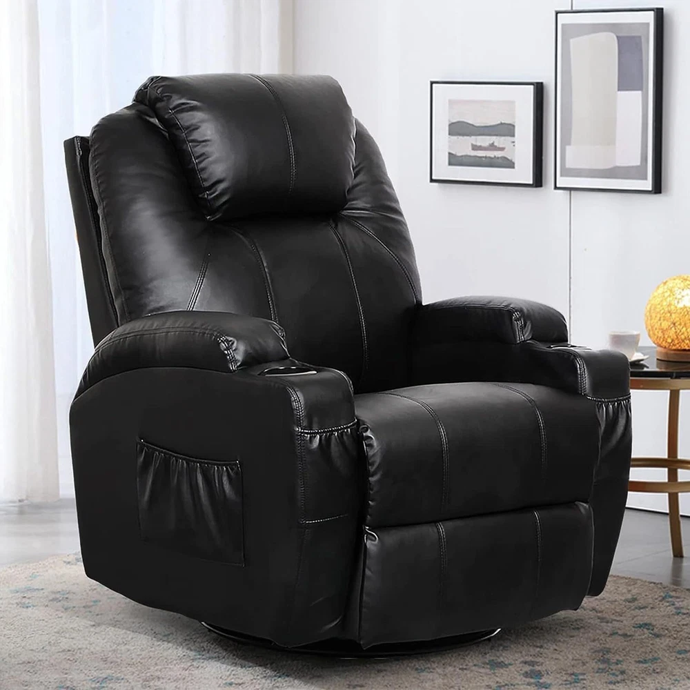 About this item Enhanced Massage Recliner Chair: The Esright recliner chair features an advanced 8-point massage system (specifically targeting the back, lumbar, thighs, and legs) combined with a lumbar heating function. This allows you to indulge in a comprehensive full-body massage experience, effectively promoting blood circulation, reducing fatigue, and alleviating stress. Customize your massage session with various modes and intensities via the convenient remote control Premium Upholstery & Robust Framework: Crafted with a generously overstuffed backrest, armrests, and cushion, the Esright recliner chair meticulously conforms to the contours of your body, ensuring ultimate relaxation. Its sleek and elegant design seamlessly blends with modern furniture, adding a touch of warmth and sophistication to your home. Constructed using formaldehyde-free wood boards that meet the rigorous P2 standards set by the California Air Resources Board (CARB), this chair guarantees both safety and durability Versatile Adjustable Recliner Chair for Adults: The Esright rocker recliner offers unparalleled flexibility, with an adjustable backrest that spans from 90° to 160° to suit your varying needs. It boasts a smooth 360° swivel function, perfect for casual sitting or reclining. Equipped with a convenient pull handle on the right side, the footrest automatically extends with a simple tug, providing unparalleled ease of use. Experience extreme comfort and a cinematic feel right in your own home Straightforward Assembly & Comprehensive Customer Support: The Esright recliner chair includes comprehensive assembly instructions and user guide for effortless setup. It takes just 10-15 minutes to complete the installation process, with no tools required. In the event of any shipping damage or defects during use, please reach out to us without hesitation. Our dedicated customer service team will provide the best possible solution within 24 hours.Kindly proceed with assembly once you have received both boxes Dependable Comfort for All: The Esright medical-grade standing recliner stands as an exceptional choice for individuals facing mobility challenges, recovering from surgical procedures, or simply seeking a luxurious seating option. Crafted with a treated fabric surface, it ensures a comfortable and soothing experience tailored to your specific needs. Whether you're looking to relax in your living room, require assistance with daily activities, or need a reliable chair for therapy sessions, this recliner offers unparalleled support and comfort Upgraded design, high quality steel frame and soft fabric material. More durable and comfort. The massage recliner can be used in the living room or bedroom or office to enjoy leisure time. The swivel chair is designed with massage and heat function by remote control. Recliner Chair Dimension Overall size: 33.5"(W) x 35.8"(L) x 43.2"(H) Seat Height: 18.9" Fully Reclining Length: 65" Weight Capacity: 300lbs Rocking Chair Detail Color: Coffee Surface Material: Fabric Frame Material: CARB Certified Board and sturdy iron Easy Assembly Needed Package Details box 1 (chair base) box 2 (armrests and chair back) Recline Method Manual control by buckle at right side Heat & Message Function 8 vibration massage nodes for back, lumbar, thigh and legs 2 vibration intensities 5 massage modes Heat function for lumbar Remote Control The swivel chair is designed with massage and heat function by remote control. Comfortable Padded Headrest Convenient Cup Holder Durable Steel Frame