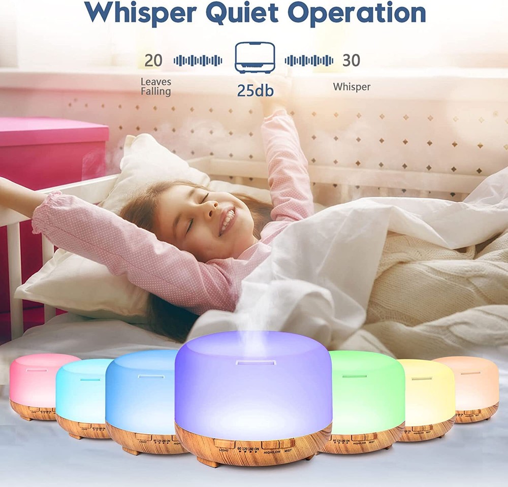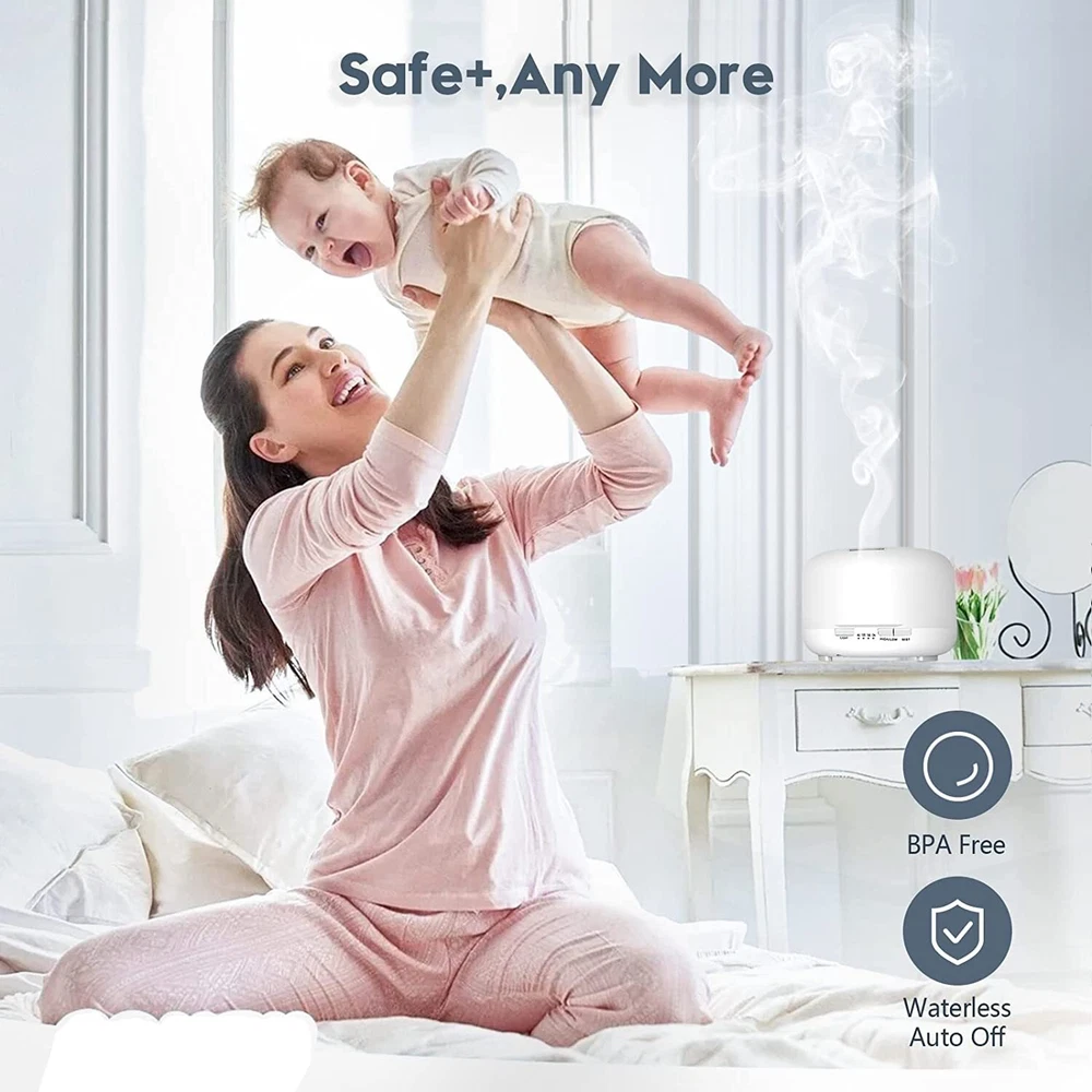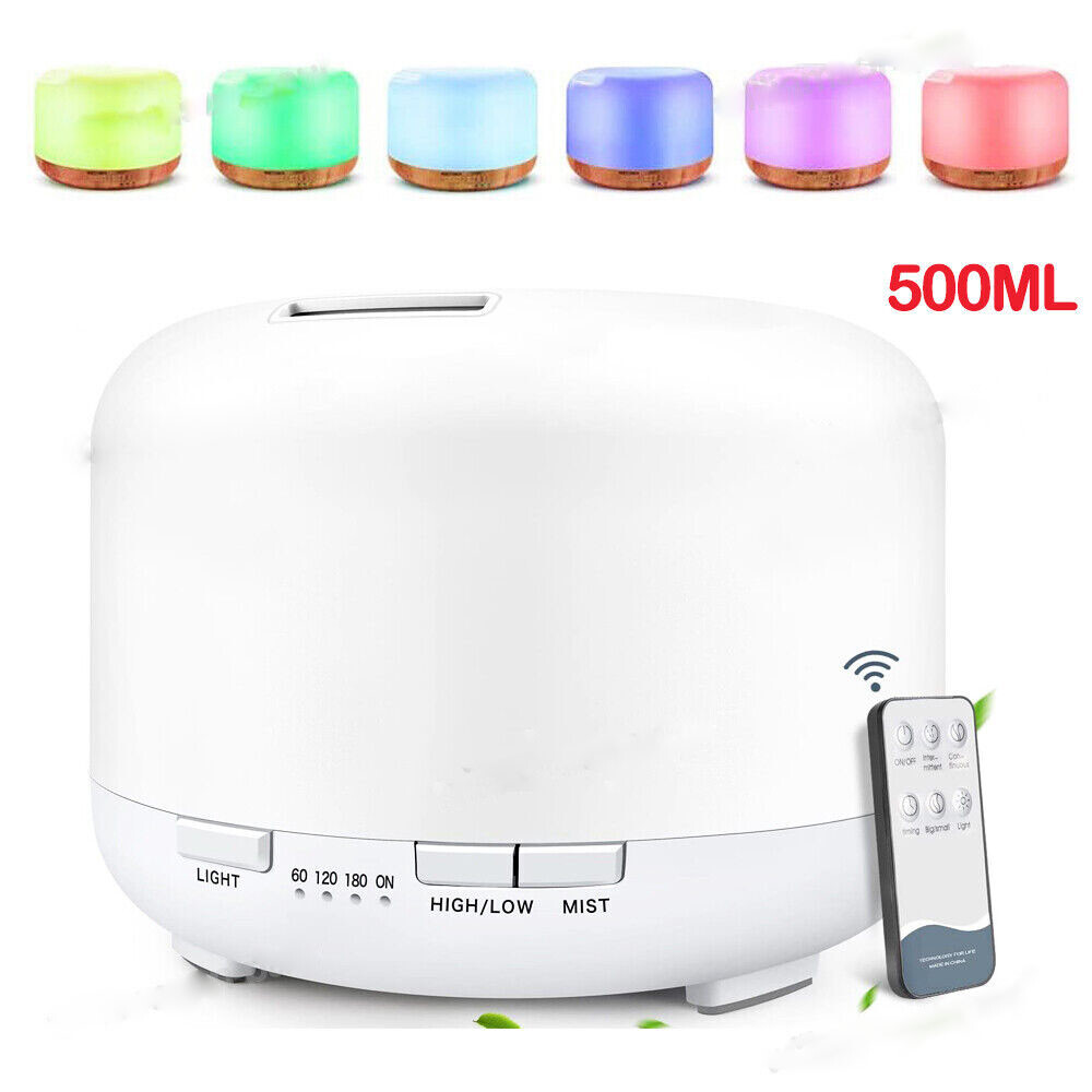 Description 【4 in 1 FUNCTIONS】Aromatherapy Diffuser, Humidifier, Night Light. 【BPA Free Aromatherapy Humidifier】 Use safe and eco-friendly BPA Free materials which the baby bottles are made from, as well as state-of-the-art production processes and strict quality control, this ultrasonic essential oil diffuser is an amazing aromatherapy device to release your tried and make your life better 【 Auto Shut Off】This fragrance oil diffuser will automatically shut off when water runs out. This air aroma diffuser has 4 timers: 1H/2H/3H/Continuous, which can be set via the "MIST" button on the aroma diffuser or with the remote control, which is very convenient. 【Improve Air Quality Of Your Living Space】 Not only an aromatherapy, this essential oil diffuser can also be used as a humidifier to improve your home's air and atmosphere quality, cover the odd of pets or smoking and protect you family from excessively dry air, microorganisms, allergens, dust, and more! 【Automatic Off Ensure Your Safety】 Large 500ml water capacity means it can continue use up to 8 hours. When time is up or there is no water, it will turn off automatically, keeping the peace of your mind and ensuring your safety. Press the "Mist" button for more than one second, choose the timer from 120 min, 240 min, or ON. 【Quiet Enough To Give You A Good Night】 Lower than 30dB quiet Aroma Essential Oil Diffuser with Adjustable Cool Mist Mode, this Humidifier will offer you a wonderful night. 7 Color LED Lights fit for home, office and everywhere you want put it, it is the best gift for your family and friend. Specification: Capacity: 500 ml LED light color: 7 kinds Full tank duration: 12-16 hours intermittently Timer: On/1 H/ 3 H/6 H Mist level: High/Low Coverage: 360-450 square feet Packing list (only diffuser) 1*500ml diffuser 1*remote control 1*Adapter 1*User manual Packing list 1*500ml diffuser 6*10ml essential oil 1*remote control 1*Adapter 1*User manual Instructions: Move the top cover. Find the adapter and essential oil in the tank. Add water and 5-6 drops of essential oil to the aroma diffuser. Electrify the LED light diffuser and turn it on. Adjust the light, mist, and time to your personalized needs.