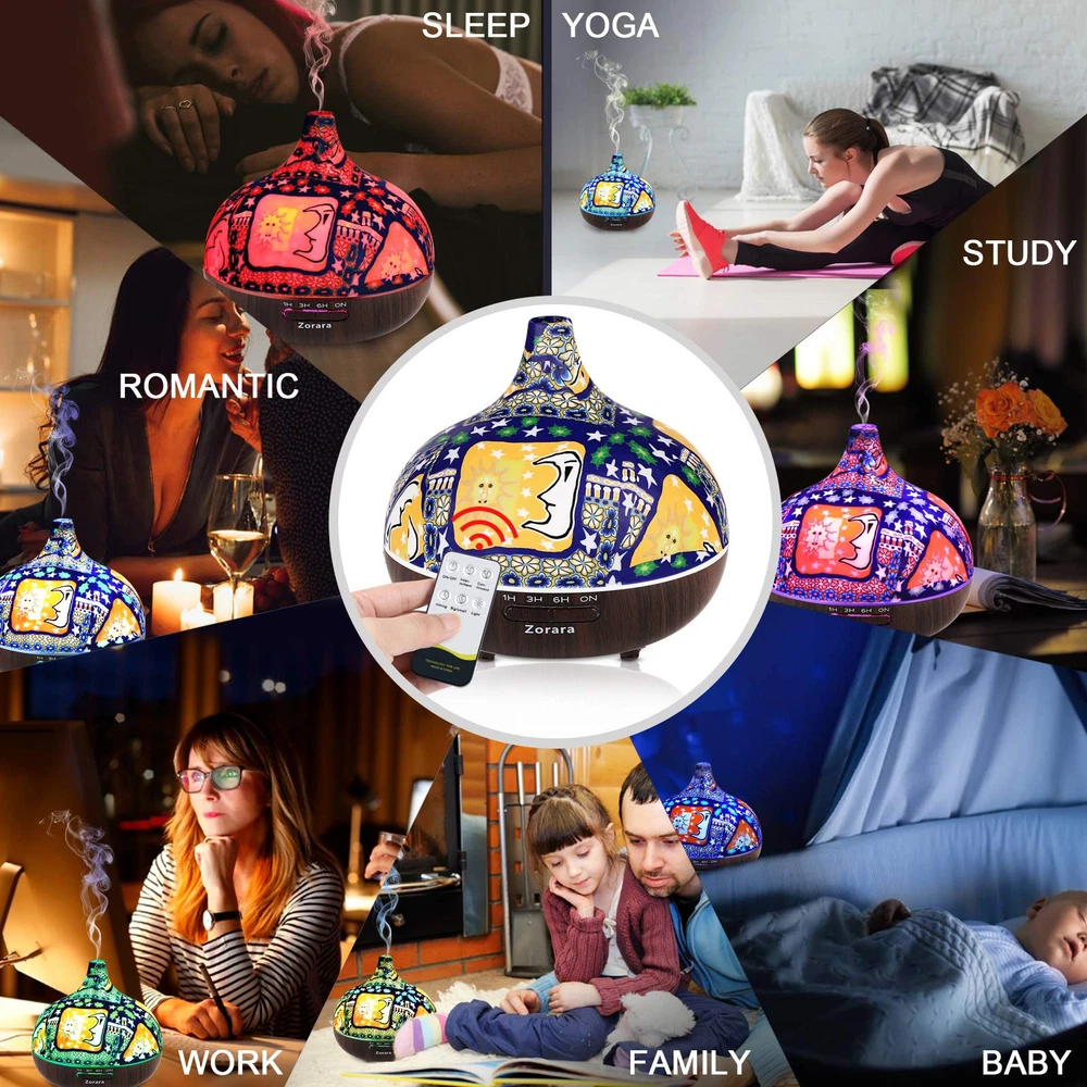 ♨ Galaxy 3D diffuser ♨ This essential oil diffuser also functions as a night light. Night light & humidification function can be turned on separately.Atomization produces water mist, which can remove the dust in the air to purify the air, increase the humidity of the air, nourish the skin and our home's atmosphere quality. ♨ 7 Changing LED Lights & Remote Control - The essential oil diffuser is rotated to 7 gradient color automatically or fixed on one color light, could set the dim or bright color. Creating you a calm and soft atmosphere while you are working, relaxing, sleeping, spa, yoga, salon, bedroom, office. You can control with the remote control (include) when you in bed. ♨ 2 Mist Modes & Timer Control - Our aromatherapy diffuser's capacity is 550ml which can last 18 -36 hours. Refreshes and moisturizes the air for rooms of 25 - 60 m². And it can choose strong or low mist, or interval(30s on and 30s off) mode. 4 timers for you(1H/3H/6H/ON), It means that you can control the working time. ♨ Safety & Waterless Auto Shut off - BPA free material with hand made glass cover, It’s safe for children and the pregnant. Safety devises inside which will be shut off when the water tank is empty. Of course, it also can be used as a small decoration, especially creates a romantic atmosphere. ♨ Creative & Practical Gift Idea - 550ml 3D affect large tank glass humidifiers is exactly what you are looking for your family and friends. Besides, you can also use it as a stunning night light. Smooth the pressure, balance mood, especially creates a romantic atmosphere and relieve the winter dryness effectively. It is a very good Christmas idea & household gifts.
