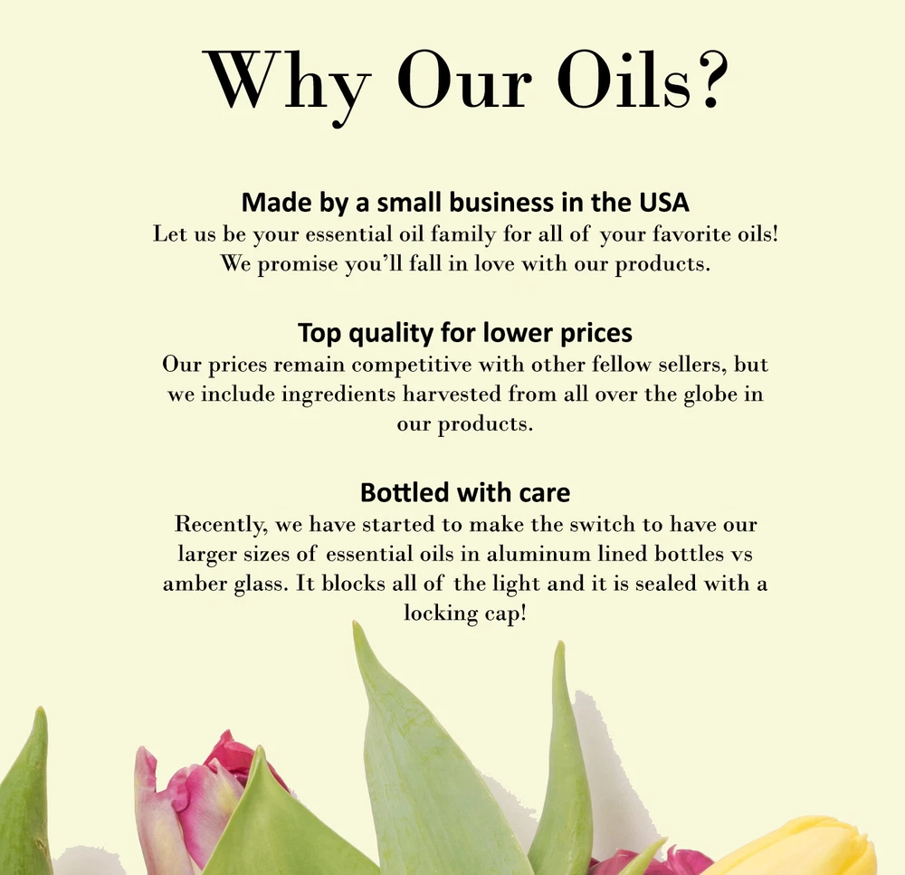 Essential Oils Product Botanical Name Aromatic Scent Color/Consistency Anise Star Illicium Verum Sharp, Anise-like aroma Pale Yellow/Thin Basil Ocimum Basilicum Sweet, herbaceous, licorice-like, slightly campherous Clear/Thin Bergamot Citrus Bergamia Fresh, orange/lemon/citrusy, slightly floral Golden/Thin Black Pepper Piper Nigrum Crisp, fresh, peppercorn aroma Clear/Thin Blood Orange Citrus Sinensis Similar to sweet orange - slightly more tart and complex Pale Yellow - Golden/Thin Cajeput Melaleuca Cajeputi Fresh, camphorous, slightly fruity Pale Yellow/Thin Camphor White Cinnamomum Camphora Sharp and camphoraceous, with woody undertones Pale Yellow/Thin Cananga Java Cananga odorata Floral, sweet, slightly woody Pale Yellow/Thin Cardamom Elettaria Cardamomum Spicy, woody, rich, sweet Clear/Thin Carrot Seed Daucus Carota Earthy, woody, warm. Can be considered harsh Golden/Medium - Thin Cedarwood Atlas Cedrus Atlantica Woody and sweet Light Yellow/Medium Cedarwood Chinese Thuja Orientalis Fresh, woody, and balsamic Clear/Medium Cedarwood Texas Juniperus Ashei Balsamic, smoky, sweet, faintly oily aroma becoming sweeter in the dry-down Clear - Brownish-orange/Thick Cinnamon Bark Cinnamomum Zeylanicum Sweet, warm, deep and exotic Slightly Reddish with a hint of Brown/Thin Cinnamon Cassia Cinnamomum Cassia Warm and Spicy Brown/Watery-Thin Citronella Cymbopogon Nardus Citrusy, slightly fruity, fresh, sweet Clear/Thin Clary Sage Salvia Sclarea Bright, earthy, herbaceous, with a subtle fruity note Yellow/Thin Clove Bud Syzygium Aromaticum (From Bud) Spicy, warming but slightly bitter, and woody Golden/Medium Clove Leaf Syzygium Aromaticum (From Leaf) Spicy, warming but slightly bitter, and woody Light Yellow/Medium Coffee Coffea Arabica L. A middle note of medium aroma, Coffee Essential Oil smells just like a fresh brewed pot of coffee Dark Brown/Thick Cypress Cupressus Sempervirens Fresh, herbaceous, slightly woody, evergreen aroma Pale Yellow/Thin Eucalyptus Globulus Eucalyptus Globulus Fresh, medicinal, woody, earthy Clear/Thin Eucalyptus Radiata Eucalyptus Radiata Smoother and softer than it's counter-part, Eucalyptus Globulus Clear/Thin Fennel Foeniculum Vulgare Dulce Sweet, slightly spicy, licorice-like aroma Clear - Pale Yellow/Thin Fir Needle Abies Alba Fresh, woody, earthy, sweet Clear - Pale Yellow/Thin Frankincense (Carterii) Boswellia Carterii Sweet fragrance with deep and resinous notes. Strong terpenic top note and lovely pine heart notes. Fresh, fruity and spicy Light Yellow - Pale Amber/Thin Frankincense (Serrata) Boswellia Serrata Fresh, woody, balsamic, slightly spicy and fruity Light Yellow/Thin Garlic Allium Sativa Odor characteristic of garlic Yellow/Thin Geranium Pelargonium Graveolens Floral, fresh, sweet, with a fruity note Clear/Thin Ginger Zingiber Officinale Warm, spicy, earthy, woody Pale Yellow/Thin Grapefruit Citrus Racemosa or Citrus Paradisi Sharp, Anise-like aroma Pale Yellow/Thin Hyssop Hyssopus Officinalis Fresh, earthy, fruity, woody, slightly sweet Clear/Thin Juniper Berry Juniperus Communis Crisp, woody, sweet, earthy, with almost a hidden fruity note Clear/Thin Lavender Lavandula Officinalis Floral, fresh, sweet, herbaceous and sometimes slightly fruity Clear - Light Yellow/ Thin Lemon Citrus Limonum Fresh Lemon - more concentrated and rich smelling Pale Yellow/Thin Lemon Eucalyptus Eucalyptus Citriadora Sweet, lemony, fresh, with a woody hint Pale Yellow/Thin Lemongrass Cymbopogon Flexuosus Fresh, lemony, earthy Pale Yellow - Yellow/Thin Lime Citrus Aurantifolia Fresh, citrusy, sweet, slightly tart Green/Thin Litsea Cubeba Litsea Cubeba Sharp, with a complex lemony aroma Yellow/Thin Marjoram Majorana Hortensis Herbaceous, sweet, woody, with a campherous, medicinal aroma Clear - Pale Yellow/Thin Myrrh Commiphora Myrrha Fresh, lemony, herbaceous Yellow/Thin Myrrh/Frankincense 50/50 Commiphora Myrrha/Boswellia Serrata Fresh, woody, balsamic, slightly spicy and fruity Golden/Medium Neem Azadirachta Indica Rich, earthy, musty smell Dark Brown/Thick Nutmeg Myristica Fragrans Rich, spicy, sweet, woody. More fragrant than the powdered spice Clear/Thin Orange Sweet Citrus Sinensis Sweet, and similar to orange peels - but more concentrated Golden - Orange/Thin Orange 5x Citrus Sinensis Sweet, and similar to orange peels - but higly concentrated Golden - Orange/Thin Oregano Thymus Capitatus Herbaceous, sharp Pale Yellow/Thin Palmorosa Cymbopogon Martini Var Motia Fresh, floral, sweet Pale Yellow/Thin Patchouli Pogostemon Cablin Rich, earthy, woody aroma with a nearly hidden fruity note Golden - Light Brown/Thick - Medium Peppermint Mentha Arvensis Minty - very concentrated (more fragrant than spearmint) Clear - Pale Yellow/Thin Petitgrain Citrus Bigarradia Minty - very concentrated (more fragrant than spearmint) Clear - Pale Yellow/Thin Pine Pinus Pinaster Fresh, woody, earthy, balsamic Clear/Medium - Thin Rose Geranium Pelargonium Capitatum Floral. Similar to Geranium, with a hint of rose. Pale Yellow/Thin Rosemary Rosmarinus Officinalis Fresh, herbaceous, sweet, slightly medicinal Clear/Thin Sage Salvia Officinalis Herbaceous, fruity, fresh, camphorous Clear/Thin Spearmint Mentha Spicata L. Minty, slightly fruity aroma that is less bright than peppermint Clear/Thin Styrax Benzoin Styrax Benzoin Rich, warm, slightly woody, creamy, vanilla Golden/Thick Tangerine Citrus Reticulata Fresh, sweet, similar to concentrated tangerine peels Orange/Thin Tea Tree Melaleuca Alternifolia Medicinal, fresh, woody, earthy, herbaceous Clear - Pale Yellow/Thin Thyme Red Thymus Vulgaris Fresh, medicinal, herbaceous Clear - Pale Yellow/Medium Thyme White Thymus Zygis Fresh, medicinal, herbaceous Clear - Pale Yellow/Medium Vetiver Vetiveria Zizanioides Anti-septic, anti-stringent, stress relief, calming, sedative, and tonic Golden - Dark/Thick Wintergreen Gaultheria Procumbens Muscle pain relief and decongestion Clear/Thin Ylang Ylang Cananga Odorata Calming, uplifting and hypertension