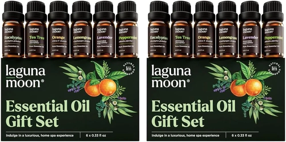 Top selling essential oils set: We create our essential oils using rigorously tested ingredients. Top blends, make pampering a luxurious experience with our set of 6 10ml oils. Perfect for blending to make candle making scents, bath bombs or a unique aromatherapy experience. Join 110,000+ customers who love our essential oils for massage, aromatherapy, and candle making! Plant-powered ingredients from around the world: Our team brings you the purest tea tree essential oil from Australia, eucalyptus from China, lavender from France, orange oil from Brazil, and peppermint and lemongrass from India. Extra Potent: Some essential oils can go rancid quickly once exposed to heat, light and oxygen. Our FrostProtect bottle keeps oil stable for 24+ months, so you can enjoy the benefits of your oils for longer. Steam-distilled and cold pressed for longer lasting aroma: LagunaMoon never uses nasty solvents like hexane or other toxic chemicals. We carefully distill our potent oils to preserve their fragrance for longer. Perfect Gift: Comes in a beautiful gift box, this essential oil set is the perfect gift for your loved ones: Christmas, New Year’s, Valentine’s Day, Birthday, Mother’s Day, Anniversary, Wedding gift, etc. Make any occasion memorable with our 6pc Essential Oil Set. Product Description Where are the oils made? We source our raw materials across the world, Lavender from France, Tea Tree from Australia, Lemongrass from India, Orange from Brazil and so on. Distillation and packaging takes place in China. How can I use these oils? These oils are great for diffusers, DIY projects such as candle making, soap making, or even creating your own bath bombs. They are also perfect for making your own cleaning products. What if I want to test the Essential Oil on my skin? First clean and dry the are that you want to test. We recommend wrist, elbow or behind the ear. Before applying to the skin, mix with a carrier oil and use a small amount on the skin and monitor over a few days for signs of an allergic reaction. What is the shelf life of these oils? These oils have a shelf life of up to 3 years. To maximize their stability, keep them away from direct sunlight. Essential Oil Comparison Table Add to Cart Add to Cart Add to Cart Customer Reviews 4.5 out of 5 stars 176,504 4.5 out of 5 stars 176,504 4.5 out of 5 stars 19,048 4.5 out of 5 stars 176,504 Price $9.95 $ 9 . 95 $31.99 $ 31 . 99 $19.99 $ 19 . 99 $14.99 $ 14 . 99 Count 6 20 16 1 Size 6 x 10ml 20 x 10ml 16 x 10ml 1 x 150ml Scent Assorted Assorted Assorted Tea Tree Usage Diffuser/Bath/Crafts/Spa Diffuser/Bath/Crafts/Spa Diffuser/Bath/Crafts/Spa Diffuser/Bath/Crafts/Spa Dropper Glass Euro Dropper Glass Euro Dropper Glass Euro Dropper Glass Dropper