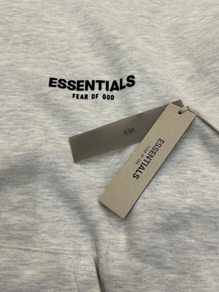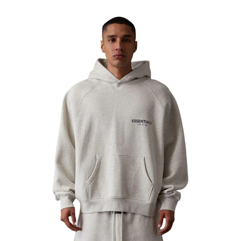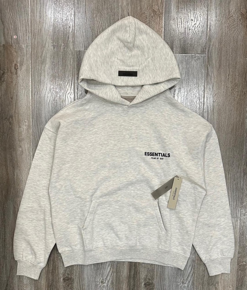 **2022 release, sold out** **100% authentic with tag** The Essentials Fear of God Light Oatmeal Hoodie features an oversized fit, long sleeves, an attached hood, a rubber brand logo on the hood, and an "ESSENTIALS" graphic on the front and back. Solid color Hoodie Brushed back fleece Attached hood Long sleeves Essentials graphics Kangaroo front pocket Rubber brand label on hood Ribbed cuffs and hem Oversized fit 80% cotton, 20% polyester Style No. 192BT212112F Color Light Oatmeal