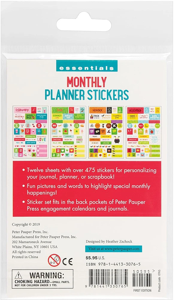 Store New Arrivals Add to Favorite View Feedback Contact Fast deliveries to the customer's home Quality customer service John Make the customers happy! Essentials Month by Month Planner Stickers (Set of 475 Stickers) Description Month by month, season by season, holiday by holiday, here are more than 475 fun stickers for personalizing your journal, planner, or scrapbook for the year. 12 sheets -- one for each month -- are packed with cute and colorful stickers! Stickers for New Year's Day, Valentine's Day, Easter, Halloween, Christmas, Thanksgiving, Christmas, and other big days are combined with upbeat expressions like ''Best Year Ever,'' ''Love Your Life,'' ''Feeling Lucky,'' and ''Good Day.'' You'll also find hearts, butterflies, flowers, stars, Canadian and USA flags, zodiac symbols, and many more. Borders, write-in stickers, and other designs allow for extra customization of your planner or journal. Sticker set fits in the back pockets of Peter Pauper Press engagement calendars and journals. Package measures 4'' wide x 7-1/2'' high. Publisher Peter Pauper Press (May 1, 2019) Paperback 475 pages Dimensions 4.25 x 0.25 x 6.25 inches Language English Item Weight 2.24 ounces ISBN-10 1441330763 ISBN-13 978-1441330765 ABOUT US We offer the best prices around on high quality products. Our E-store includes media such as books, movies, music and games while offering electronics, toys, sporting apparel, clothing, tools, general home, garden items and more. SHIPPING We are always working hard to ensure your package arrives as soon as possible. Please understand that some factors like weather, high postal traffic, and the performance of shipping companies are outside of our control. We offer free shipping to the lower 48 states and ship within 2 business days of payment, usually sooner. We do not accept P.O. Boxes. Please provide a physical address. For shipping outside of the continental USA, we only use eBay's Global Shipping Program. The item is shipped to KY and then sent to the rest of the world. International customers are responsible for all duties and taxes. Continue to 'check out' to calculate costs for shipping the item to your country. Messages regarding eBay's Global Shipping Program MUST be directed at eBay EXCLUSIVELY. RETURNS We offer a 30-Day Return Policy on items in which you are not completely satisfied with. You have the option of a full-refund or an exchange of the item. No returns are available on items shipped outside of the USA PAYMENT We accept PayPal. CONTACT US This page content is yet to come Please ad us to your favorite seller and visit again later Thank You CUSTOMER SATISFACTION We try our very best to make sure every customer is completely satisfied. If there's a problem, message us! We're happy to help. WE ACCEPT