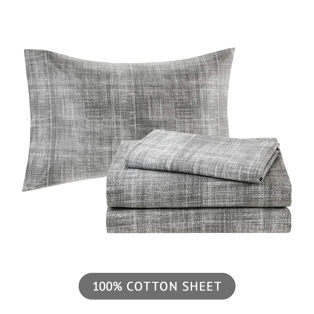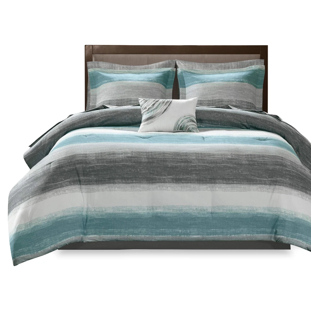 The Essentials Saben 9 Piece Complete Bed and Sheet Set provides a casual and modern update to your bedroom. A printed watercolor stripe motif, in aqua, grey, and white hues, is beautifully displayed on the ultra-soft microfiber comforter. The coordinating shams complement the pattern seen on top of the bed to pull the ensemble together. A 100% cotton sheet set includes a fitted sheet that fits up to a 16-inch mattress, a flat sheet, and two pillowcases in a textured grey hue to complement the casual style of the comforter. Completing the look is an embroidered decorative pillow in coordinating colors, while a solid grey bed skirt adds a creates a crisp finish to this incredibly soft complete bed and sheet set. 9 Piece Bed in a Bag Set - Elevate your bedroom with our comforter and sheet set. Featuring a coastal comforter with stunning watercolor prints and a chambray 100% cotton sheet set, it offers a complete and stylish makeover for a total refresh Coastal Bedding Set - The Saben Comforter Set features a charming watercolor print in stunning grey, white, and aqua contrasts. Crafted with a soft brushed microfiber cover and lightweight, skin-friendly poly filling, it offers year-round comfort 100% Cotton Sheet Set - The Bed in a Bag includes a lightweight & breathable 100% muslin cotton sheet set. The grey chambray finish adds sophisticated contrast. The fitted sheet elastic pocket fits mattresses up to 14 inches (12 inches for Twin size) OEKO-TEX certified for superior COMFORT and WELLNESS, as they are free from any substances or chemicals that may compromise quality, and is hygienically treated for lasting freshness DURABLE & EASY CARE: Our microfiber comforter and cotton sheets offer durability to withstand daily wear and tear. Simply machine wash cold on LOW cycle. Do not bleach, Tumble dry LOW HEAT. Iron on medium heat if needed. Decor pillow spot clean only