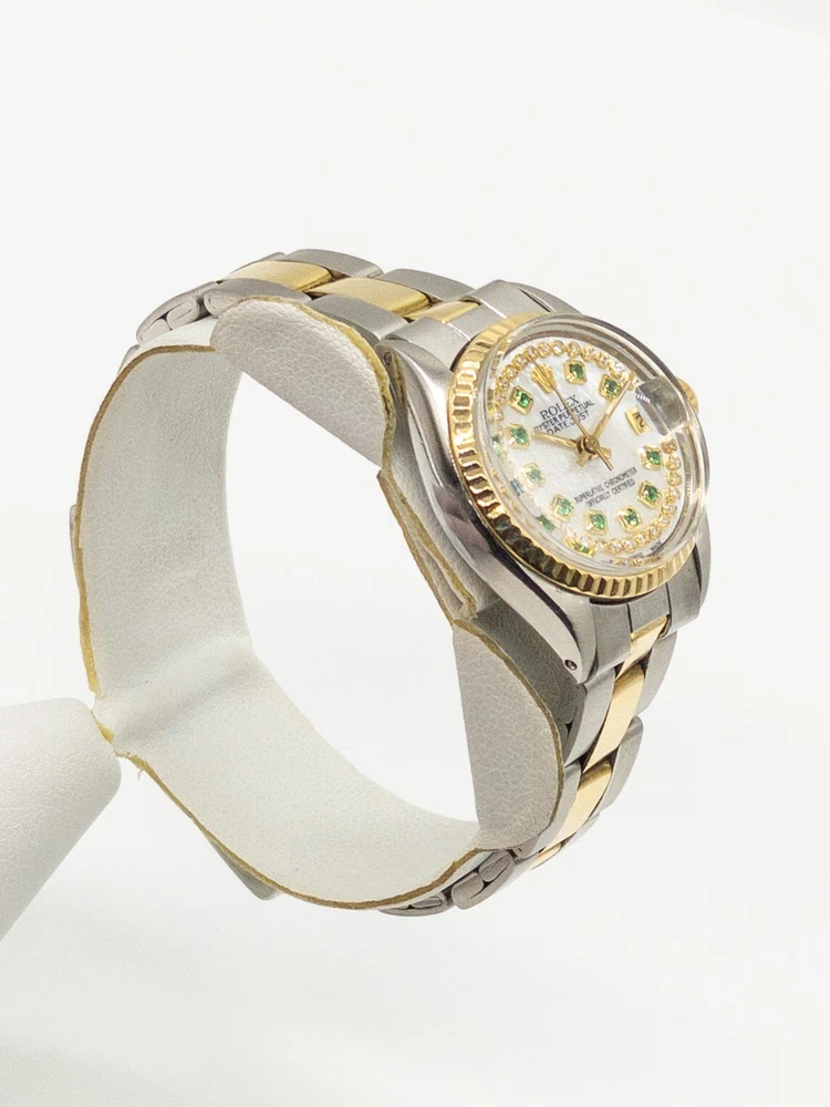 Item Description: Estate ROLEX Datejust Ladies Watch. Solid 18k Yellow Gold and Stainless Steel...mesmerizing piece and rare find. 6.6 inches long and just serviced and runs and keeps time. 26mm CASE and all ORIGINAL FACTORY ROLEX with only a CUSTOM DIAL in White MOTHER PEARL and Natural Emeralds and Diamonds. Just stunning and so pretty. Great two tone watch and rare Rolex find. This dial is so pretty and mesmerizing. Retail $10,000...GORGEOUS. Brand: Rolex Metal: Stainless Steel and 18k Yellow Gold Movement: AUTOMATIC - Just serviced and runs and keeps time with a 1 year warranty Gram Weight: 43.1g Powered by SixBit's eCommerce Solution