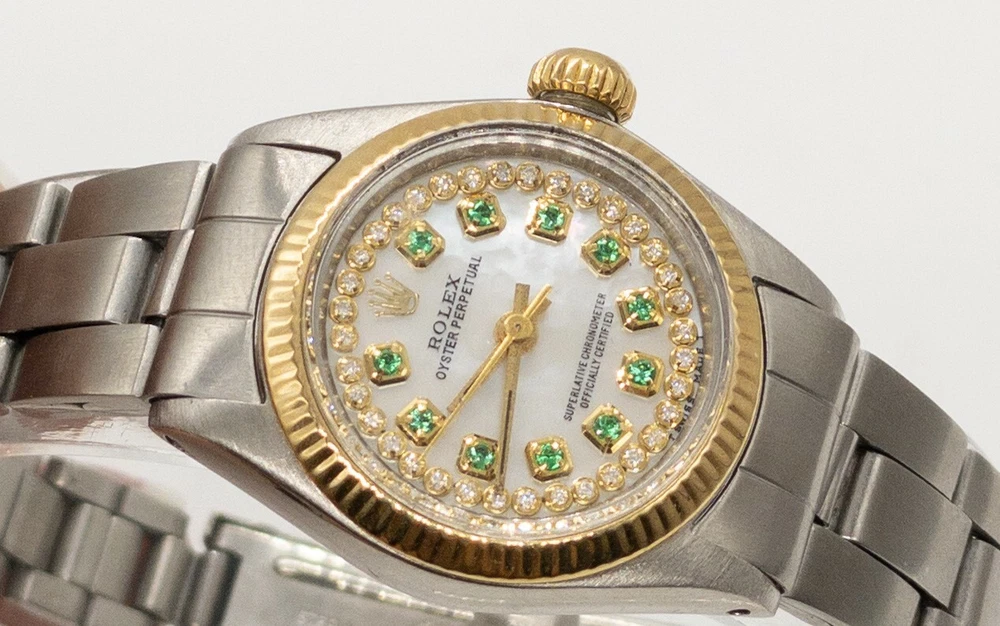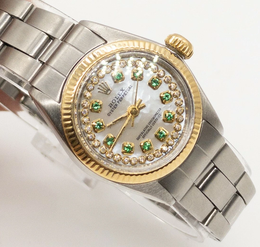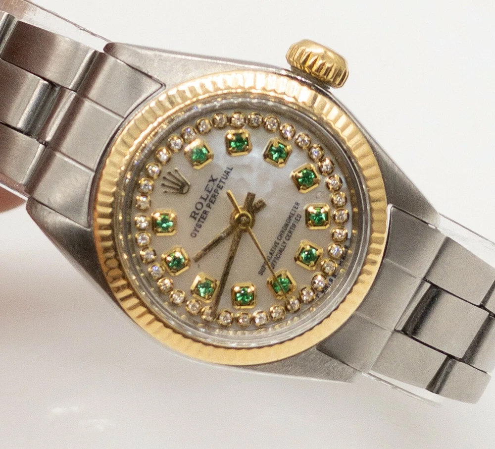 Item Description: 18k Yellow Gold and Stainless Steel. RARE Find and 100% FACTORY ROLEX in solid 18k Yellow Gold and Stainless Steel. This piece has a solid 18k Yellow gold crown and bezel and oyster bracelet...and this ROLEX is 6.6 inches long. The piece is all ROLEX with the original dial CUSTOMIZED into this White Mother of Pearl dial with Natural Diamonds and Emeralds. Just GORGEOUS. Retail $8000. One incredible Oyster Rolex and just serviced with a 1 year warranty and runs and keeps time. This is a service Rolex charges over $1000 for and you are getting this at no additional charge. Get a steal...this is an awesome timepiece. Brand: Rolex Metal: 18k Yellow Gold and Stainless Steel Movement: Automatic Gram Weight: 40.0 Powered by SixBit's eCommerce Solution