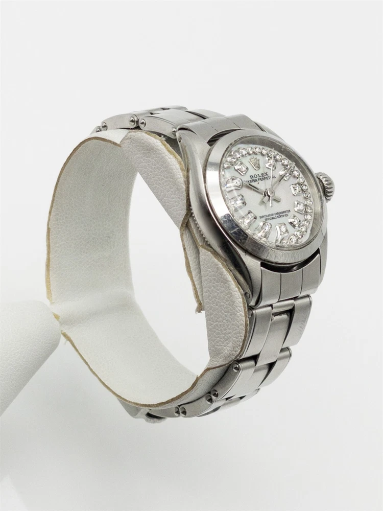 Brand: Rolex Description: Rolex WHITE Mother of Pearl Diamond Dial Oyster and so nice. Great looking watch and so clean and stunning. 100% FACTORY ROLEX with the original dial custom updated into this WHITE MOP Natural TWO ROW Diamond DIAL that is mesmerizing. Retail $8000. NICE looking ladies watch and 6.6 inches long on the wrist. Just serviced with a 1 year parts and labor warranty. This is a service that Rolex charges over $1000 for...you get it at no additional charge. Get a steal. WOW!!!! Metal: Stainless Steel Gram Weight: 38g Powered by SixBit's eCommerce Solution