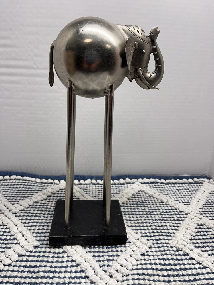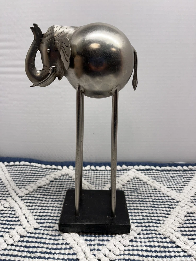 This stunning metal statue features a majestic elephant, standing at 13 inches tall and 5 inches long. The intricate details and abstract design make it a unique addition to any art collection. The statue is made from high-quality metal and features a gray color that will complement any decor. Perfect for animal or elephant lovers, this single-piece work is an original and licensed reproduction. The statue is perfect for display in any room, and its small size of up to 12 inches makes it easy to move around. Add this beautiful piece to your collection today!