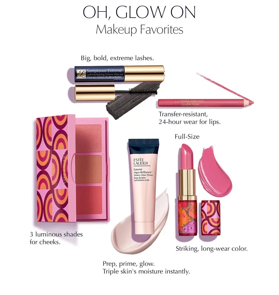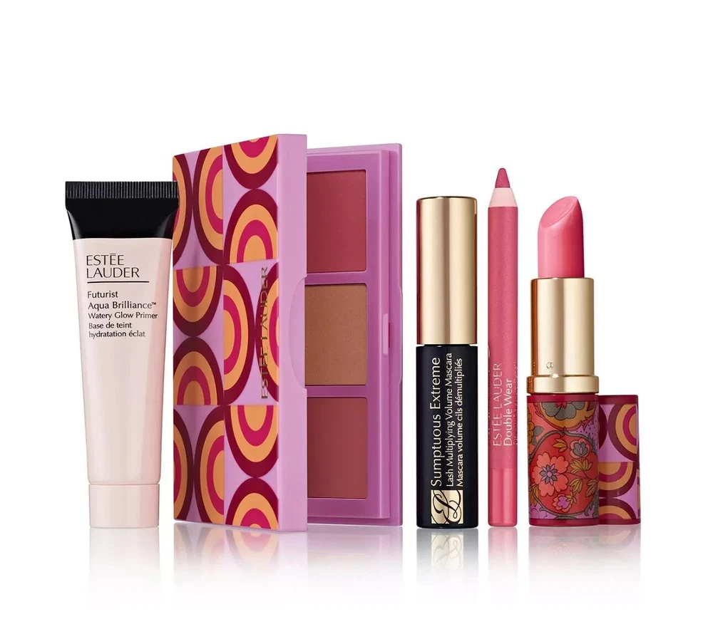 Macy's Fall 2024 Estee Lauder Bonus 6 Piece Makeup Set 1. Limited Edition Cheek Compact with Pure Color Envy Sculpting Blush in Rebellious Rose & Mauve Mystique and Bronze Goddess Powder Bronzer in .02 Medium - .46 oz. / 13.31 g. 2. Sumptuous Extreme Lash Multiplying Volume Mascara in Extreme Black - .1 oz. / 2.8 ml. 3. Futurist Aqua Brilliance Watery Glow Primer - .5 fl. oz. / 15 ml. 4. New Limited Edition Lipstick in Pink Obsession. 5. Double Wear 24H Stay-in-Place Lip Liner in Pink. 6. Exclusive Zippered Makeup Case with dual print - floral on one side & geometric on the other, approx 9"x6" Products Never Used, Sampled Or Opened!! Products included in Bonus Makeup Sets are usually GWP (Gift With Purchase) or Travel/Trial Size. They are not full size. One exception is the lipsticks included. They are usually full size tubes in plastic GWP cases. GWP/Travel/Trial Size products usually do not have seals. If they do, the seals usually do not adhere to the tube, jar, bottle or case. PLEASE CHECK OUT THE OTHER ITEMS I HAVE LISTED!!