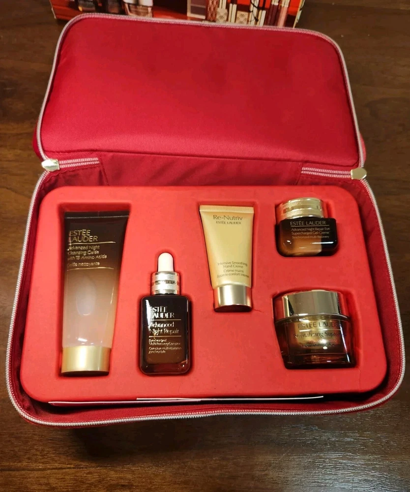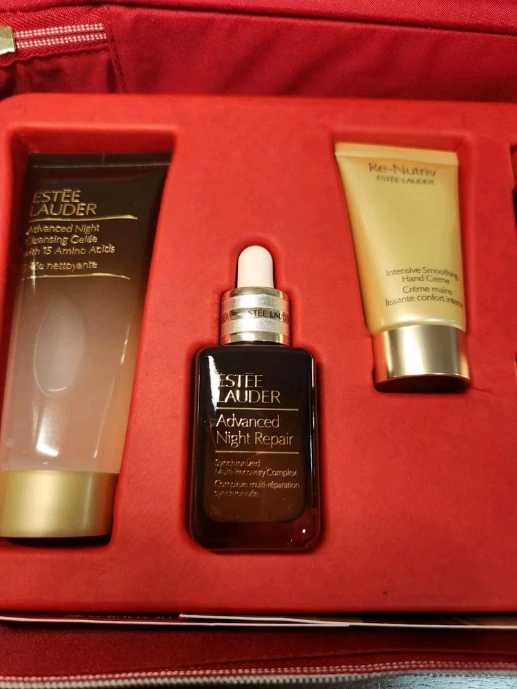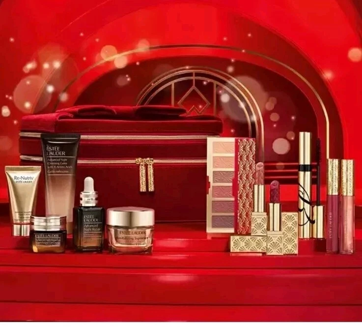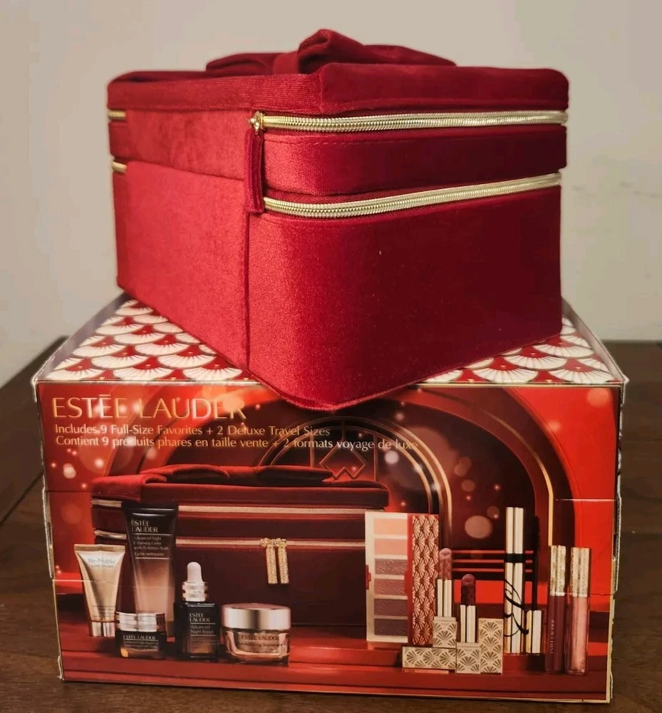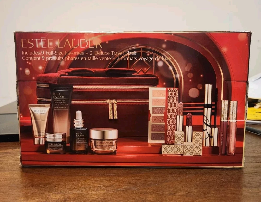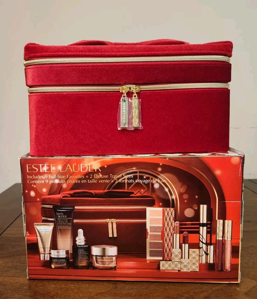 Brand:Estée LauderCoverage:FullColor:MulticolorNumber of Items in Set:12Makeup Shade:AssortedSet Includes:Re-Nutriv Intensive Smoothing Hand Cream 1oz, Advanced Night Cleansing Gel with 15 Amino Acids 2.5 oz, Advanced Night Repair Synchronized Multi-Recovery Complex 1 oz, Advanced Night Repair Eye Gel-Cream 0.5 oz, Revitalizing Supreme+ Youth Power Moisturizing Cream 1 oz, Sumptuous Extreme Lash Multiplying Volume Mascara 0.25 oz, Limited-Edition Trick of The Eyes Eyeshadow Palette 0.24 oz, Lipsticks in Red Velvet and Strictly Confidentia, Lip Glosses in Pink Persuasion and Beneath The Sheen, Train Cosmetics CaseUPC:887167737433gtin13:887167737433Formulation:Cream, Liquid