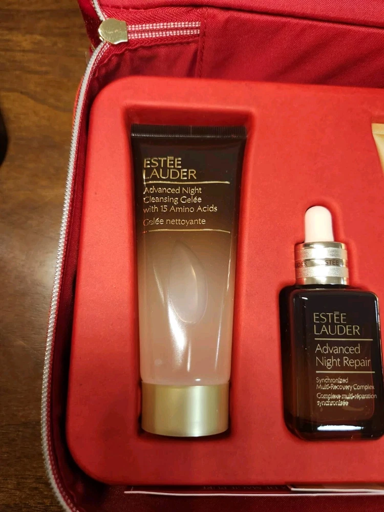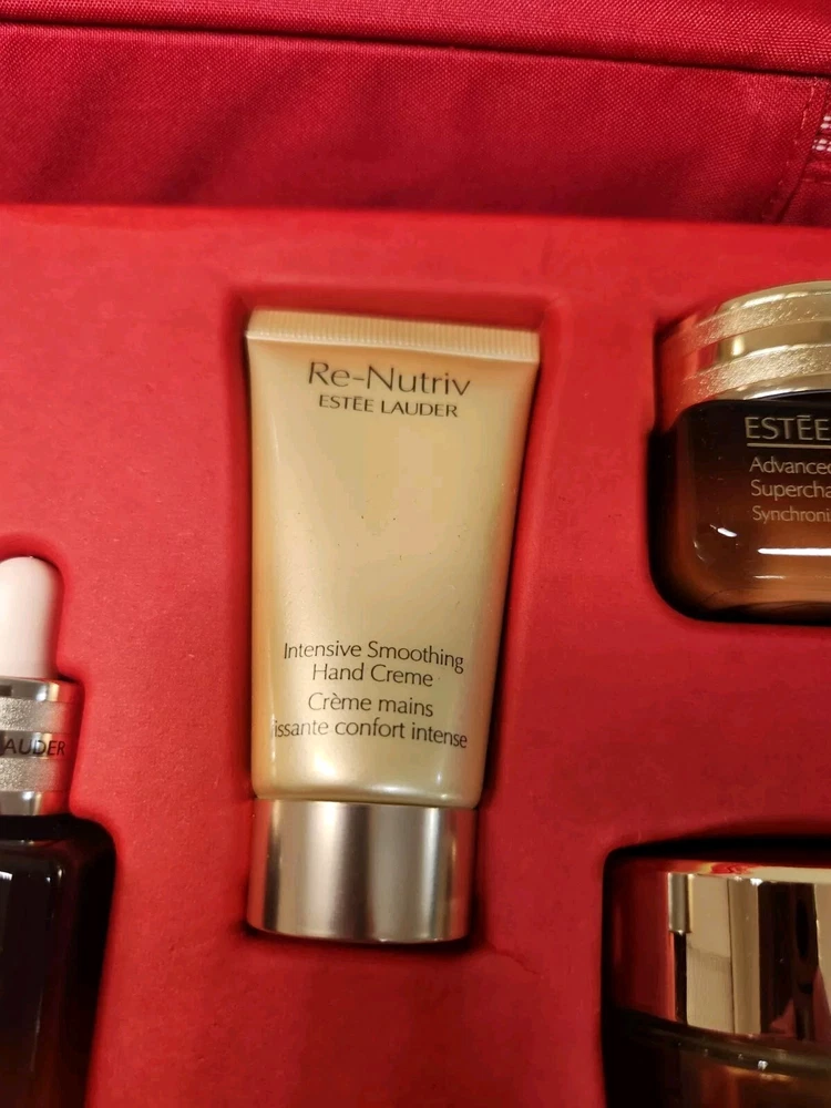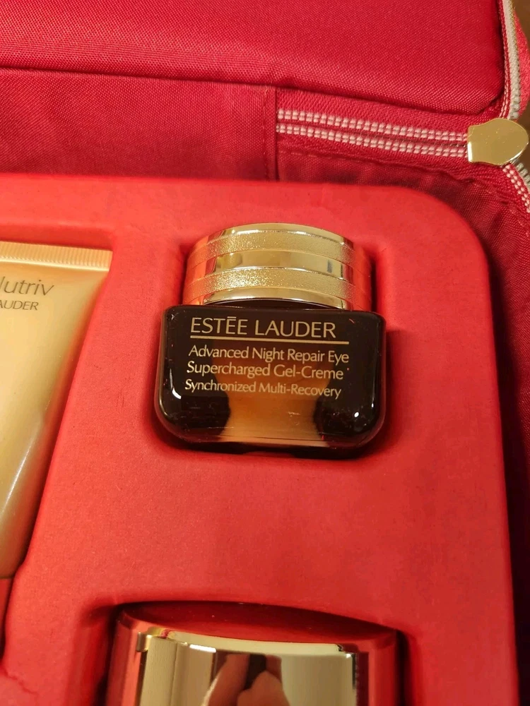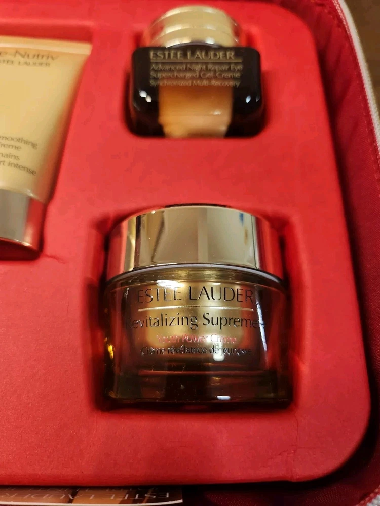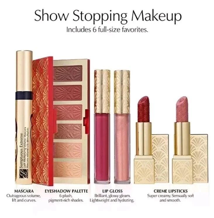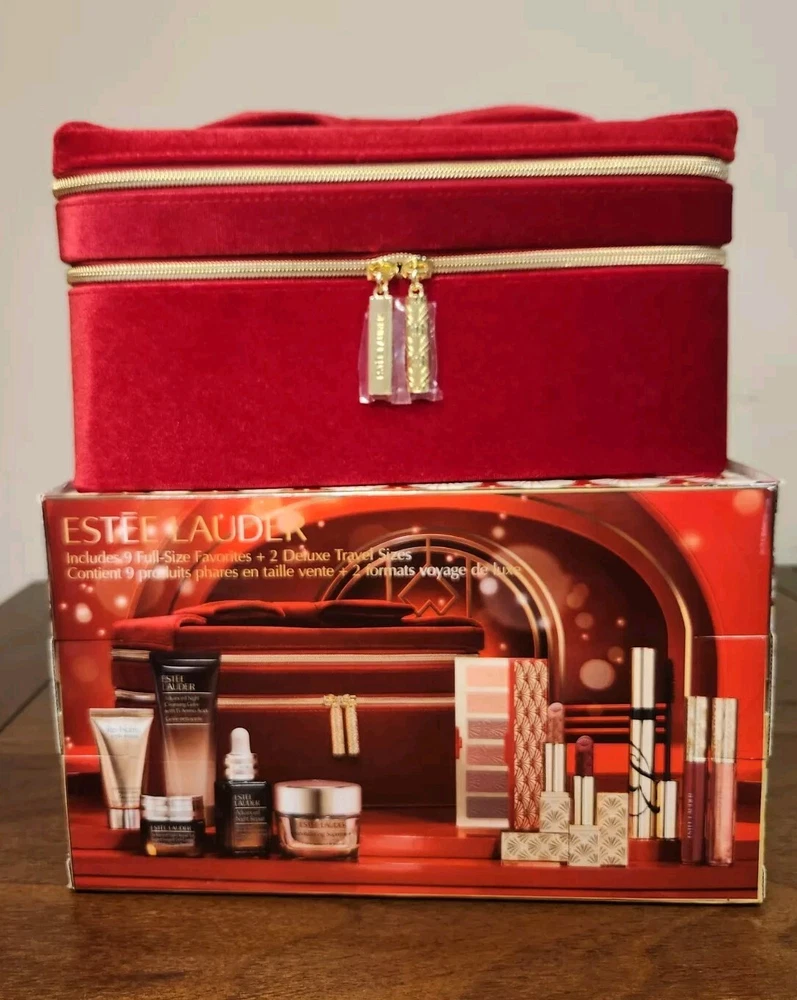 Brand:Estée LauderCoverage:FullColor:MulticolorNumber of Items in Set:12Makeup Shade:AssortedSet Includes:Re-Nutriv Intensive Smoothing Hand Cream 1oz, Advanced Night Cleansing Gel with 15 Amino Acids 2.5 oz, Advanced Night Repair Synchronized Multi-Recovery Complex 1 oz, Advanced Night Repair Eye Gel-Cream 0.5 oz, Revitalizing Supreme+ Youth Power Moisturizing Cream 1 oz, Sumptuous Extreme Lash Multiplying Volume Mascara 0.25 oz, Limited-Edition Trick of The Eyes Eyeshadow Palette 0.24 oz, Lipsticks in Red Velvet and Strictly Confidentia, Lip Glosses in Pink Persuasion and Beneath The Sheen, Train Cosmetics CaseUPC:887167737433gtin13:887167737433Formulation:Cream, Liquid