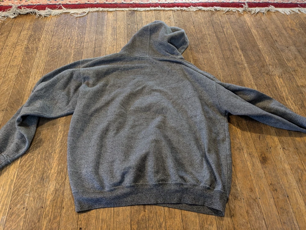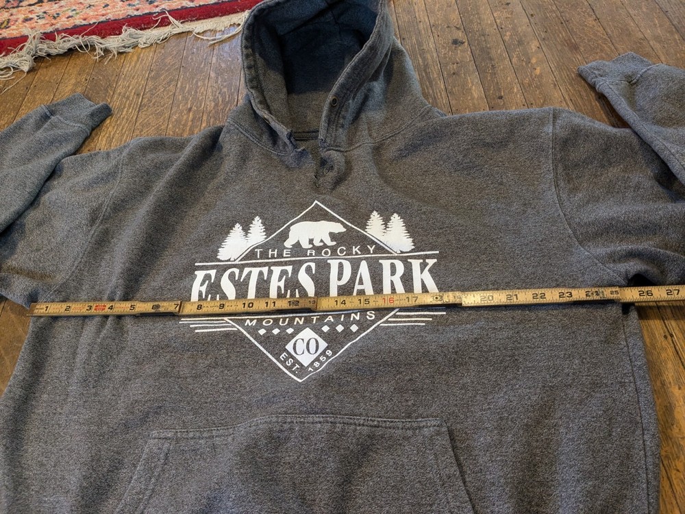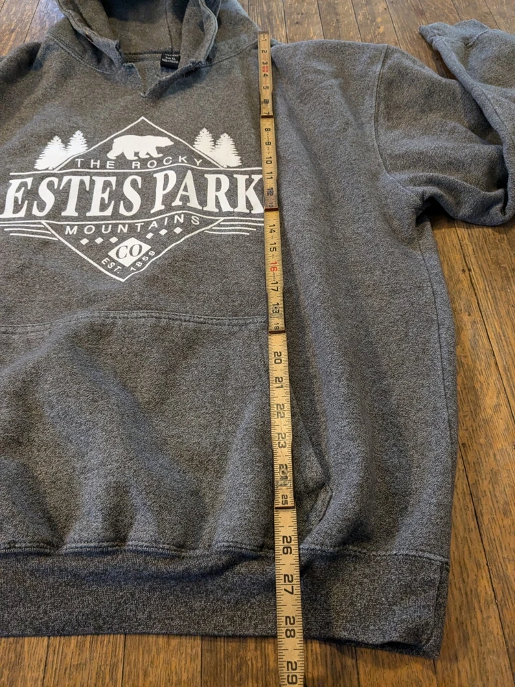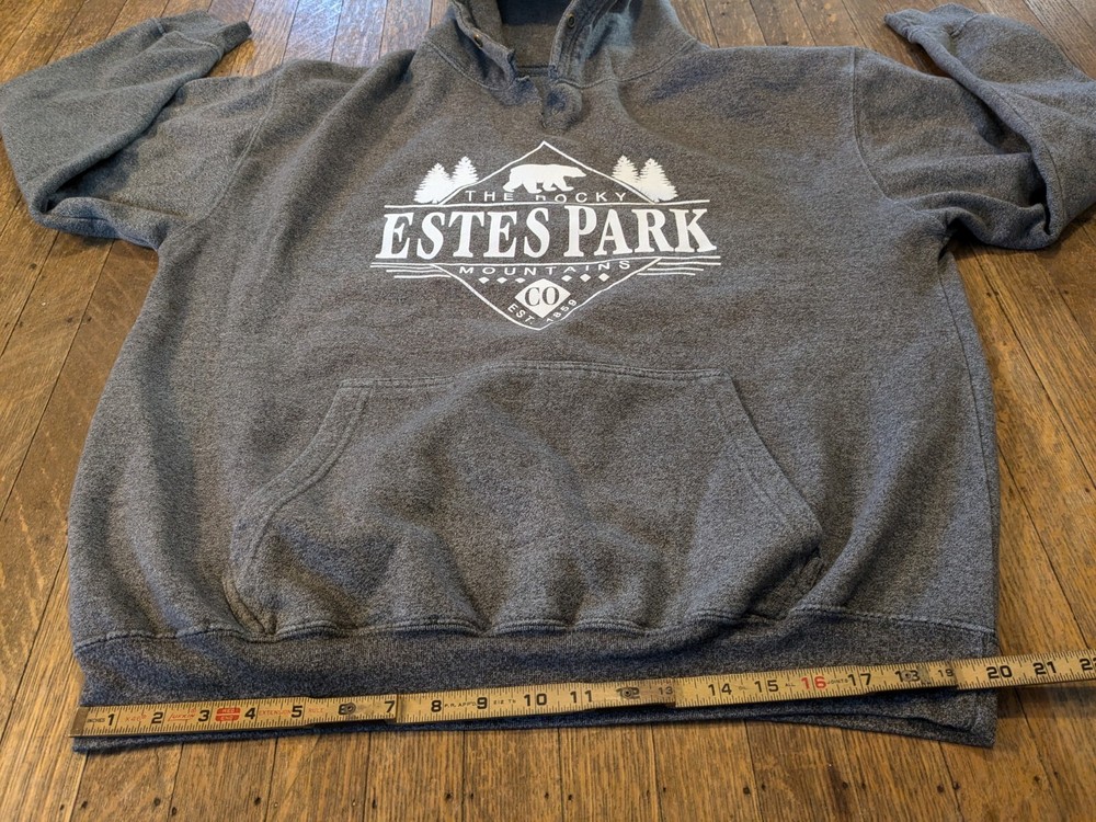 Please see photos and ask if you have any questions. The only thing about the hoodie is the drawstring is missing and I intentionally ripped it just below where the drawstring is. I don't have to draw string anymore but I know you can get one if desired. Please ask if you have any questions. The toiletry bag isn't very good condition. I have photos to showcase this. This is a Men's Hoodie in size XL, featuring Long Sleeves and a Hood, in Charcoal Gray color with a graphic print logo of "Estes Park Colorado". It is a pullover style hoodie from the brand Colorado, with pockets. It is suitable for winter, fall, and spring seasons. Additionally, the product comes with a blue Gap toiletry bag.