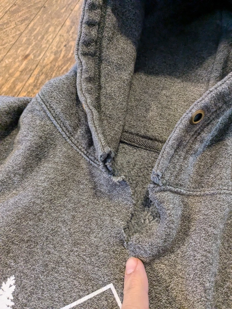 This hoodie is super comfy and perfect for chilly days—love the soft fabric and cool Estes Park graphic! The missing drawstring doesn’t bother me, and the slight rip is barely noticeable. The included toiletry bag has seen better days, but for the price, it’s a great deal. Ideal for casual wear or outdoor trips!