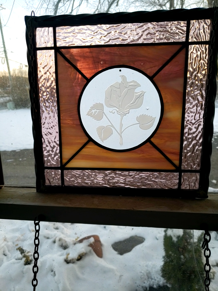 This pretty little panel would look great in any window. The center piece rose is etched on both sides of the glass which gives it more depth. The purple, pink, amber and white glass mixture surrounds the etched rose. The boarder glass is a cathedral mauve ripple glass. Foiling is the method used to make this piece, also known as Tiffany Style. The solder is patinaed with a pewter black, which gives it a softer look than the hard black usually used. I finished it with a twisted lead boarder all ready to hang with 2 chains. This panel Measures 11” x 11” The panel comes with a chain one for the right and one for the left side. It is ideal to hang panels with the chains going straight up so there is no pressure on the panel. Take a Break from the Ordinary A little about me and my passion.......My stained Glass business, Glass Orchid Studio, has been in business for over 25 years. Before that I was into antiques and Jewelry. This is why there such a variety on my page. We are located outside of Middletown DE. and do custom work. You are welcome to reach out if you want that special piece made.