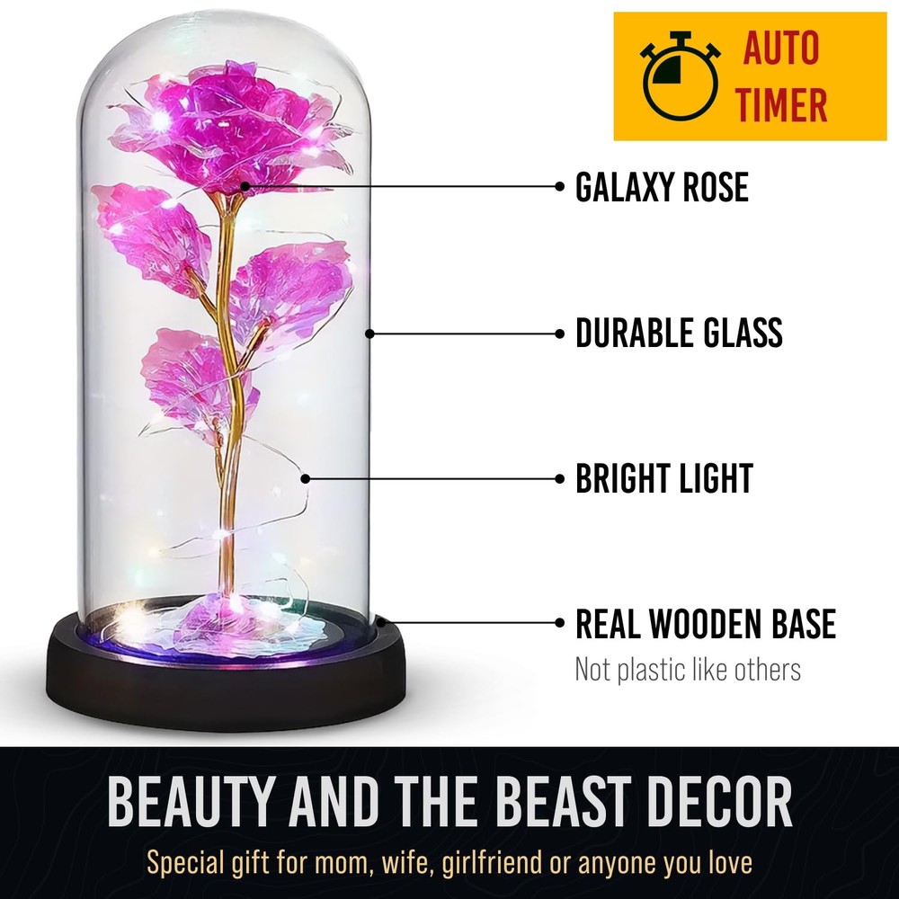 Galaxy Rose - Pink Versatile Gift for All Occasions - Whether it's for your wife, girlfriend, mom, or grandma, this rose is ideal for Mother's Day, housewarmings, or just to say "I love you." A heartfelt gift for women of all ages. COMES IN A GORGEOUS GIFT-READY BOX: This rose dome is beautifully packaged in a stunning gift box. It’s an amazing dried flower gift for your loved ones, perfect for any occasion. GIFTS FOR WOMEN: An enchanting and thoughtful choice for the special women in your life, this gift is perfect for Christmas and beyond. Its beautiful design and meaningful symbolism are sure to bring joy and love to any occasion. TIMER SAVES BATTERY: Only our rose dome comes with the convenient timer function. No need to turn it on or off manually, saving time and energy while preserving battery life. REAL LIFETIME WARRANTY: Enjoy peace of mind with a real lifetime warranty, ensuring your gift remains a cherished keepsake for years to come. This promise of quality reflects the care and thought behind this special gift.