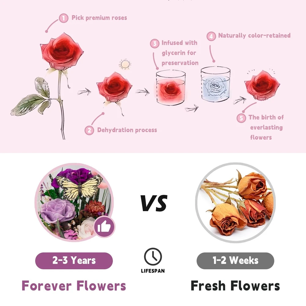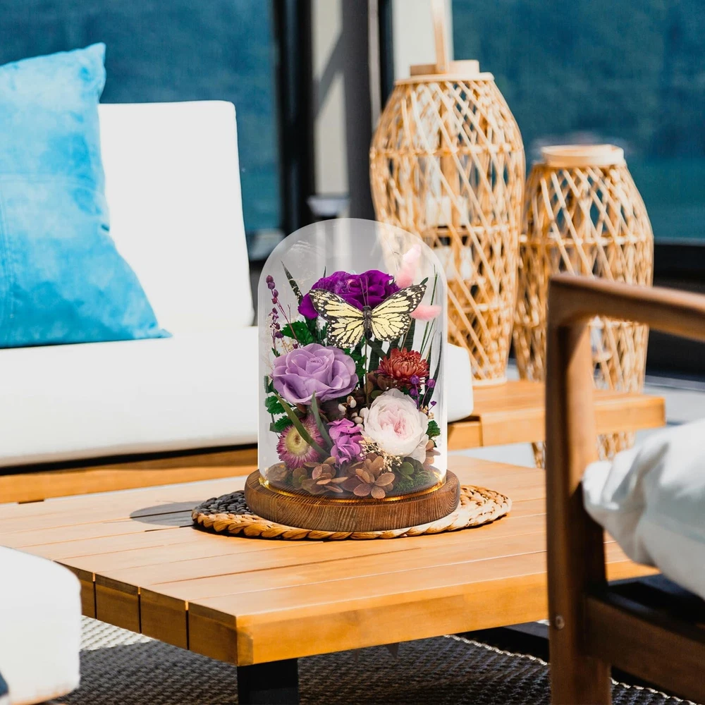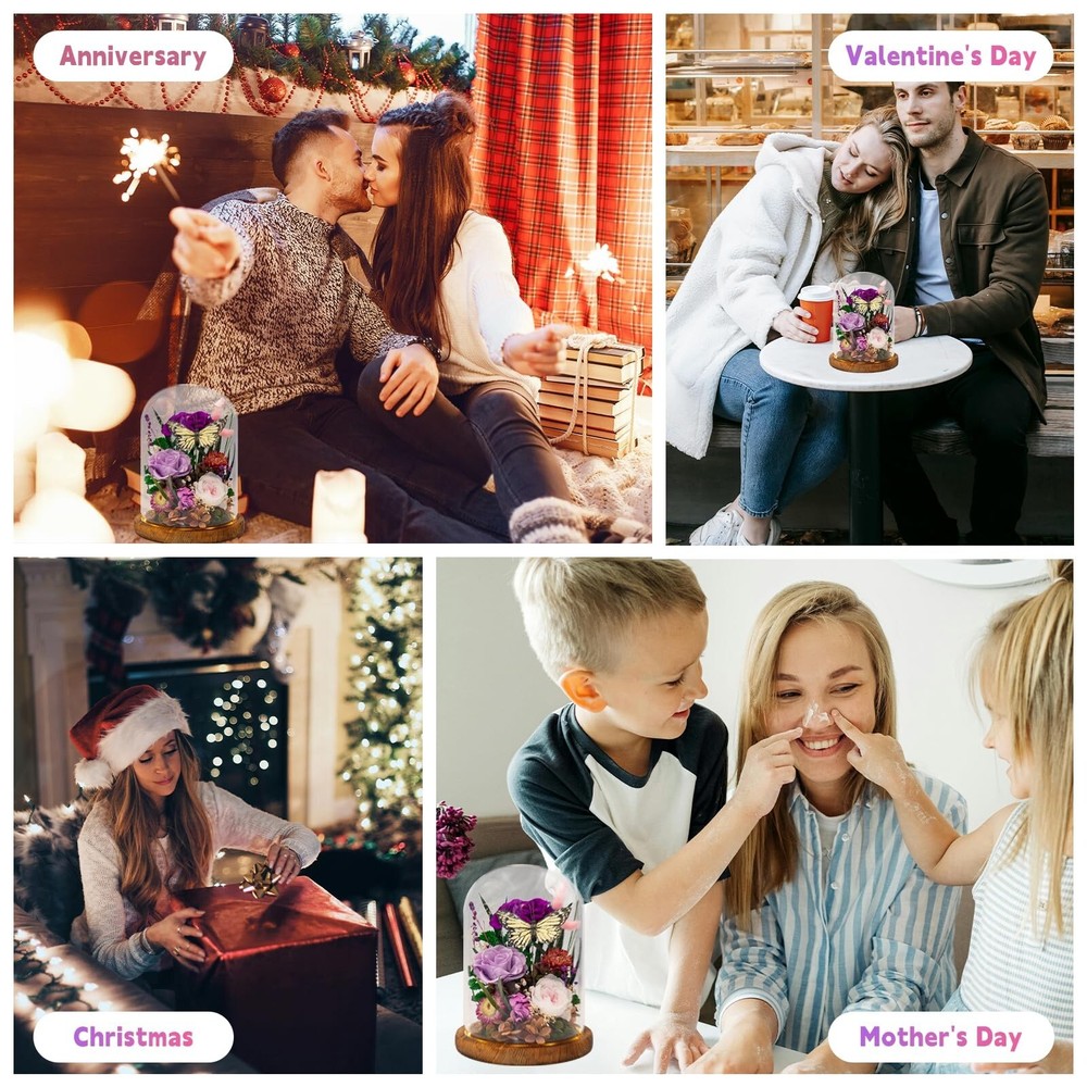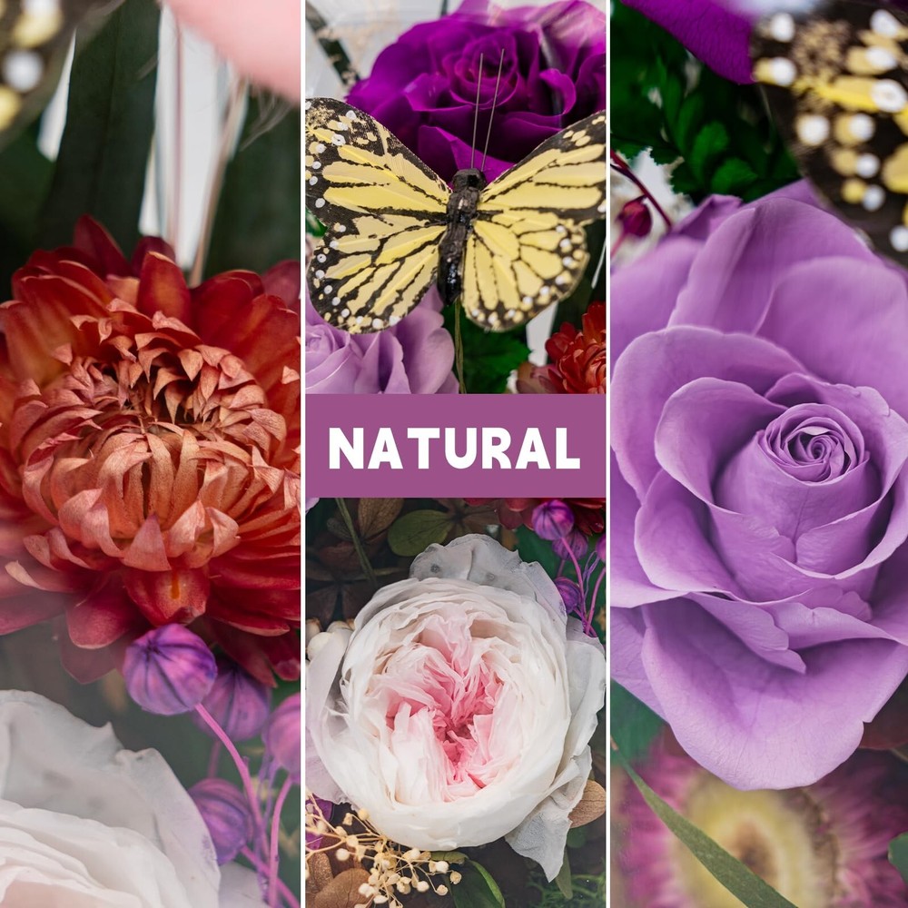 Eternal Flowers for Decoration: Preserved Flowers and Butterfly, Unique Forever Flowers Gift for Her BBF – Perfect Decorative Flowers for Home Décor - Flowers for Delivery Prime (Purple) Product Details Color: Purple Brand: HUACHIPLUS MPN: LX2CZ1TD2BT0 UPC: 663992443240 EAN: 0663992443240 Brand: HUACHIPLUS Plant or Animal Product Type: Rose Color: Purple Material: Wood Product Dimensions: 6.89"D x 6.89"W x 8.86"H Brand: HUACHIPLUS Plant or Animal Product Type: Rose Color: Purple Material: Wood Product Dimensions: 6.89"D x 6.89"W x 8.86"H Recommended Uses For Product: Valentine's Day, Anniversaries, Birthdays, Mother's Day, Bridal Bouquet home decor and other special events Specific Uses For Product: Home Decor Indoor/Outdoor Usage: Indoor Package Information: Terrarium Occasion: Valentine's Day Number of Items: 1 Special Feature: Lighted, Preserved Flowers, Decorative Butterfly, Glass Enclosure Included Components: Decorative Glass Vase, Feather-Crafted Butterfly, LED Light Item Package Quantity: 1 Shape: Round Manufacturer: HuaChiPlus UPC: 663992443240 Item Weight: 3.75 pounds Country of Origin: China Item model number: LX2CZ1TD2BT0 Date First Available: September 27, 2024 A Romantic Gift for Her, Light Her UpRoses symbolize love and warmth. A butterfly symbolizes luck, beauty, and the soul. The soft, bright, and vivid hues exude vibrancy, sweetness, and romance. Witnessing your loved one's happiness as she lights up is an experience of pure beauty. Our long lasting flowers preservation technique for fresh flowers ensures she can relish the unique, lifelike flowers for decoration Design, offering a perpetual reminder of being loved and cherished 100% Pure, Long Lasting Flowers with Feather-Crafted ButterflyEnclosed in a high-quality borosilicate glass vase, the delicate butterfly flutters among hand-selected, expertly preserved roses at their peak, presenting a scene of natural beauty. This rose in glass dome offers a lasting display of Love and Creativity. Illuminated by the warm LED light from the wooden base, the crystal-clear view ensures an inviting ambiance for years to come Memorable Moments, Cherished Spaces, Forever FlowersAn elegant and intimate gift for her, perfect for Valentine's Day, Anniversaries, Birthdays, Mother's Day, housewarmings, and other special occasions. The exquisite and elegant gift box includes a greeting card, offering a personal touch for sharing your heartfelt sentiments with your girlfriend, wife, close female friend, or BFF, ensuring she feels cherished for a long time Natural Elegance, Inspiring Warmth and RomanceThis decorative flowers for home decor, accented with a cute Butterfly, effortlessly enhances any space with natural beauty, fostering an inviting atmosphere and cozy ambiance. Ideal for home decor, as a centerpiece, enhancing candlelight dinners, or a gentle bedroom glow, this forever flower symbolizes the timeless beauty of nature. Its eternal flowers for decoration offers perennial inspiration and elevates spirits in all living spaces No Watering Required, Low UpkeepThis decorative flowers for home decor, a long lasting real flowers arrangement accented with a vivid Butterfly, captures the enduring natural beauty of fresh flowers, eliminating the need for watering or pruning. The long lasting flowers offer a pristine appearance that ensures year-round beauty of flowers for decoration with low upkeep, seamlessly enhancing your Home Decor AttentionOur fake flowers in vase: preserved flower, butterfly home decor, and LED Lights, crafted with delicate natural elements. Each piece of preserved rose in glass dome is handcrafted, with slight variations that attest to its individuality. The dome of this preserved flower arrangement can be easily removed, making it convenient to place a necklace thing inside and express your unique sentiment. The LED light is powered by 3 AAA batteries (not included)