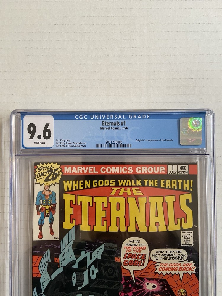 Eternals #1 (1976) – CGC 9.6 White Pages Origin & first appearance of the Eternals. Classic Jack Kirby cosmic storytelling and iconic cover art. High-grade Bronze Age key with strong long-term collector interest. Slab is clean and secure. Please review all photos carefully—they are part of the description. Ships fast, packed with care and protection to ensure safe delivery. Returns accepted if the item is returned in the same condition received. Thanks for looking and supporting a small collector-run shop. Kitty Kat Comics