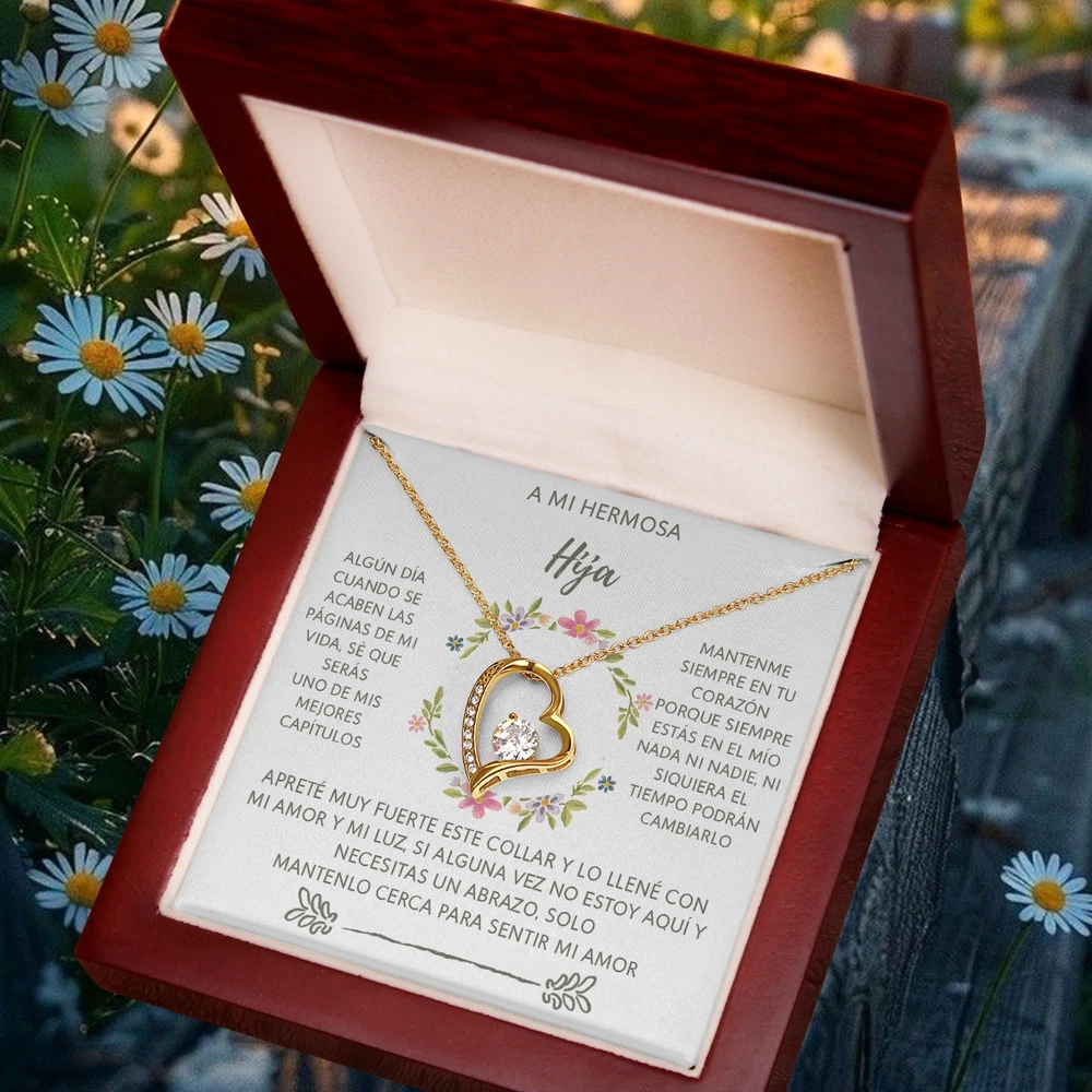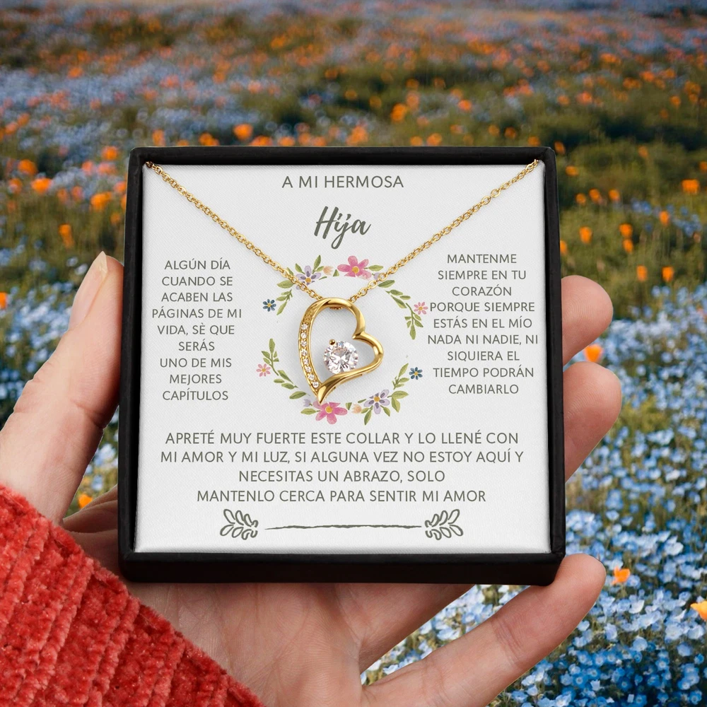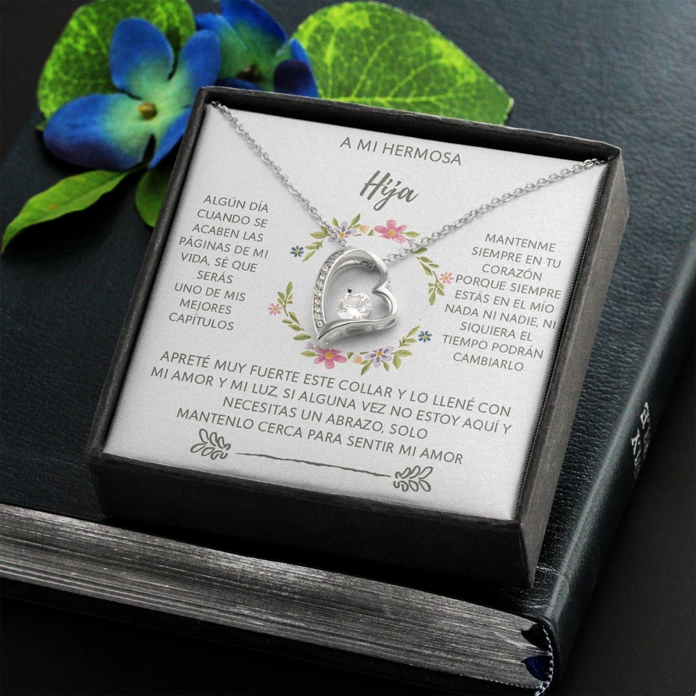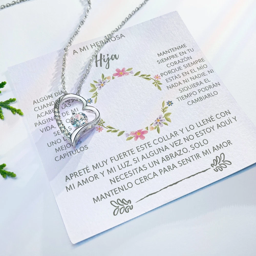 ✨(Descripción del producto): Celebra el lazo inquebrantable entre padre/madre e hija con este collar en forma de corazón, acompañado de un mensaje conmovedor que llegará directo al alma. Un regalo lleno de amor, esperanza y recuerdos para toda la vida. 💬 "Algún día cuando se acaben las páginas de mi vida, sé que serás uno de mis mejores capítulos…" Cada palabra está diseñada para recordarle cuánto significa para ti, incluso en los momentos en que no puedas estar físicamente presente. Este collar no es solo una joya, es un abrazo eterno envuelto en luz y cariño. 💖 Por qué es especial: – Mensaje emocional en español, perfecto para familias hispanohablantes – Diseño elegante y simbólico de corazón – Ideal para expresar amor eterno y conexión profunda 🎁 Ideal para: – Cumpleaños de hija – Regalo “solo porque sí” – Momentos difíciles o de distancia emocional – Celebrar el amor entre padres e hijas Hazle saber que siempre estarás con ella, no importa el tiempo ni la distancia.