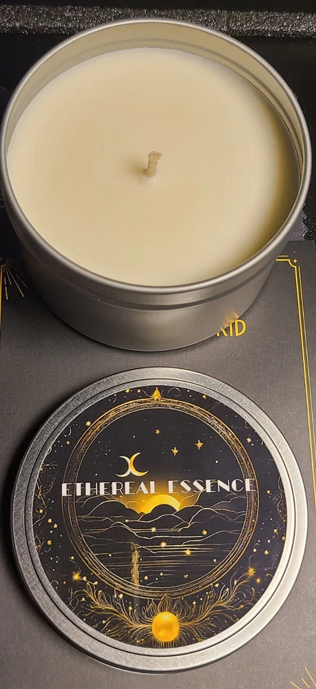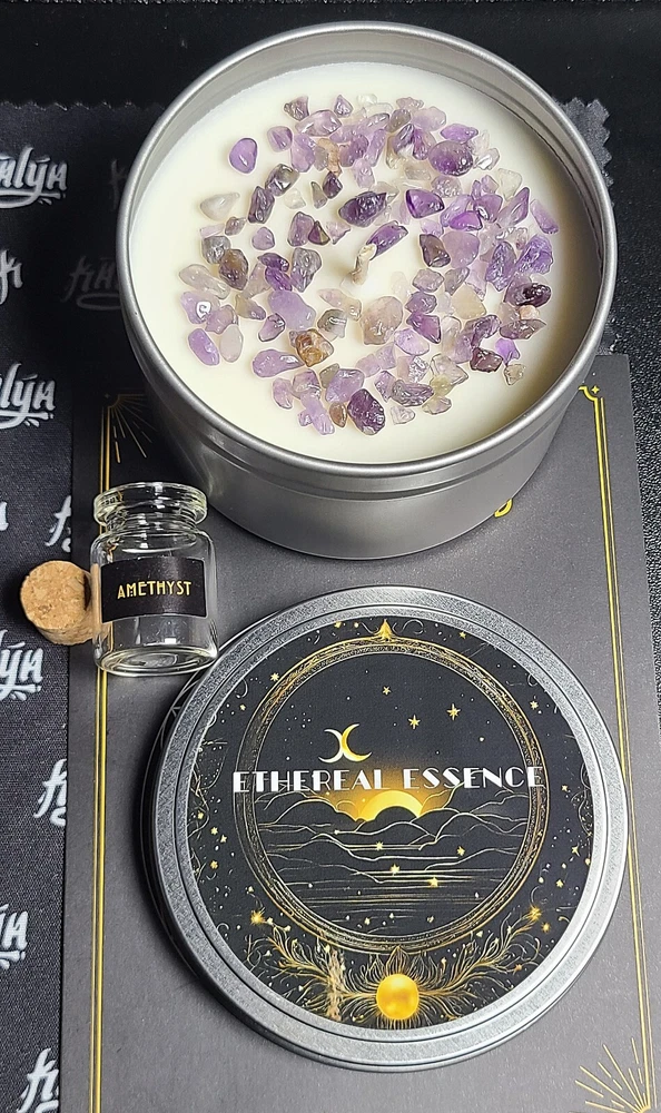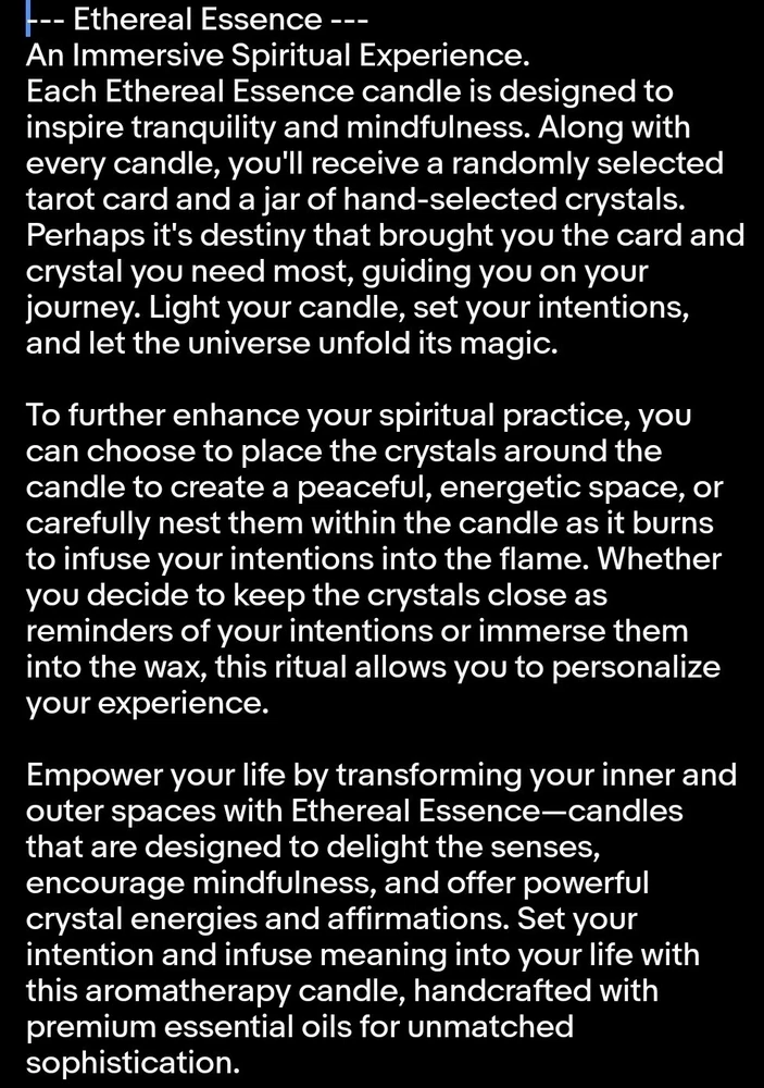 --- Ethereal Essence --- An Immersive Spiritual Experience. Each Ethereal Essence candle is designed to inspire tranquility and mindfulness. Along with every candle, you'll receive a randomly selected tarot card and a jar of hand-selected crystals. Perhaps it's destiny that brought you the card and crystal you need most, guiding you on your journey. Light your candle, set your intentions, and let the universe unfold its magic. To further enhance your spiritual practice, you can choose to place the crystals around the candle to create a peaceful, energetic space, or carefully nest them within the candle as it burns to infuse your intentions into the flame. Whether you decide to keep the crystals close as reminders of your intentions or immerse them into the wax, this ritual allows you to personalize your experience. Empower your life by transforming your inner and outer spaces with Ethereal Essence—candles that are designed to delight the senses, encourage mindfulness, and offer powerful crystal energies and affirmations. Set your intention and infuse meaning into your life with this aromatherapy candle, handcrafted with premium essential oils for unmatched sophistication. ●Azure Coast - Experience the opulence of the Côte d'Azur with Azure Coast fragrance oil. Turquoise waters glisten alongside the sun-kissed shores of the Mediterranean in a region that has catered to European nobility for centuries. Refreshing top notes of marine, apple, and succulent honeydew melon set the stage for the floral heart of jasmine and delicate lily of the valley. Sandalwood and musk base notes add a subtle sensuality to Azure Coast’s bon vivant vibe. This fragrance is infused with orange sweet natural essential oil. ● Fragrance Notes Marine, Honeydew Melon, Apple Lily of the Valley, Jasmine Sandalwood, Musk •Use candle as a powerful manifestation candle for intention setting, meditation, affirmation, self-care, and relaxation. --- Crystals/ Gemstones --- I strive to make acquaintance with the power of crystals a fun and empowering experience for those who are passionate about it as we are. By making it a safe experience for our customers to explore, experiment, and educate themselves on their path to spiritual and personal growth. •Each crystal/gemstone is unique. Created in different parts of the planet, some crystals and gems even took millions of years to form! Each crystal/gemstone is suitable for Meditation, Chakras, Crafts, and more. Did you know that crystals/gemstones tend to absorb the energies around them? --- Tarot Cards --- Welcome to the fascinating world of the Tarot, a mystical journey that has captivated seekers of wisdom for centuries! Tarot is more than just a tool for divination. It is a mirror to the soul, offering reflections on lifes journey, challenges, and opportunities. It serves as a guide for personal growth, self-understanding, and enlightenment. Whether you're new to the Tarot or looking to deepen your existing knowledge. We encourage you to approach each card with an open heart and mind, ready to discover the wisdom and insight that the Tarot has to offer. •Each card is a powerful divination tool to help you connect with your higher self and bring you guidance from cosmic sources. Each card can provide guidance for yourself or someone else, or to gain insight into a particular situation. •Major Arcana Characteristics : Represents significant life turning points, deep psychological states, and majorclife themes. •Minor Arcana Characteristics : Are Cups, Swords, Wands, Pentacles. Deals with the details of everyday life, challenges, and emotions. In each catagory(Cups, Swords, Wands, Pentacles) are one Page, Knight, Queen, and King. They typically represent individuals, or others personality traits, attitudes, or roles in life. •The cards use symbolism and imagery to offer self knowledge and self-enlightenment, providing individuals with insight, and understanding into their lives. •Each card includes the meaning in both upright and reversed positions. Also features zodiac, elemental names, and symbols. --- Each Ethereal Essence package includes: ●An 7 oz handcrafted candle infused with premium essential oils ●A randomly selected Tarot card to guide your intentions ●A glass jar filled with hand-selected crystals or minerals ●A sticker featuring the Tarot card design ●A mini Tarot card for additional guidance --- Thank You for Your Support! Thank you for being a part of the Ethereal Essence journey. Your support means the world to me as I embark on this new project, and I am incredibly grateful to share this experience with you. Each candle is crafted with care and intention, and I hope it brings light, peace, and positivity into your life. Your belief in this vision allows Ethereal Essence to thrive, and I couldn't do it without you. Wishing you much love and light on your journey.