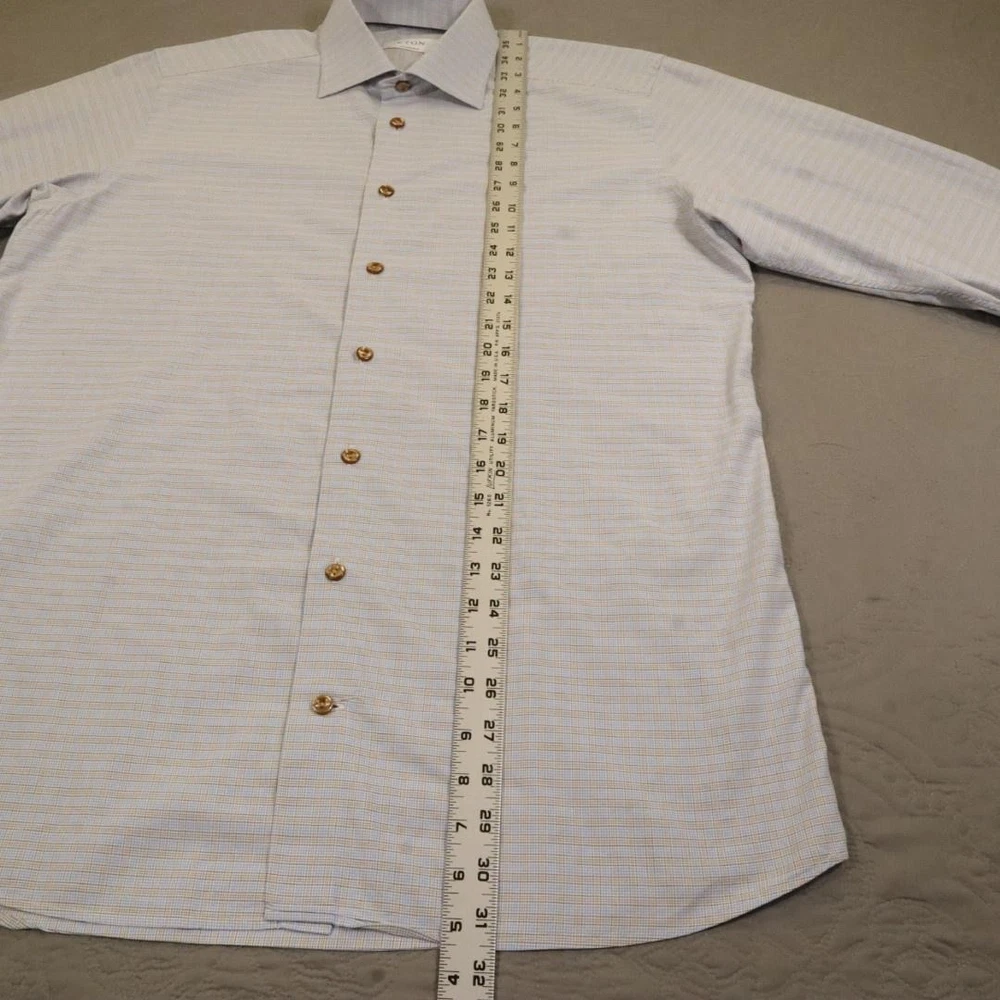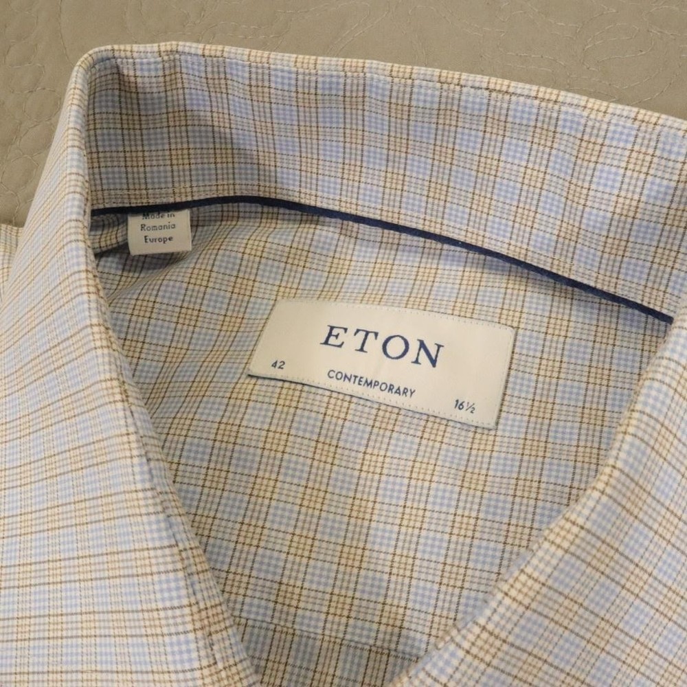 Brand: Eton Style: Mens long sleeve dress shirt in the Contemporary fit with spread collar and button front. Color/Pattern: Light blue base with tan and brown micro check plaid and contrasting brown buttons. Tag size: 42 / 16.5 neck, 34/35 sleeve; contemporary fit with a regular tailored silhouette. Material: 100% cotton twill