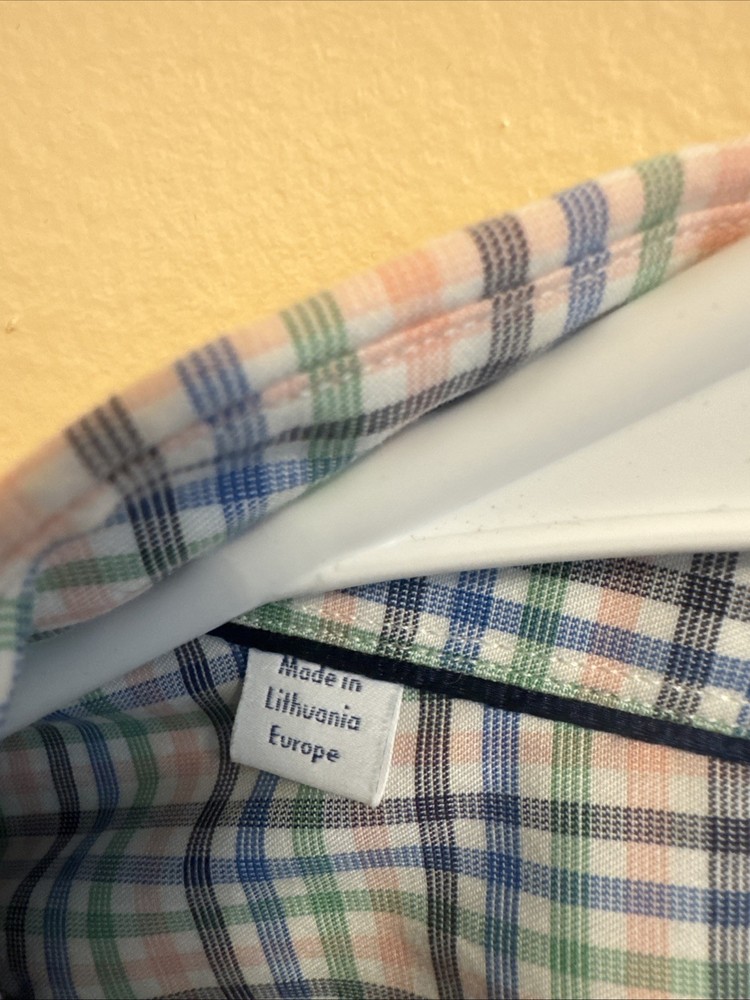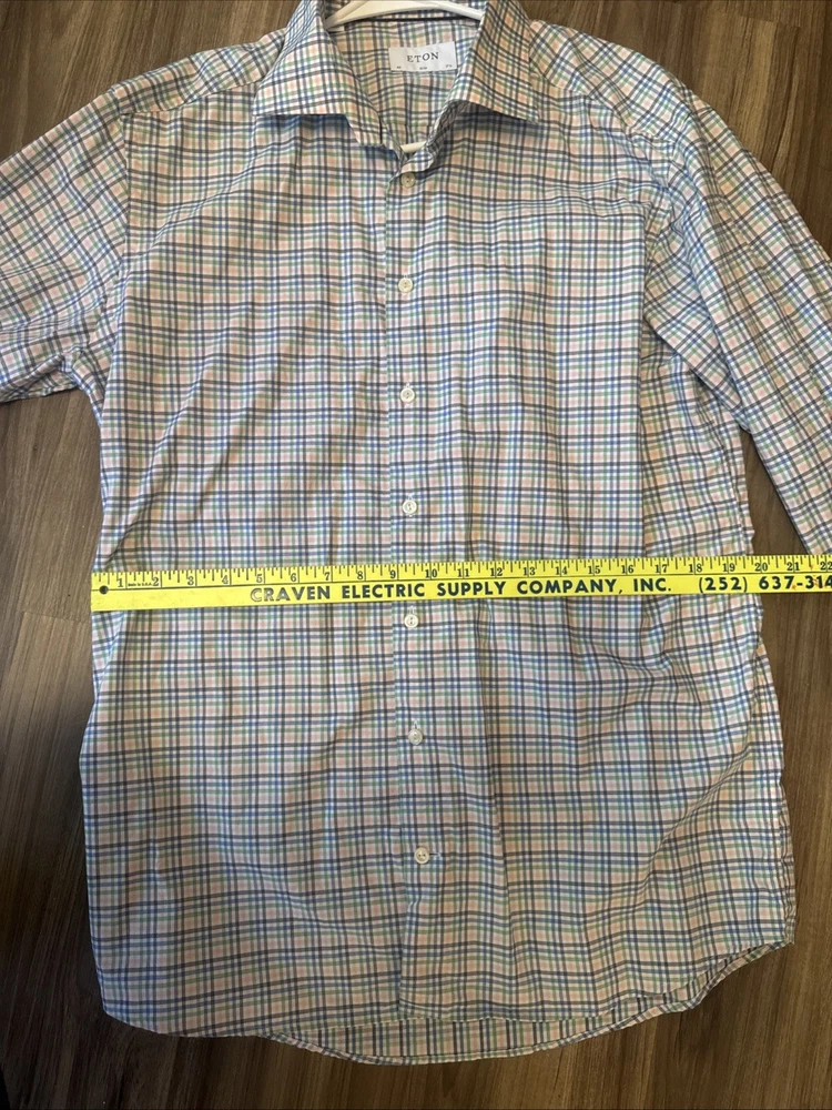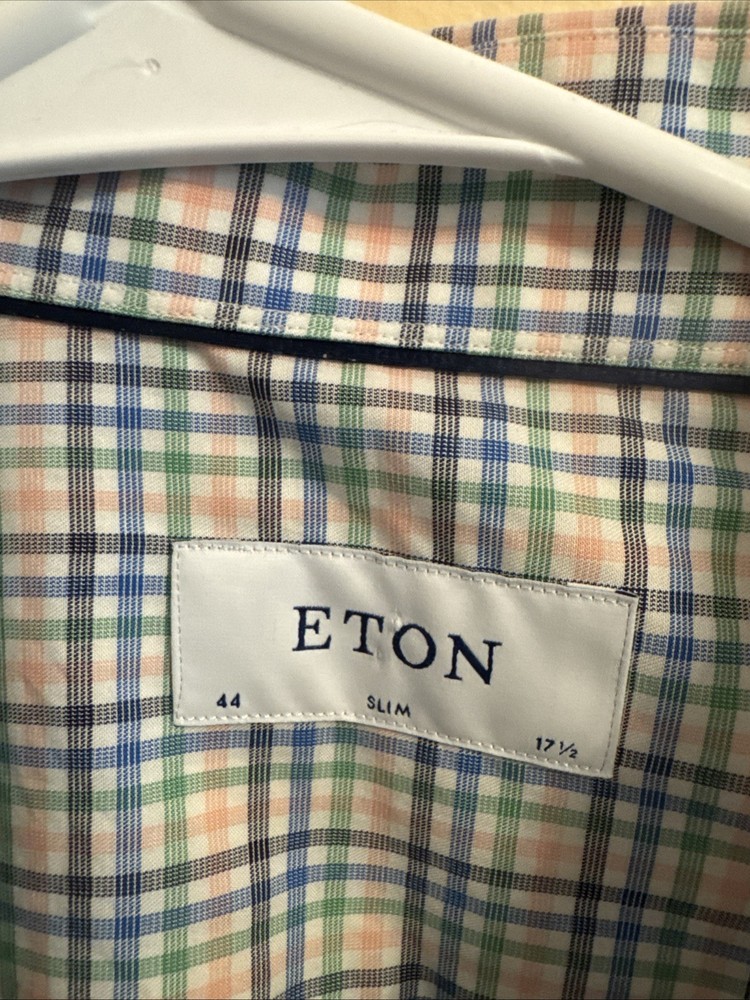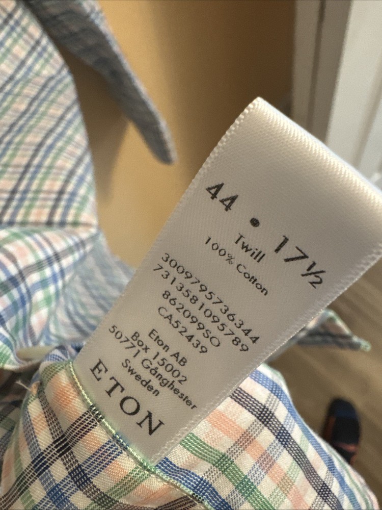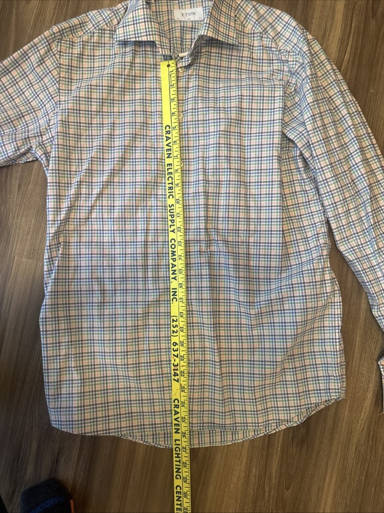 No signs of wear, beautiful colors The Eton of Sweden Contemporary Multi Color Plaid Check Dress Shirt is a stylish and versatile piece for men. Made from 100% cotton twill fabric, this slim-fit shirt features a collared neckline, long sleeves with a barrel cuff, and a button closure. The colorful plaid pattern adds a modern touch, perfect for various occasions such as travel, weddings, parties, casual wear, or business meetings. With its non-iron and wrinkle-resistant properties, this dress shirt is easy to care for and suitable for all seasons. Made in Estonia by the renowned brand Eton, this shirt offers quality and sophistication.