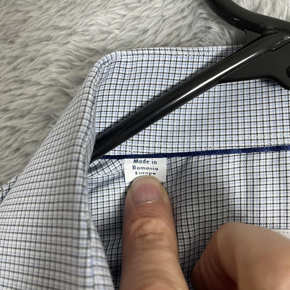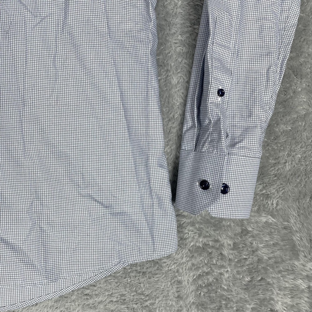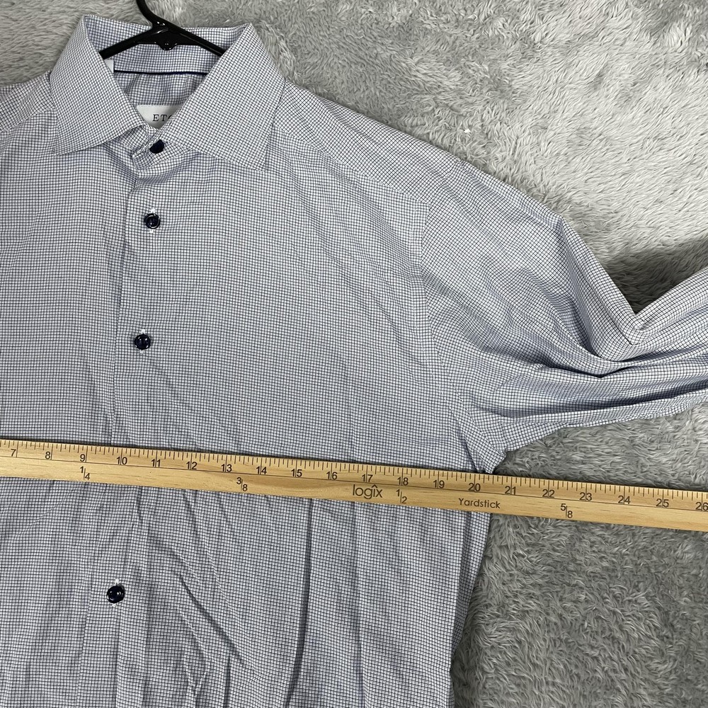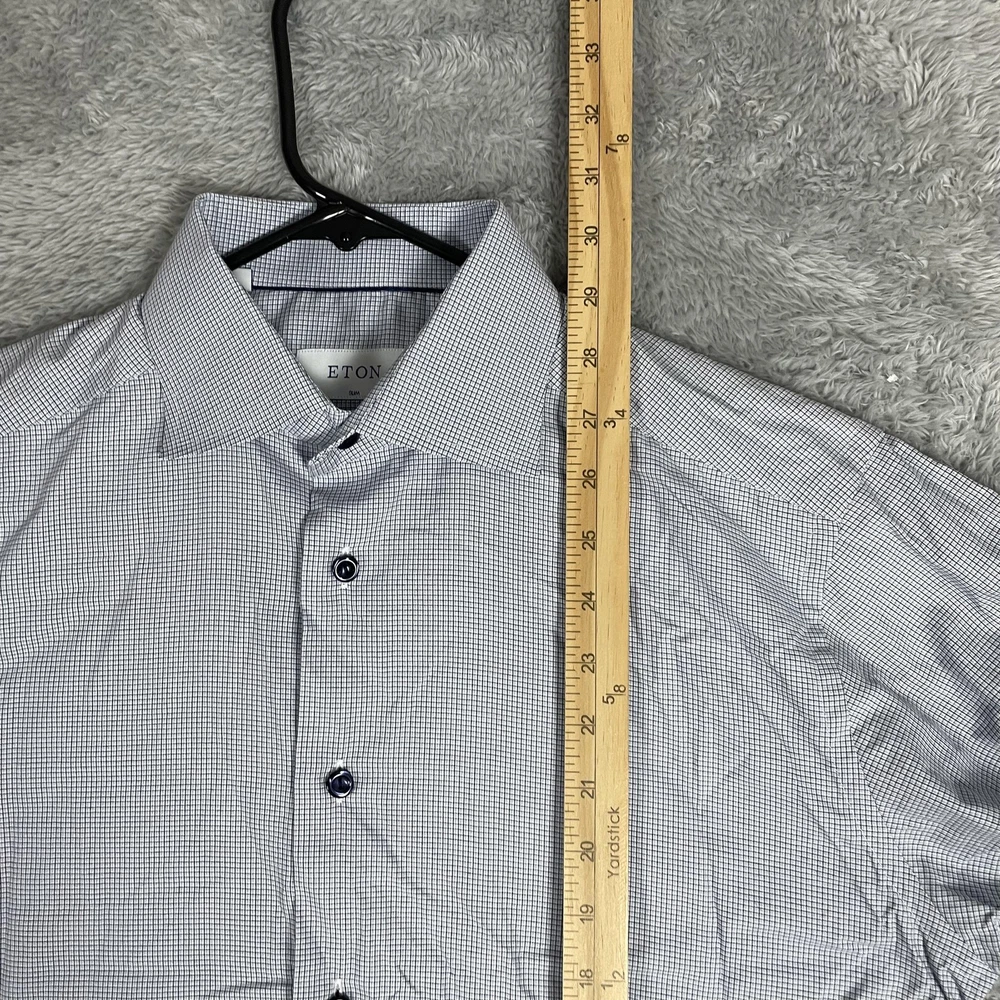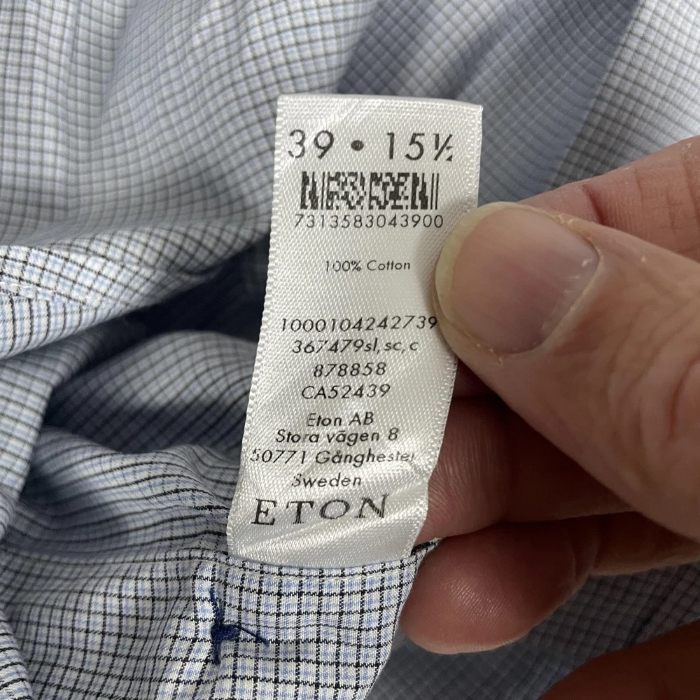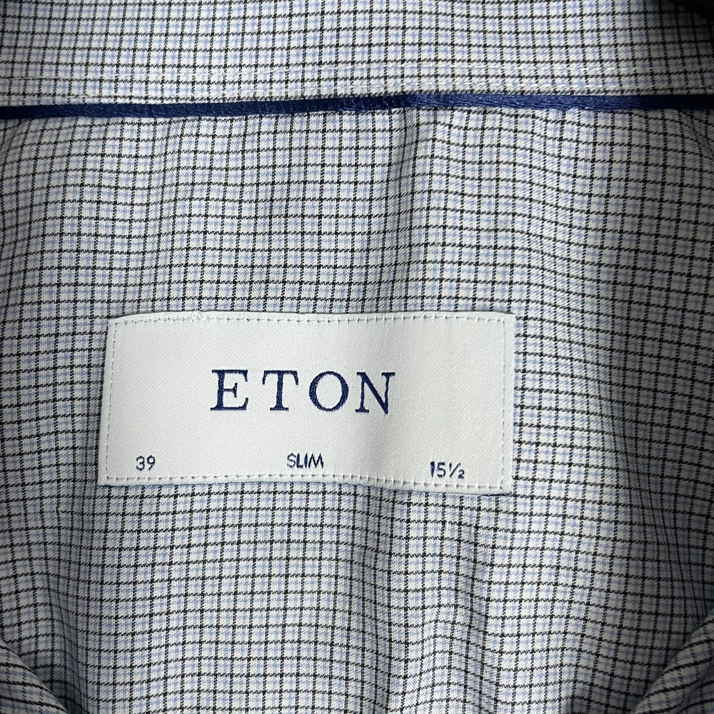 Eton Shirt Mens 15.5 Slim 39 Blue Micro Check Dress Button Up Long Sleeve Condition: Good, gently worn. No obvious stains, holes, or flaws. Some light wrinkling from storage—may need ironing before wearing. Features a sharp blue micro check pattern with spread collar and contrasting dark buttons for a refined business or dress attire look. Material: 100% cotton (see care label photo) Tag Size: 39 (15.5) Slim Fit Made in Romania, Europe Brand: Eton (as seen on neck tag and internal care labels) Style/Model: 1000104242739, 878858, CA52439 Color: Blue with micro check grid pattern Timeless style perfect for dress occasions, office wear, or professional settings