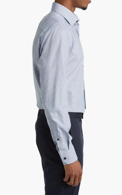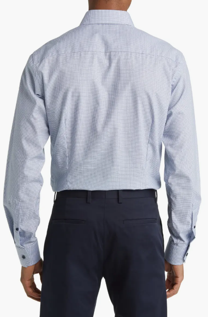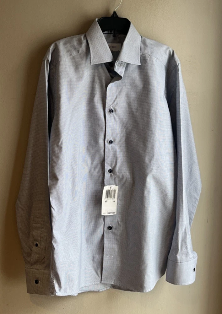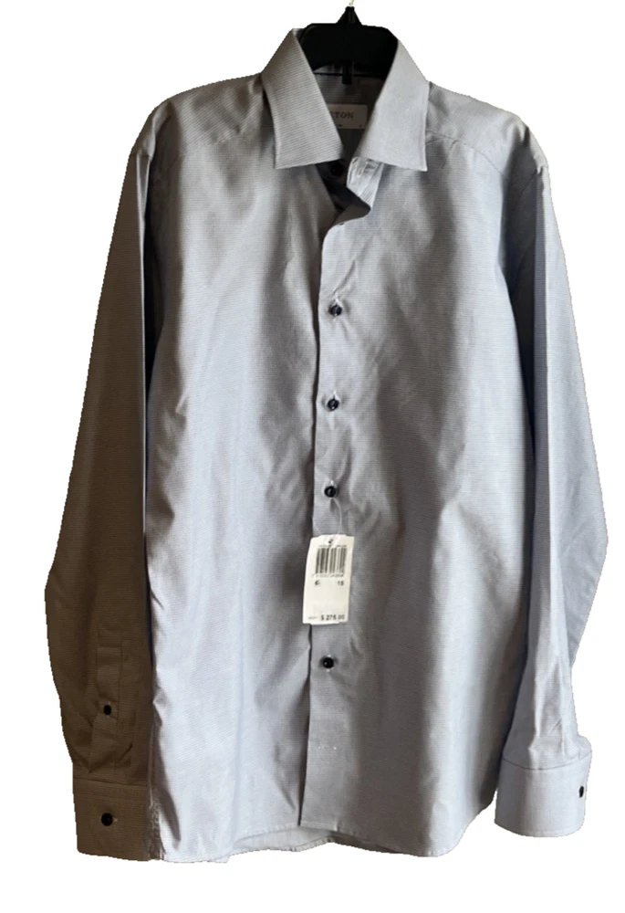 Eton men's Slim Fit Microcheck Dress Shirt size: 15 / 38 color: Blue Spread collar with permanent collar stays Convertible cuffs slim fit The Eton tag is removed - the Bloomingdales price tag is attached 100% cotton Machine washable retail $275 underarm to underarm 19.5" collar seam to bottom 30.5" R631