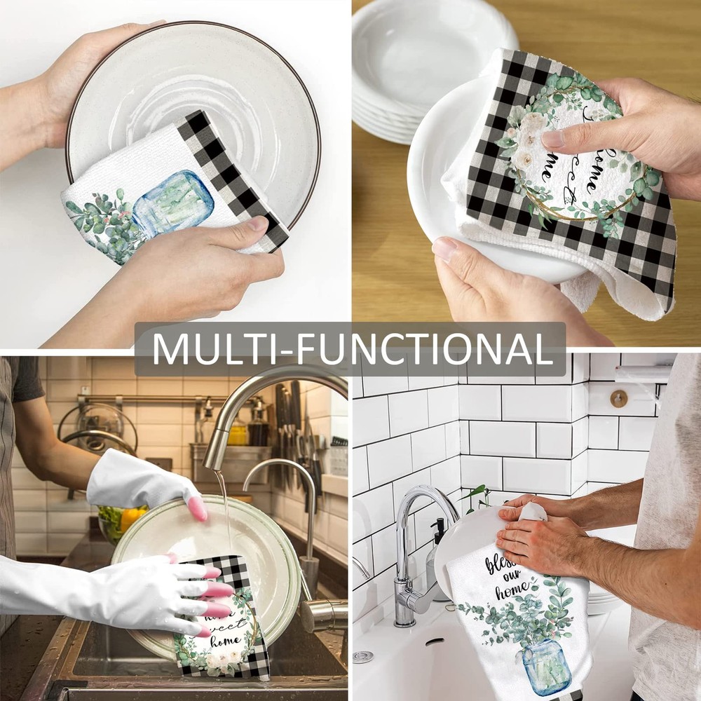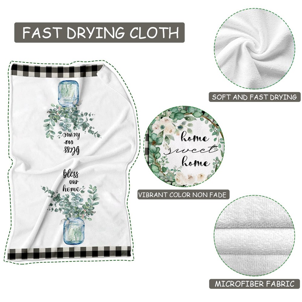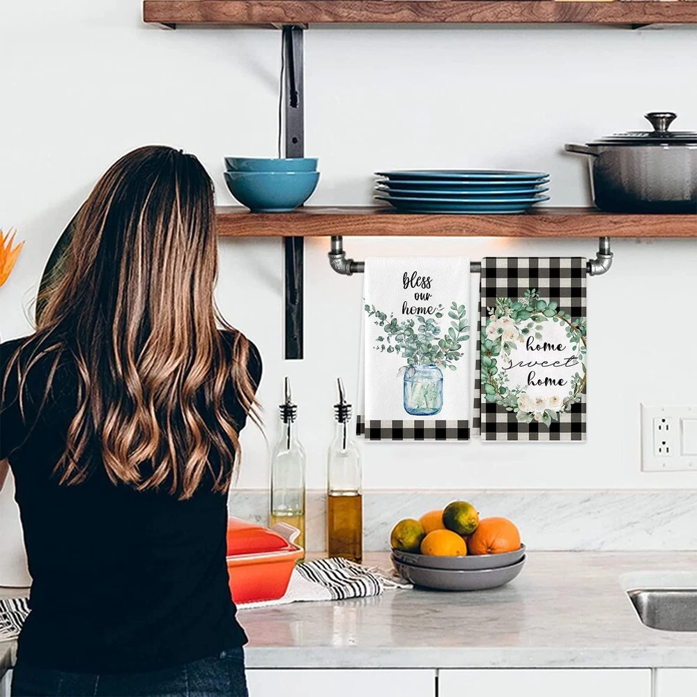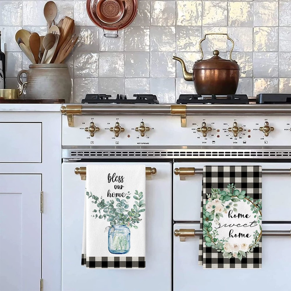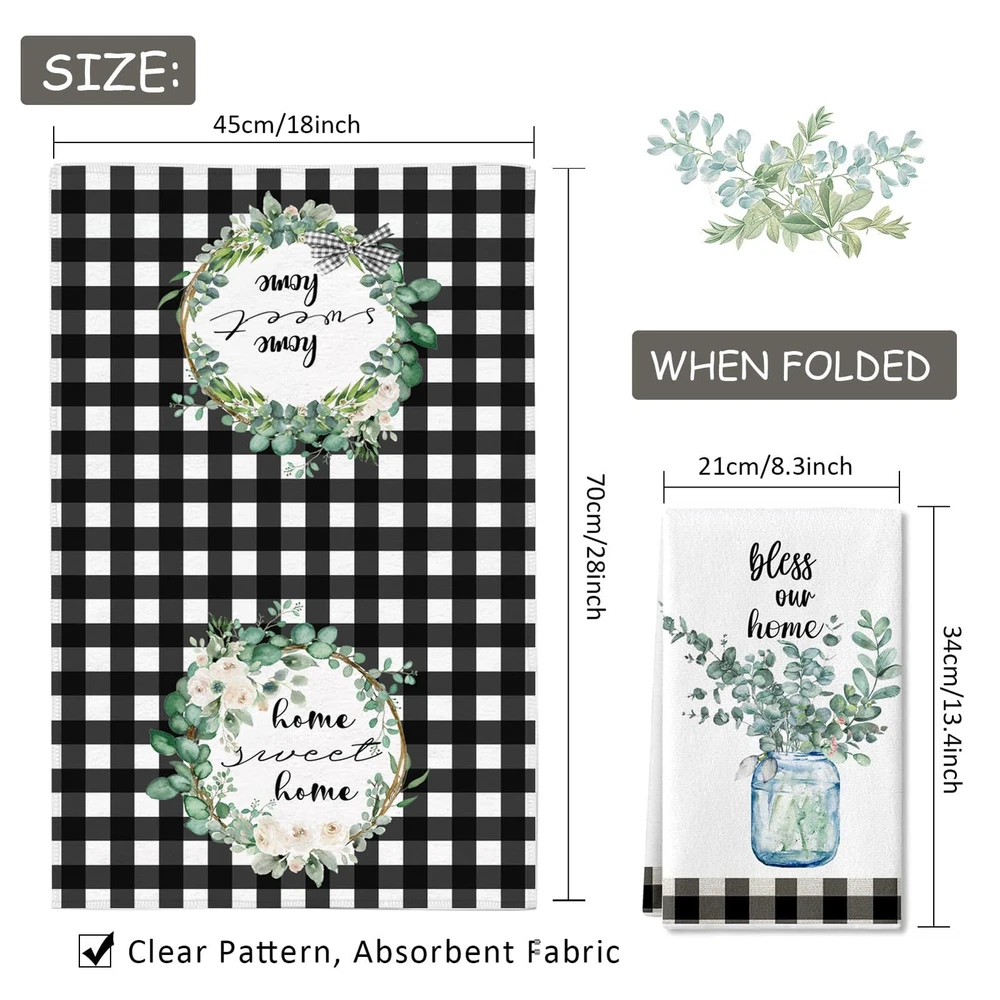 Ideal Present: Our beautiful eucalyptus leaves plaid kitchen dish towels are very suitable for the daily cleaning and drying of the kitchen and summer decorations. They can also be given to your friends and family as gifts to express their important love, care and blessings to mankind. ▶Product Information: -Product Name: Eucalyptus Leaves Plaid Dish Towels -Material: Polyester -Product Size:70cm*45Cm. -Packing Size: 25*10*1.5cm -Weight: 0.16kg ▶Package Includes: 2* Eucalyptus Leaves Kitchen Towels ▶Product Features: High absorbency: Eucalyptus dish towel has strong absorbency, enough to dry, clean and scrub dishes. It is very suitable for your daily work of drying and cleaning the kitchen. Unique and Design: printed with eucalyptus leaves vase, eucalyptus leaves wreath, home sweet home, bless our home and other fashionable, unique and cute patterns. It is the perfect kitchen gift for wife, mother, grandma, and hostess. Washing instructions: Wash our summer towels in cold water, hang to dry; machine washable. ▶Warm Reminder: -Manual measurement, there may be 1-2 cm deviation. -Due to the difference in light, angle and presentation, there may be chromatic aberration, please refer to the actual product, please understand Soft Material-- Eucalyptus leaves buffalo plaid dish towels are made of high-quality and durable microfiber, which can be machine-washed and dried. It is super soft and will not scratch your delicate bowls, plates, pots or pots and other tableware. High Absorbency-- Eucalyptus leaves kitchen dish towel has strong absorbency, enough to dry, clean and scrub dishes. It is very suitable for your daily work of drying and cleaning the kitchen. Size and Packaging-- Dish towel tea towel 18 X 28 inches / 45 cm X 70 cm, durable, including 2 pieces, very suitable for kitchen use. Unique Design-- Printed with eucalyptus leaves vase, eucalyptus leaves wreath, home sweet home, bless our home and other fashionable, unique and cute patterns. It is the perfect kitchen gift for wife, mother, grandma, and hostess. Wide Application Range-- This summer tea towel can be hung on the oven handle, countertop or towel rack, which is very suitable for kitchen, bathroom or home decoration. Our eucalyptus leaves wreath kitchen towels will add vitality to your home.