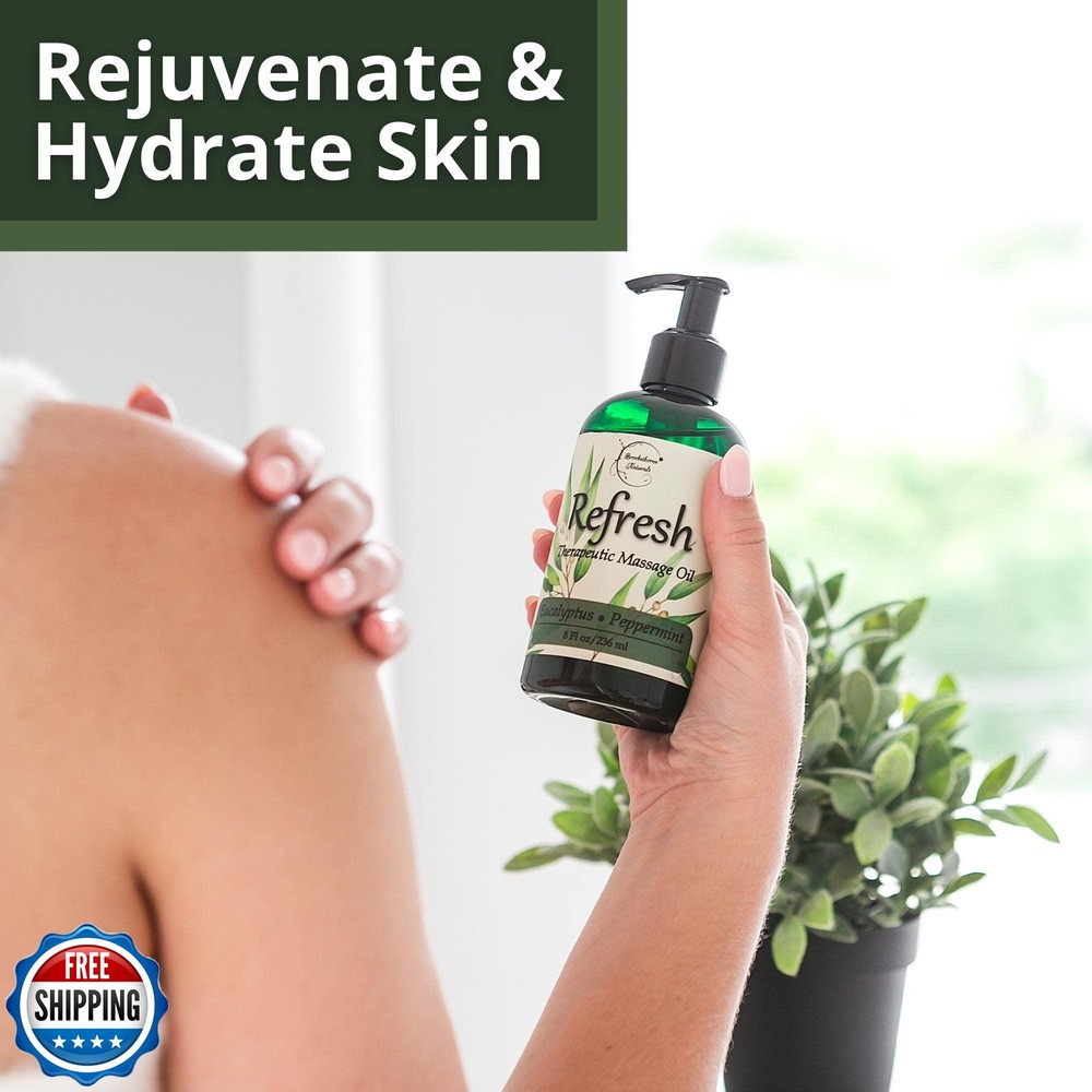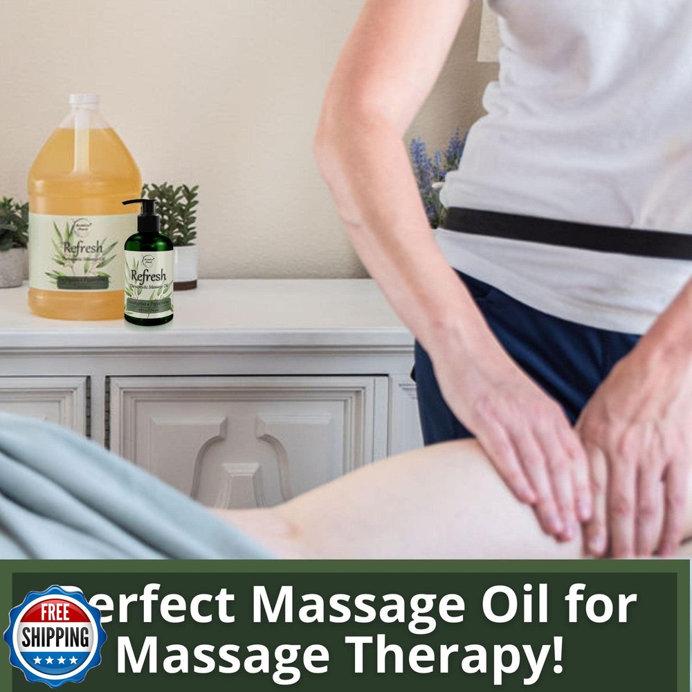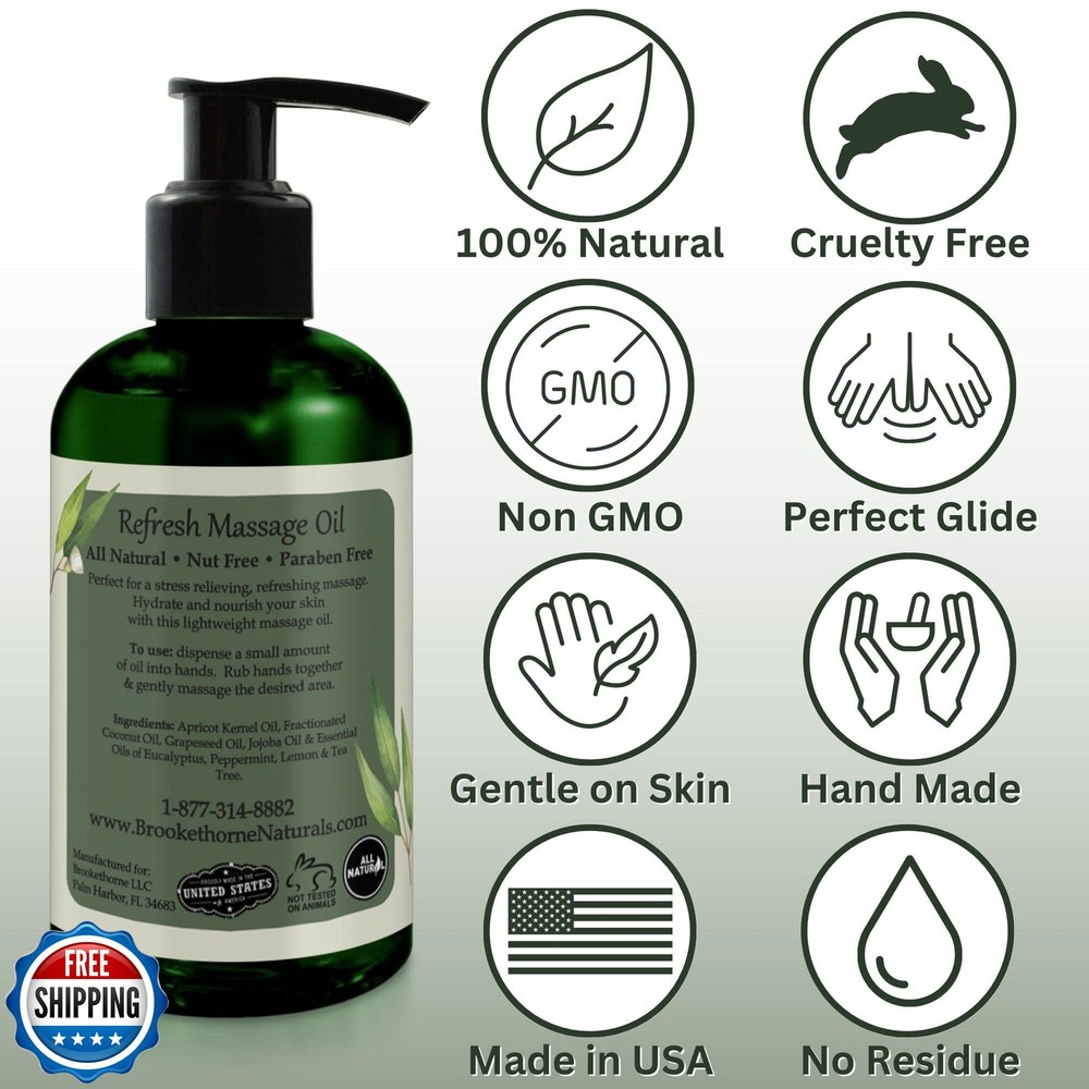 Refresh Massage Oil for Massage Therapy with Eucalyptus and Peppermint Essential Oils - All Natural Sore Muscle Relief. Ideal for Full Body Relaxation – Nut Free Formula 8oz Features LOOKING FOR A PICK ME UP? Lay back, relax & get ready for a refreshing & uplifting massage experience! Whether you are giving or receiving the massage, this massage oil is sure to please! Enriched with the best essential oils for massage – Eucalyptus helps to rejuvenate while Peppermint calms the body. The Result…A Happier, More Refreshed You! YOU DON’T HAVE TO SPEND A FORTUNE ON A MASSAGE…Refresh Massage Oil will make you feel like you are at the spa while being in the comfort of your own home! Works great with various massage tools, handheld massagers, foot massager, massage roller or with a more HANDS ON approach…whatever you prefer! FINALLY A MASSAGE OIL THAT DOESN’T LEAVE YOU FEELING STICKY or slimy after your massage. Refresh Therapeutic massage oil was formulated to provide the perfect glide during your massage & leave your skin feeling silky smooth after (never greasy). Great for Professional Use! SET YOURSELF APART by giving your clients a massage they WON’T FORGET! Keep them coming back with Refresh Therapeutic Massage Oil. Ideal for use for all types of massage therapy including hot stone massage, deep tissue & more! MADE IN THE USA WITH PREMIUM QUALITY, ALL NATURAL INGREDIENTS – Our “Nut Free” formula features Apricot Kernel, Coconut, Grapeseed & Jojoba Oils which hydrate & nourish the skin. Eucalyptus & Peppermint essential oils offer aromatherapy benefits & help to refresh and restore. Shipping Free & Fast Shipping: We offer free shipping to most of the USA with a normal delivery time of 3-7 days. However, due to the current situation, additional delivery time (up to 3 weeks) may be required for some items. Alternative Carriers: We may use alternative carriers (e.g., USPS, FedEx, UPS) to ensure your package arrives safely and on time. Due to the use of multiple carriers, we are unable to provide a tracking number automatically. Handling Time: Orders are processed and shipped within 1-2 business days of receiving cleared payment. Shipping Restrictions: Shipping to Alaska, Hawaii, Puerto Rico, Guam, and other US territories may incur shipping charges or delivery restrictions. Please contact us before ordering, or your order can be refunded/cancelled. State Restrictions: Certain items may not be shipped to California due to state regulations. Contact for Tracking Updates: If you require tracking updates or have any concerns about the delivery of your order, please feel free to contact us, and we will be happy to assist you. Return Policy 30-Day Hassle-Free Returns: If you are not completely satisfied with your purchase, you can return the item for free within 30 days of receiving it for a full refund or exchange. Easy Return Process: Contact us, and we will provide you with a prepaid return shipping label and detailed instructions. No Restocking Fee: There are no restocking fees for returns. However, the buyer is responsible for return shipping costs if the return is not due to a seller"s error. Refund Processing: Refunds will be processed within 1 business day of receiving the returned item in its original condition. Feedback Your feedback is extremely important to us. We strive to provide the best products and customer service possible. If you are satisfied with your purchase, please take a moment to leave us a positive review. If you have any concerns or issues with your order, please contact us before leaving negative feedback. We are committed to resolving any problems and ensuring your satisfaction. Contact Us If you have any questions or concerns, please feel free to reach out to our customer support team. You can contact us through the eBay messaging system. We are available Monday to Friday, 9:00 am to 5:00 pm EST, and we will do our best to respond to your inquiry within 24 hours. Thank you for supporting our small family business!