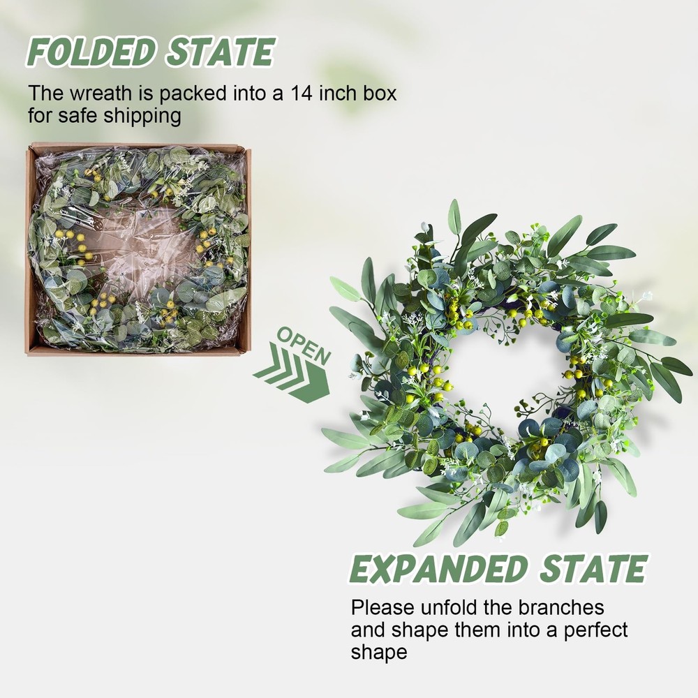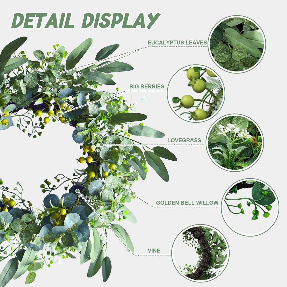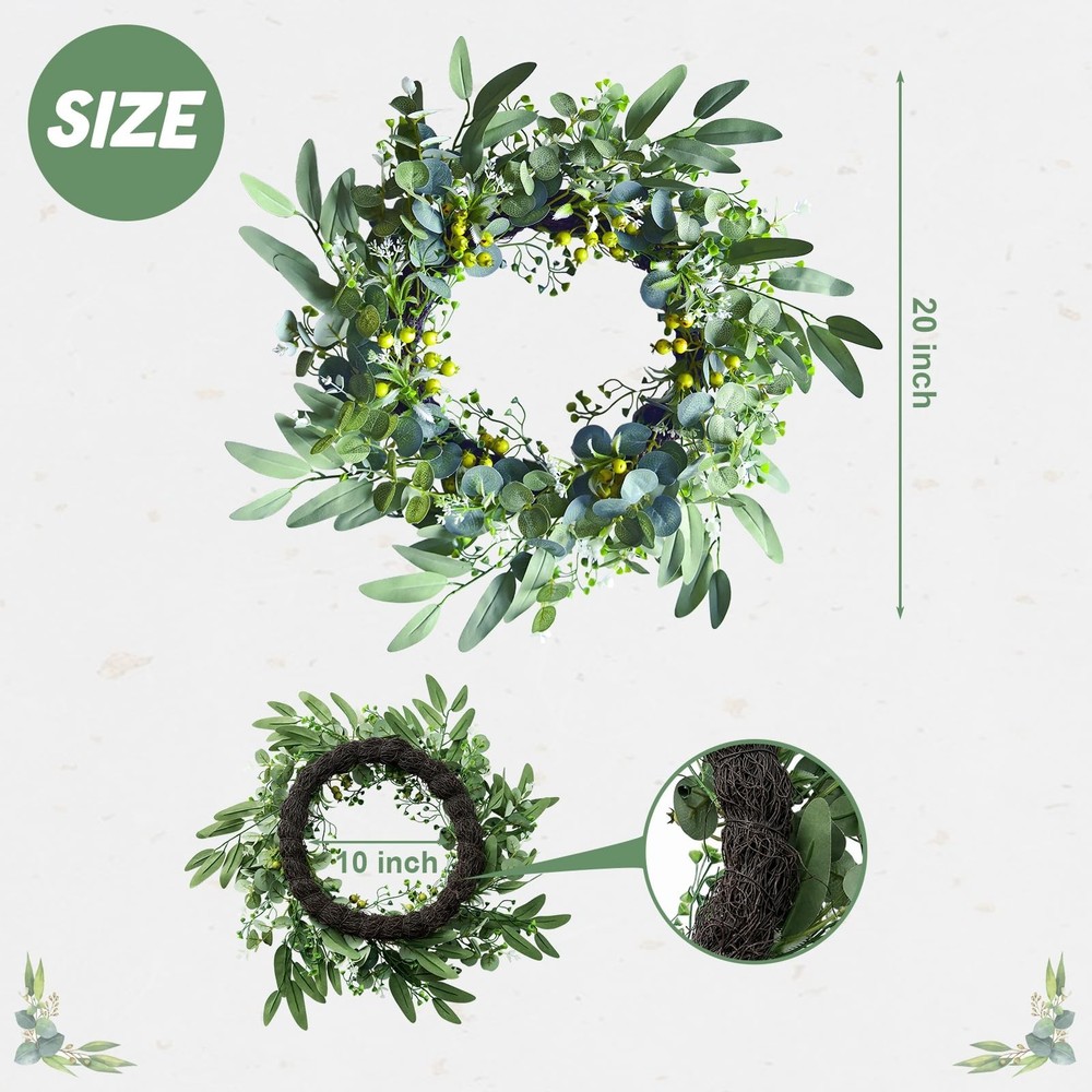 Eucalyptus Wreaths for Front Door,Summer Spring Fall,Door Wreaths for Front Door Outside All Season,Front Door Decor,Door Reef,20 in Product Details Color: Eucalyptus Wreaths for Front Door Size: 20inch Brand: bainianMS MPN: ASHH002 UPC: Does not apply EAN: Does not apply Color: Eucalyptus Wreaths for Front Door Brand: bainianMS Material: Silk, Foam, Plastic Mounting Type: Door Mount,Wall Mount Shape: Round Product Dimensions: 13.7"D x 13.7"W x 3.5"H Manufacturer: bainianMS Color: Eucalyptus Wreaths for Front Door Brand: bainianMS Material: Silk, Foam, Plastic Mounting Type: Door Mount,Wall Mount Shape: Round Product Dimensions: 13.7"D x 13.7"W x 3.5"H Manufacturer: bainianMS Item Weight: 1.15 pounds Country of Origin: China Item model number: ASHH002 Date First Available: March 16, 2025 Superior Craftsmanship & Quality Materials:Meticulously hand - crafted from top - grade silk cloth, plastic, and foam, our new - style eucalyptus wreath is a paragon of quality. Resilient against wind and rain, it resists deformation and fading. Lightweight yet durable, ensuring enduring beauty Incredibly Easy to Assemble:Boasting an innovative design, the wreath's branches are highly pliable. A gentle shake or a simple clockwise adjustment is all it takes to transform it into a perfect form. Hassle - free and user - friendly Extraordinarily Lush & Realistic:Set apart from traditional wreaths, our new model features two additional materials. This results in a fuller, more lifelike appearance, bringing the essence of nature indoors Exceptionally Sturdy Construction:Employing a small iron rod insertion technique, we've fortified the connection of branchesberries and the vine ring.They remain firmly in place, withstanding regular handling Versatile Decor for Multiple Scenes:This eucalyptus wreaths for front door is a chameleon of decor. Ideal for both indoor and outdoor settings like front doors, above fireplaces, in living rooms, or on front porches. It also shines in event spaces such as hotels, weddings, and as a photography backdrop