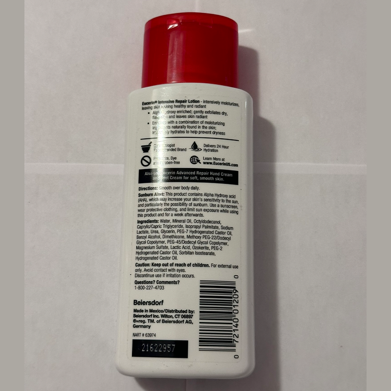 NEW Eucerin Intensive Repair Rich Lotion Moisturize Dry Rough Skin, 5 oz Give your skin the hydration it craves with Eucerin Intensive Repair Rich Lotion , a deeply nourishing moisturizer that helps repair and relieve dry, rough skin. This rich, fast-absorbing lotion is specially formulated with a blend of ingredients to replenish moisture and restore skin’s natural smoothness, leaving your skin feeling soft, supple, and hydrated. Perfect for daily use, this 5 oz bottle provides intensive moisture for even the driest skin, making it ideal for areas like elbows, knees, and hands. With its non-greasy formula and dermatologist-recommended brand, Eucerin offers reliable, long-lasting relief from dryness and irritation. Features: Deep Moisturization: Intensive formula for dry, rough, and sensitive skin. Rich & Nourishing: Restores moisture and smoothness without a greasy feeling. Skin Repair: Helps to repair dry, damaged skin with regular use. Fast Absorbing: Non-greasy texture that absorbs quickly and leaves skin feeling soft. Dermatologist Recommended: Trusted by skin care professionals for over 100 years. Specifications: Brand: Eucerin Size: 5 oz Formulation: Rich, non-greasy lotion Skin Type: Ideal for dry and rough skin Usage: Apply to skin daily or as needed for lasting hydration. Ships securely packaged from a smoke-free, pet-free home. Feel free to message with any questions!