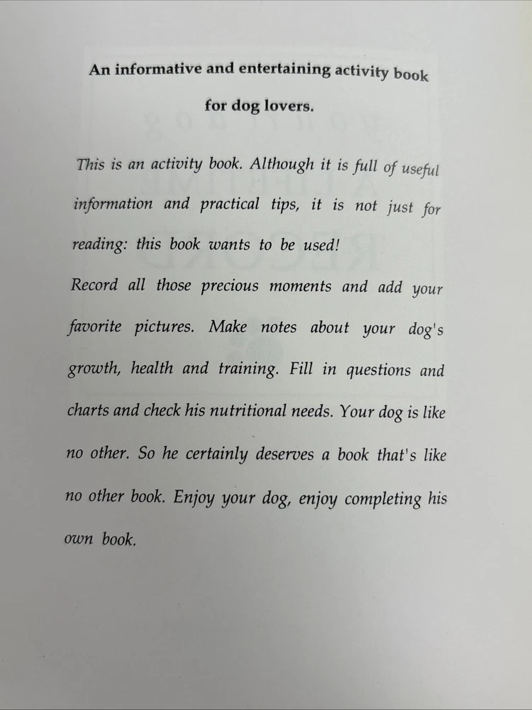 Eukanuba Dog Foods presents "Your Dog A Lifetime Record," a hardcover book that serves as a charming and informative pet journal for dog lovers of all ages. The book, published in 1995 by Recorded Books, is tailored to enthusiasts who value recording the milestones and adventures of their canine companions. The book features beautifully illustrated pages that provide a visual feast for readers. It is written in English and is suitable for a broad audience, including young adults, ages 4-8, ages 9-12, and adults. It is a collector's edition, making it a unique addition to any dog lover's library.