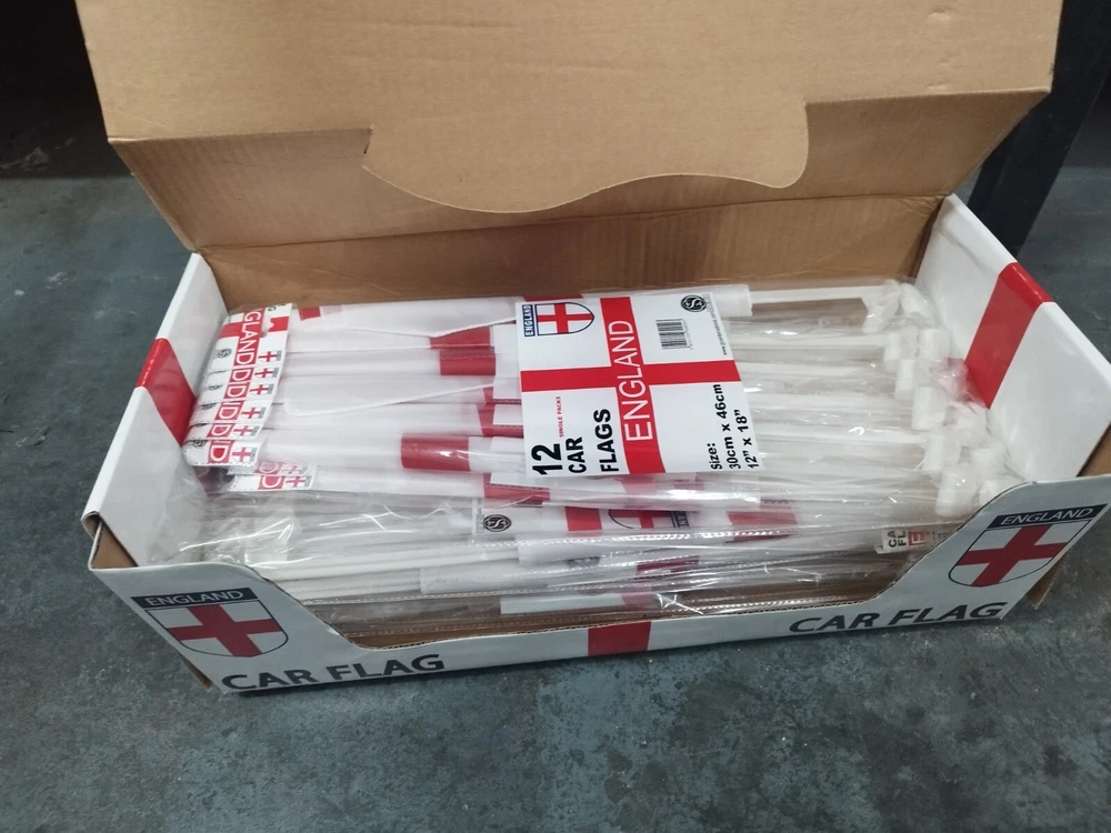 You will receive 2 boxes, each box contains 48 flags individually wrapped. A total of 98 single window car flags featuring St George's cross flag and ENGLAND wording in the middle.