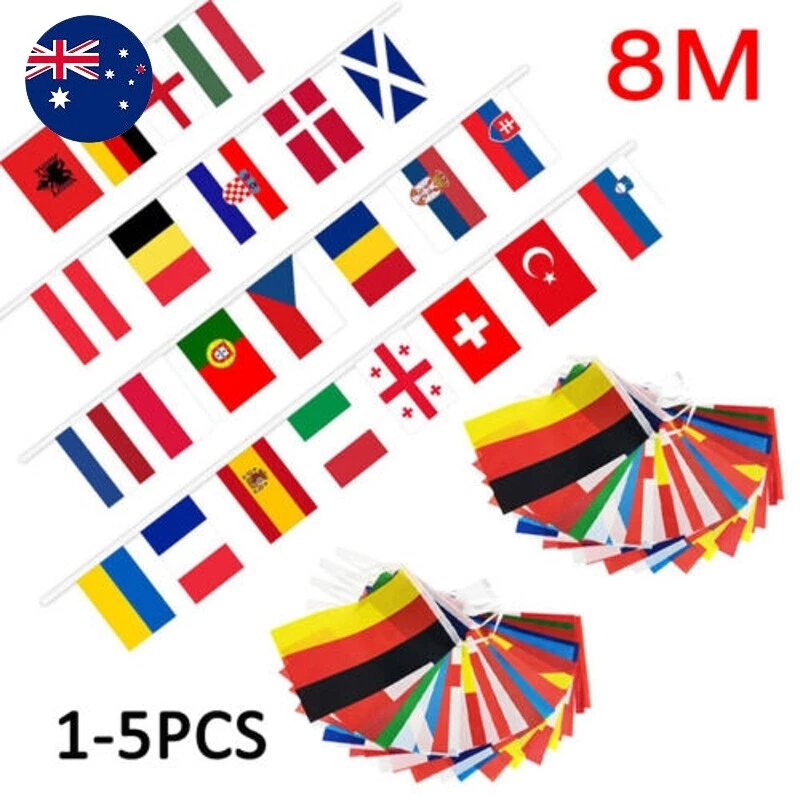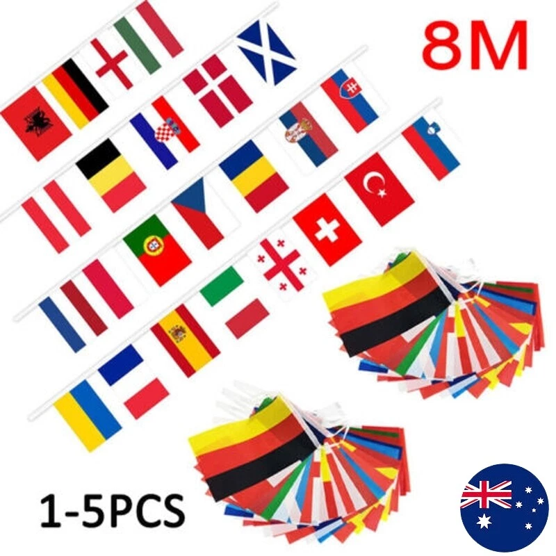 International Bunting - 8m Perfect for Euro 2024 24 Team Flag Country Bunting - Countries as pictured 8 METRES - (Approx) Great Quality and durable fabric bunting with bright colours to celebrate different events. Double-sided bunting Material: Polyester Bunting Length: 8 Metres lengths Flag Size: 21*14cm, 24 Flags On 14/06/2024 at 16:24:22 AEST, seller added the following information: On 09/10/2024 at 23:21:35 AEDT, seller added the following information: On 10/10/2024 at 15:11:37 AEDT, seller added the following information: