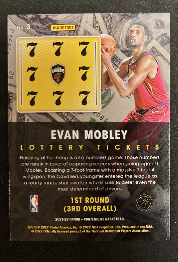 Card Attributes: Rookie Product: Single-Insert Card Name: Evan Mobley Set: 2021-22 Panini Contenders Original/Reprint: Original Card Number: #3 Year: 2021-22 Card Manufacturer: Panini America, Inc. Team: Cleveland Cavaliers Type: Sports Trading Card Features: Rookie Parallel/Variety: [None] Player: Evan Mobley Athlete: Evan Mobley Franchise: N/A Season: 2021-22 Year Manufactured: 2021 Manufacturer: Panini Player/Athlete: Evan Mobley Sport: Basketball