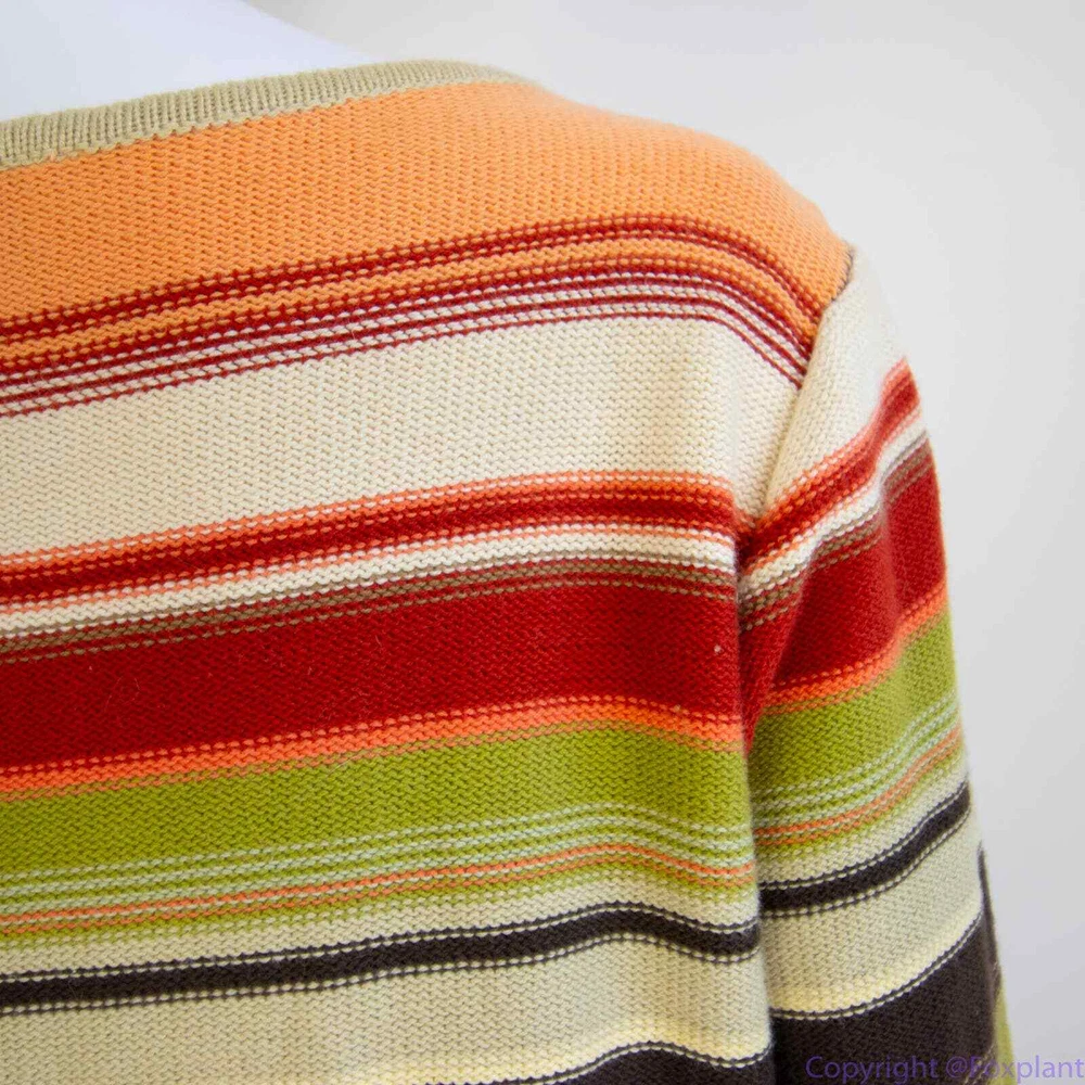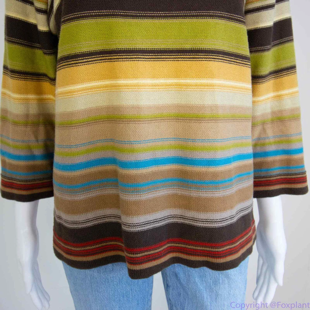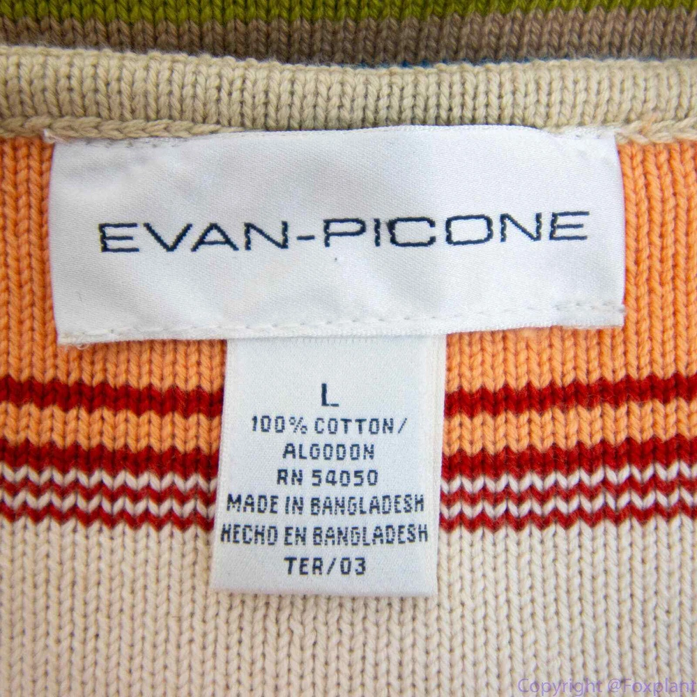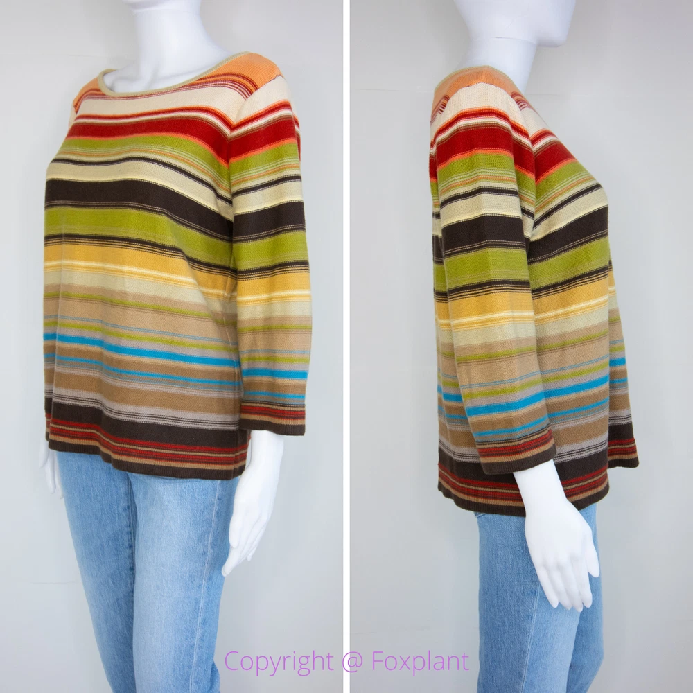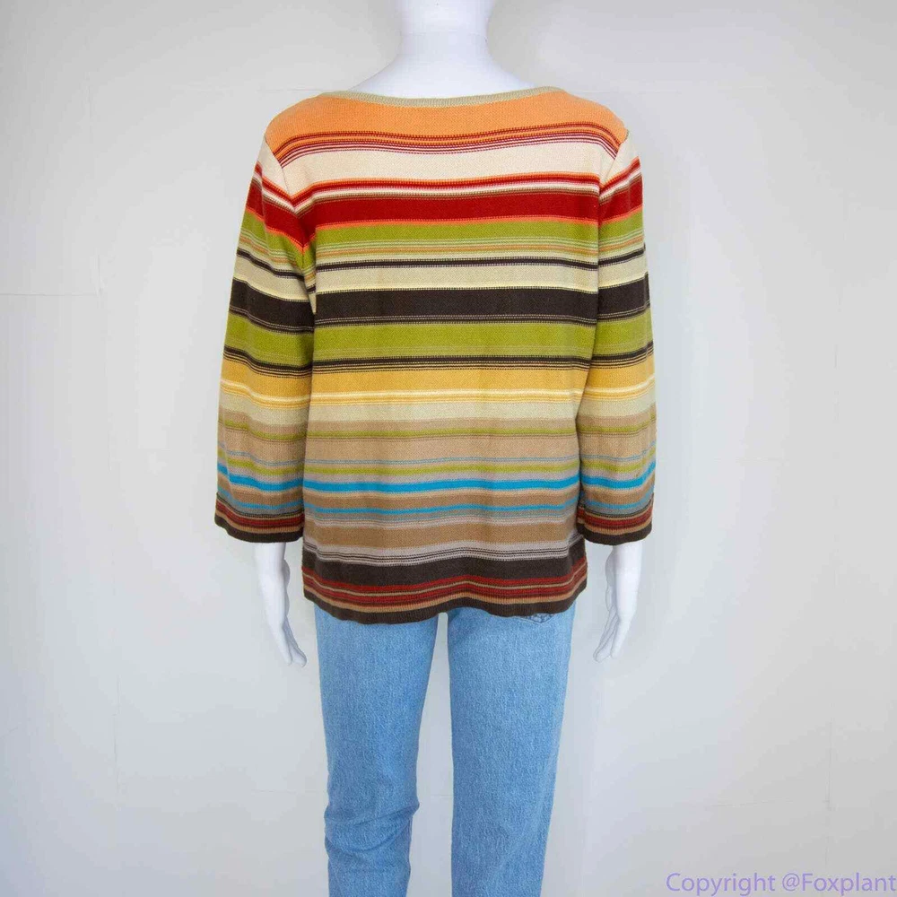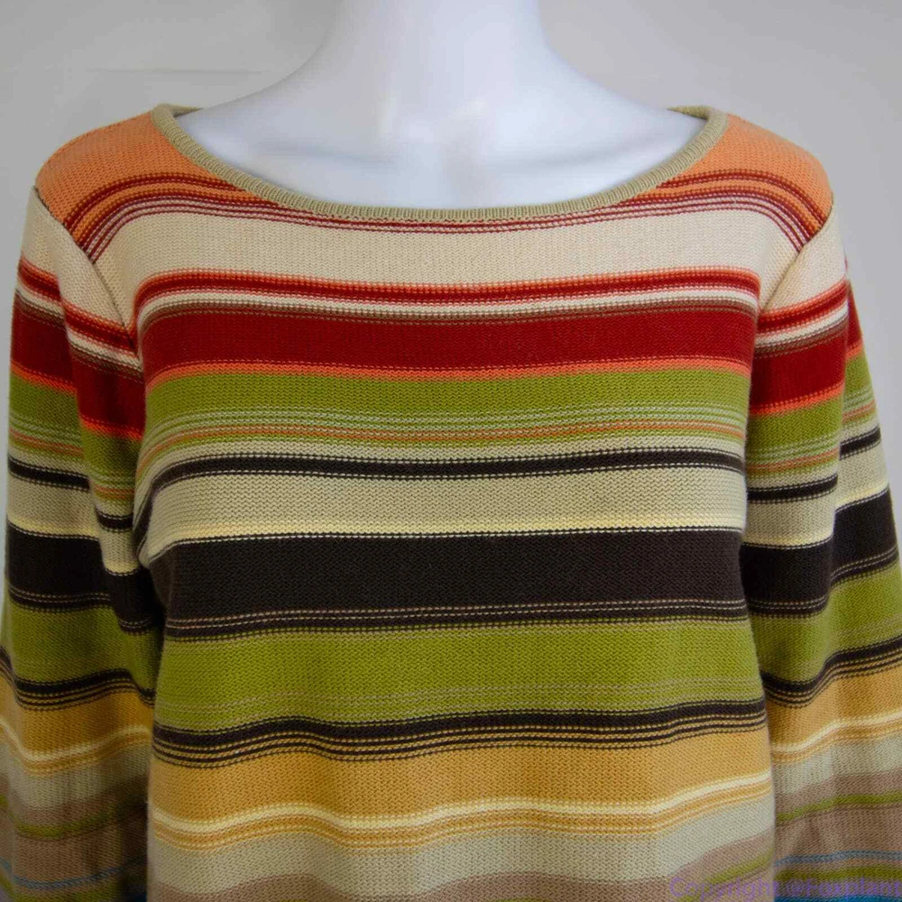 Evan Picone 100% cotton multi-color stripes sweater, women's size L 100% cotton multi-color stripes 3/4 quarter sleeves boat neck Color: red, orange green, gray, beige, yellow, blue. Very colorful. Size L , please check approximate laid flat measurements: Shoulder(seam to seam): 15 3/4'' Bust(armpit to armpit): 21 1/4 '' Length (from high point of shoulder down): 23 3/4'' Sleeve(shoulder seam to hem): 17 3/4 '' Excellent condition. No noticeable flaws or stains or damages.