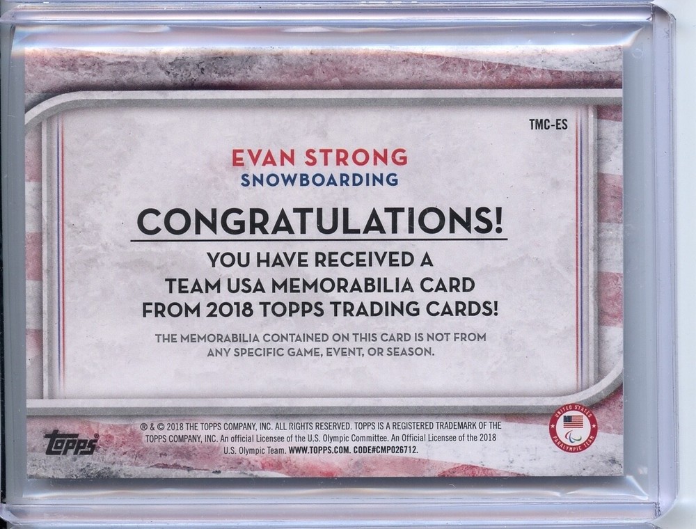 The product is a 2018 Topps trading card featuring Evan Strong, a member of the U.S. Olympic Team USA. This card is a memorabilia piece relic, meaning it contains a piece of memorabilia related to the athlete embedded within the card. The card is part of the Topps Co. brand and is from the Modern (1970-Now) era, making it a valuable collectible for fans of sports trading cards, especially those interested in the U.S. Olympic team and Evan Strong's achievements.
