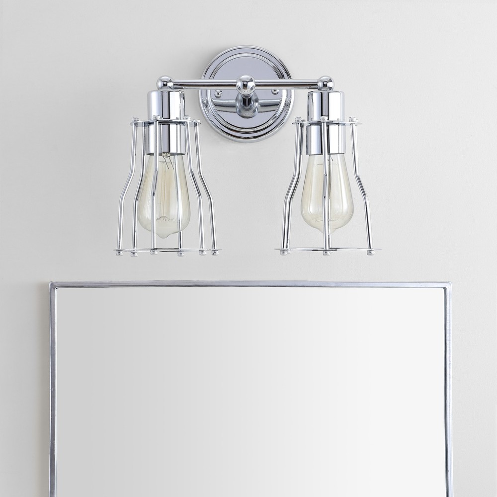 Define your bathroom or vanity space with the handsome industrial look of this sconce, which can be hung in either direction according to your preference. This classic industrial cage bath light features a hand-worked frame and round wall plate in a polished finish. Edison-inspired bulbs add a vintage touch within the fixture, while the machined details of the shade cage evoke the turn of the century, when exposed bulbs were in vogue as only the most affluent households had upgraded to electricity from candlelight. This trend-forward, yet classic style is sure to be a classic for another century to come. Features:Industrial and modern, add a sleek element to your rustic décor with this bathroom sconce or vanity light Fully reversible, you can choose to hang the sconce in either North-South Free Shipping Over $49.99* Details Evelyn Metal Vanity Light, by JONATHAN Y Product Description: Define your bathroom or vanity space with the handsome industrial look of this sconce, which can be hung in either direction according to your preference. This classic industrial cage bath light features a hand-worked frame and round wall plate in a polished finish. Edison-inspired bulbs add a vintage touch within the fixture, while the machined details of the shade cage evoke the turn of the century, when exposed bulbs were in vogue as only the most affluent households had upgraded to electricity from candlelight. This trend-forward, yet classic style is sure to be a classic for another century to come. Features: Industrial and modern, add a sleek element to your rustic décor with this bathroom sconce or vanity light Fully reversible, you can choose to hang the sconce in either North-South orientation Takes two bulbs and compatible with any 9W LED or 40W Type "A" or 13W CFL 25W Edison bulb included As this fixture must be hardwired, we recommend a professional electrician manage installation ColorMetal Body MaterialMetal IncludesOne (1) lamp Assembly Required Dimensions: Lamp10.38 inches high x 12.5 inches wide x 7.5 inches deep About us: You see a lamp. We see a decorative work of art. A perfectly curved shade casts a dramatic shadow on a floor. Compatible with LED lightbulbs as easy on the environment as they are on the eyes. The JONATHAN Y Lighting collection considers every detail from impeccably sourced materials to designer styling. And our prices are so attractive, we've transformed a functional necessity into a fashion accessory. JONATHAN Y Lighting - a fashion revolution in home decor.