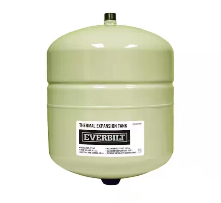 Built with heavy-duty butyl diaphragm system to absorb the expansion of water volume and help prevent dangerous pressure build-up. This Everbilt Expansion Tank will absorb pressure increases when properly installed on your closed water system. Most local codes now require an Expansion Tank on residential closed water systems. Water pressure over 80 psi can shorten the life of your water system and appliances. Stainless steel 3/4 in. MIP with hex Factory pre-charged at 40 psi Certified with cUPC and NSF 61 compliant Brass air charging port with O-ring seal 16-Gauge cold rolled steel shell High quality coating prevents corrosion 100% butyl rubber diaphragm lined with polypropylene Maximum pressure of 150 psi Maximum temperature rating of 200 degree F Protects water heater, fixtures and appliances California residents see Prop 65 WARNINGS Product Information Internet # 304122098 Model # EF-TET-4T Store SKU # 1003064928 B114