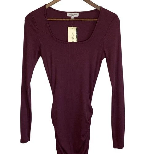 New With Tags Elevate your evening look with this stunning burgundy bodycon dress. Perfect for cocktail parties, date nights, or formal events. The ruched design flatters your curves, while the rich color exudes sophistication. Pair with statement jewelry and heels for a head-turning ensemble that's sure to impress. Pullover style Square neckline Long sleeves Fitted Ruched Midi length Left side slit Soft, comfy tee shirt feel Stretch Made in USA Original retail - $108 48% cotton, 48% modal, 4% spandex Machine washable Style profile - date night, cocktail party, evening, night out, flirty Approximate flat lay measurements: Shoulder to bottom hem length - 46" Pit to pit width - 14" Please compare measurements to something you already own to verify size and fit We are happy to answer any questions! We ship the next business day!