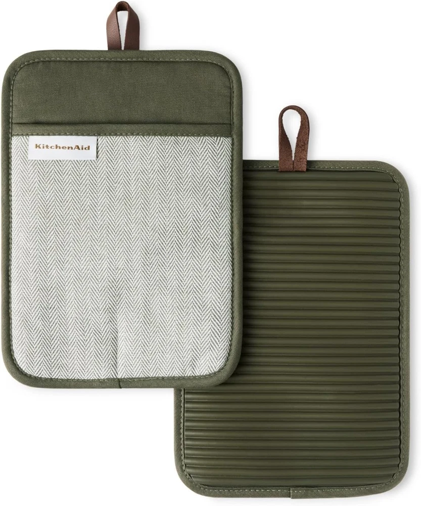 Store New Arrivals Add to Favorite View Feedback Contact ® Evergreen Design Series Herringbone Ribbed Soft Silicone Pot Holders 2-Pack Set, Heat Resistant up to 500°F, Flexible & Waterproof, Deep Forest Green, 7"X10" Description Item model number 2P023659TDKA A223 Color Deep Forest Green Country of Origin China Shape Rectangular Item Weight 3.36 ounces Outer Material Cotton, Polyester Fill Material Polyester Number of Pieces 2 Product Dimensions 10"L x 7"W Product Care Instructions Wipe with Damp Cloth FLEXIBLE, HEAT RESISTANT SILICONE: molded ribbed silicone is heat resistant up to 500 degrees Fahrenheit to safely protect hands and surfaces from the heat while handling hot cookware WATERPROOF & SLIP-RESISTANT: silicone pot holders are water resistant for additional protection from hot spills and spots with a textured, ribbed stripe design for a safe and secure grip SET OF TWO: includes two (2) pot holders with thick terrycloth lining, each measuring 7”x10" for a comfortable fit and added protection ELEVATED DETAILS: features brown vegan leather hanging loops for display or storage EASY CARE: Simply rinse off with water and wipe them clean - spot clean only Standard 100 by Oeko-Tex Certified KitchenAid® Evergreen Design Series Herringbone Ribbed Soft Silicone Pot Holders provide a secure, non-slip grip while safeguarding your hands and surfaces from heat up to 500 degrees Fahrenheit. Featuring flexible, molded ribbed silicone palms and a thick, 100% cotton herringbone-textured lining, these pot holders combine style and functionality. The thick diamond terrycloth lining and vegan leather loops enhance both usability and storage. Versatile use as potholder, oven mitt, or trivet. The waterproof silicone ensures easy rinsing for long-lasting durability. ABOUT US We offer the best prices around on high quality products. Our E-store includes media such as books, movies, music and games while offering electronics, toys, sporting apparel, clothing, tools, general home, garden items and more. SHIPPING We are always working hard to ensure your package arrives as soon as possible. Please understand that some factors like weather, high postal traffic, and the performance of shipping companies are outside of our control. We offer free shipping to the lower 48 states and ship within 2 business days of payment, usually sooner. We do not accept P.O. Boxes. Please provide a physical address. RETURNS We offer a 30-Day Return Policy on items which you are not completely satisfied with. You have the option for a full-refund or an exchange of the item. No returns are available on items shipped outside of the USA. PAYMENT We accept PayPal. CONTACT US This page content is yet to come Please ad us to your favorite seller and visit again later Thank You CUSTOMER SATISFACTION We try our very best to make sure every customer is completely satisfied. If there's a problem, message us! We're happy to help.