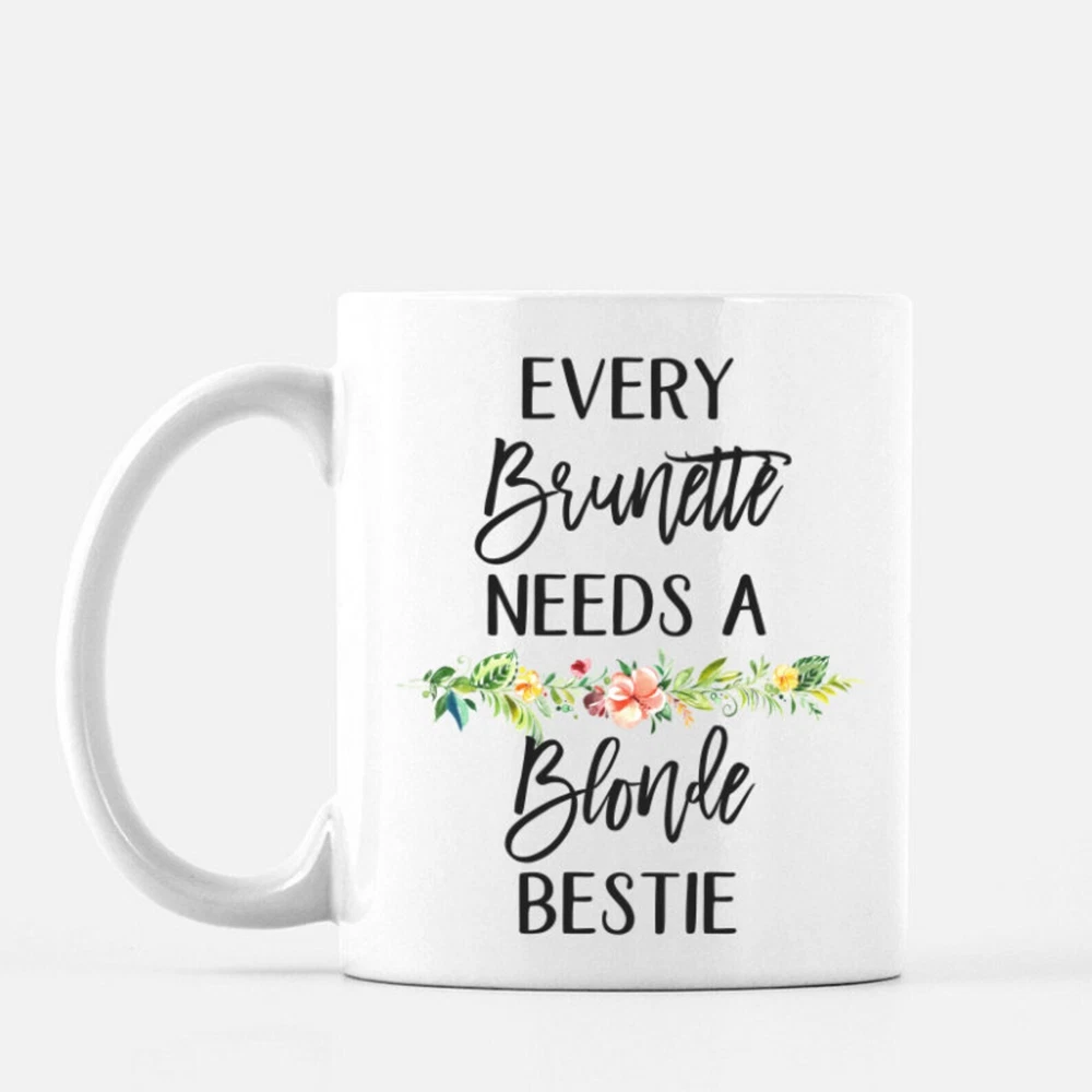 Every Brunette Needs A Blonde Bestie Best Friends Mug Bff Gift For Best Friend Product Details.. This high quality 11oz. ceramic white mug has a premium hard coat that provides crisp and vibrant color reproduction sure to last for years. Perfect for all hot & cold beverages. The highest quality printing possible is used. It will never fade no matter how many times you wash it. Material: 100% Ceramic. Print both sides. Dishwasher and Microwave Safe. High Gloss + Premium White Finish. Printed in the U.S.A. Personalized & Custom. We support personalized and custom mug to add custom, when placing an order, you can add notes to the "order note" in shipping address section. Also you can contact us directly via message. Shipping Info. Ready to ship in 1 to 2 business days, All products are made-to-order and proudly printed in the United States. Shipped by USPS and DHL, You will receive your order in 5-7 days. Replace & Refund. All products are defective during shipping broken, chipped will be replaced free of charge. You are not satisfied with the product, we will refund 100% money to you. If any other issues arise, please do not hesitate to message, we would be more than happy to assist you.