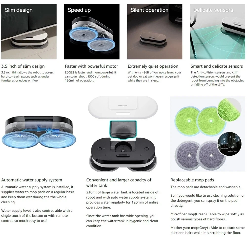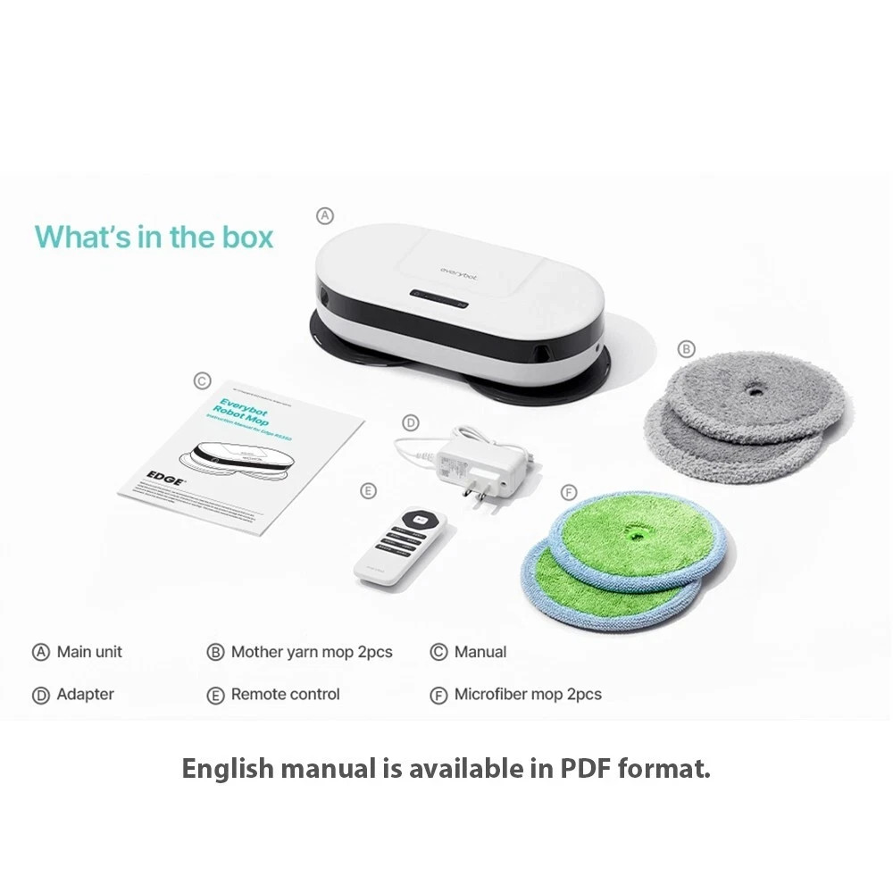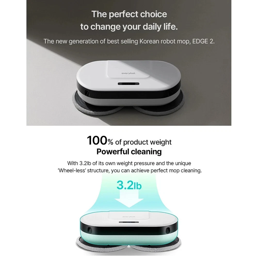 EVERYBOT Edge 2 High Performance Floor Mop Robot with Dynamic Dual Spin ● Powerful and Efficient Cleaning - The powerful and dynamic motor spins mop discs and creates high friction on the floor, it enables the robot to drive and clean at the same time. ● Pressure Mopping - Edge 2 does not just go through, it scrubs and cleans with pressure of its own weight and friction from spinning mop discs. You can expect high quality of floor mopping just as you have mopped by yourself, but without effort. ● Wet Mopping - 210ml water tank is located inside the robot and provide water in a regular basis to keep the mop pads wet during 120min of cleaning. ● 4 stage of water supply level - Dry mode < Level 1 < Level 2 < Level 3 and 'Drain water' function on remote control will help you to keep the robot clean and hygienic. ● Innovative Mop Pads - Two types of mop pads would help you with more effective and efficient cleaning. Spinning mop is not only for scrubbing the stain on the floor but it is able to collect pet hair and dust as well. ● Smart Cleaning - With Various safety and smart functional sensors, the robot detects obastacles and cliffs and avoid encounter or falling. ● Silent Cleaning - With only 42dB of low level of noise, it won't distrub you when you need a quiet moment and so as your pets would not even recognize it when they are in sleep. Specifications ● Dimensions: 13"L x 6.6"W x 3.52"H ● Battery: 1 * Lithium Ion ● Battery life: 120 minutes ● Item weight: 3.2 pounds ● Water tank size: 7oz (210ml) ● Noise Llevel: 42 db What's included ● Everybot Edge2 RS350 robot mop ● 2 * microfiber mops ● 2 * mother yarn mops ● Remote control ● Charger adapter -- F type plug with two round pins Note! ● This product comes with an F type plug which is compatible with plug type C . Please see the information in the 2nd thumbnail picture . Price & Duties (U.S. Customers) The price you see is the final price. From the buyer's side, no additional tariffs (customs duties) or fees are required. All additional tariffs (customs duties) or fees will be covered by the seller. This condition applies to U.S. customers only. SHIPPING Standard shipping takes about 7-20 days. (Tracking number provided) Expedited shipping takes about 3-7 days. (Fedex - speedy delivery + Tracking number provided) All our shipping includes tracking number We ship worldwide. All orders will be shipped from South Korea. We ship your orders within 3 business days after the payment. Please check whether your address is correct. We only ship to the address listed in the ebay It might take more than usual by any unexpected events including weather condition, no nonstop shipping, customs&house policy in your country. Please understand It takes more 2 or 3 weeks to receive items in South America, Russian Federation. PAYMENT Payment should be done within 3 days of auction's closure. Otherwise, we can't guarantee whether your item is still available. RETURNS We accept returns of any reason, but items should be in "NOT OPENED" condition. All returns must be sent within 14 days of receipt of the package. Once we receive the returned items, we will contact buyers to arrange refund of merchant value. Please note that postage is NOT refundable If you received the wrong item, Please let us know. We will exchange it to the proper item in our responsibility. If the item returned to us under unclaimed status, we will give you a full refund except shipping cost. OTHER TERMS & CONDITION Feedback will be left once after we have received payment from buyer. Please do not forget to leave us FIVE STARS on all of the Detailed Seller Ratings Please do not leave a neutral or negative feedback before contacting us to get a better solution for you. (A seller of anyone with star scores below 3 can no longer sell If you have any question about us or our products or shipment, feel free to ask us through "Ask seller a question" in your mobile app or "Contact seller" below the seller's information We will reply back to you ASAP, but if there's no response made within 48 hours, please check the spam list in your mail box. Tax & Customs Please note that import duties, taxes, and customs charges are not included in the item price or shipping cost. These additional charges may be collected by your country?s customs office at the time of delivery. Buyers are fully responsible for any customs-related costs. We recommend checking with your local customs office in advance to avoid any unexpected fees.