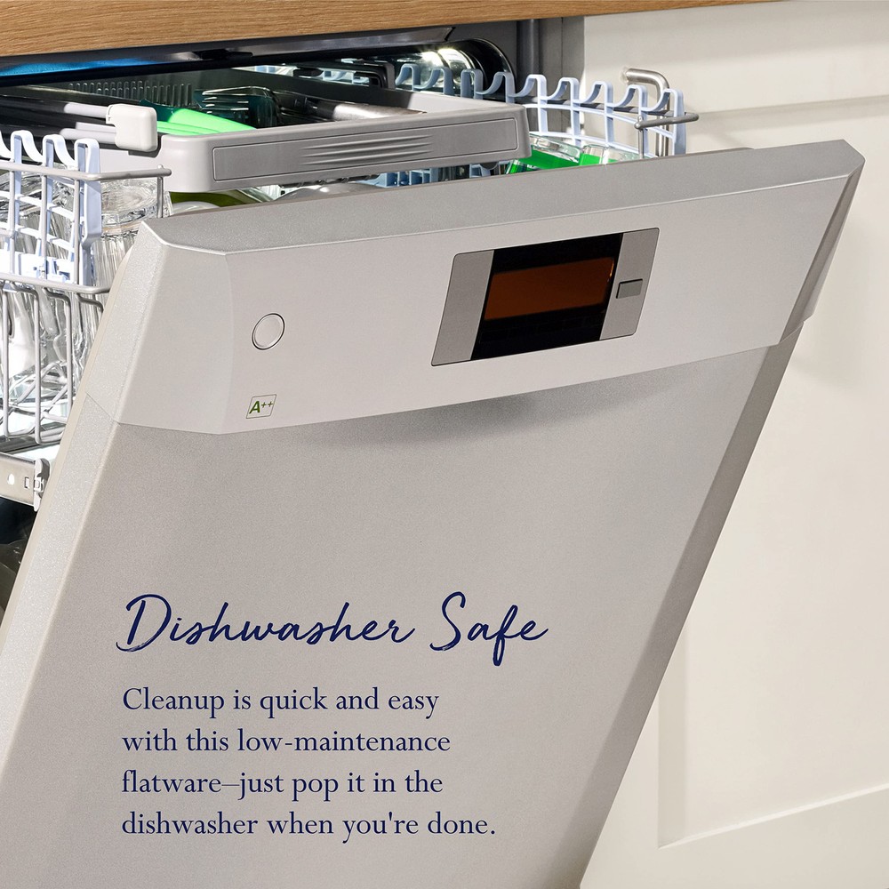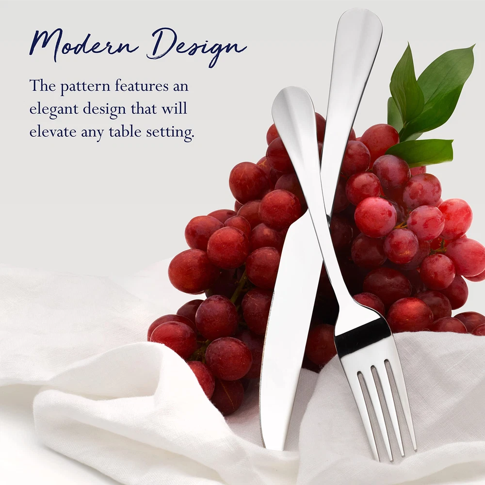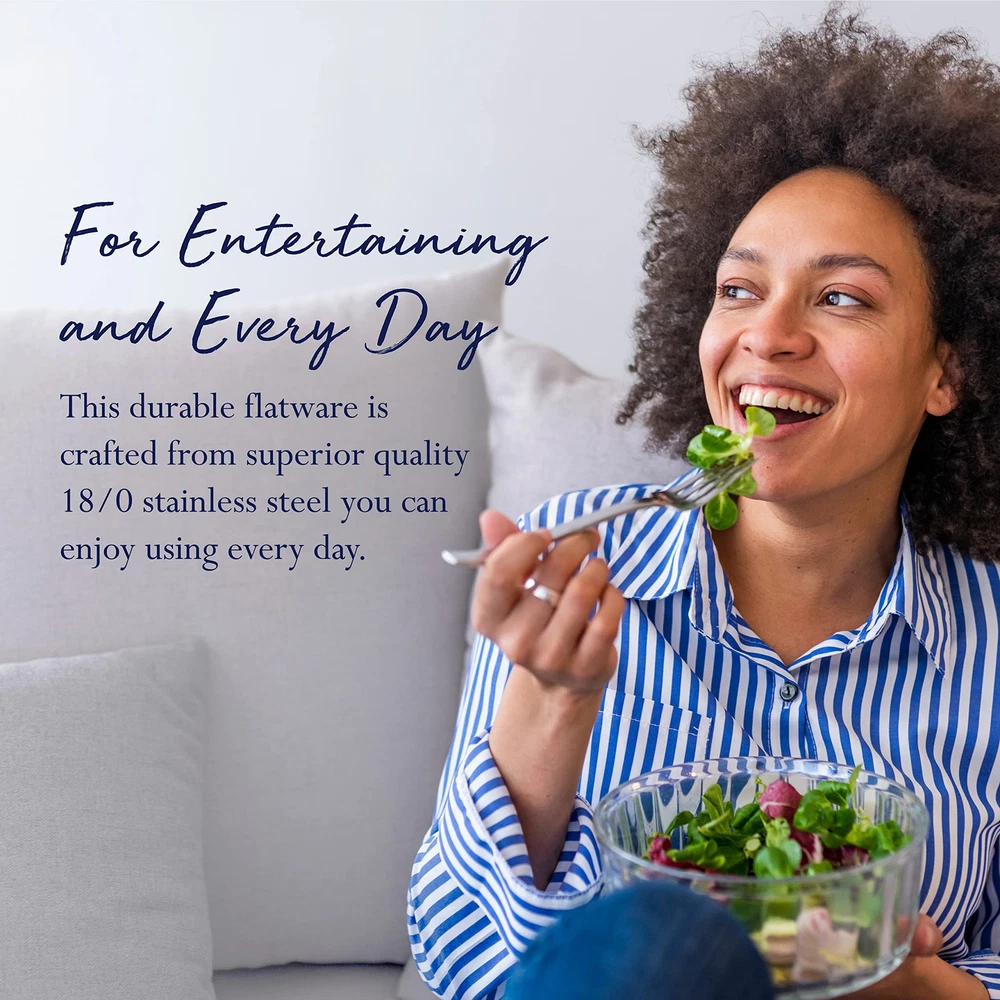 This Everyday Simplicity Flatware Set has graceful styling, making it perfect for any occasion. Quality crafted of 18/0 stainless steel, this set will stand up to the rigors of everyday use. 53 Piece Set, service for eight, includes (8) each: dinner fork, salad fork, dinner knife, dinner spoon, teaspoon and steak knives, plus a 5 piece Hostess Set, which includes (1) each of: tablespoon, pierced tablespoon, cold meat fork, sugar spoon and butter knife. Dishwasher safe. 53-PIECES OF FLATWARE INCLUDED: This 53-piece flatware set, service for eight, includes (8) of each: dinner fork, salad fork, dinner knife, dinner spoon, teaspoon, and steak knife HOSTESS SERVING UTENSILS: This set also features a 5-piece Hostess Set, which includes (1) each of: tablespoon, pierced tablespoon, cold meat fork, sugar spoon and butter knife QUALITY STAINLESS STEEL: This flatware is crafted of superior quality 18/0 stainless steel, this set will stand up to the rigors of everyday use NO POLISHING NEEDED: This flatware never needs to be polished, making care and maintenance easy DISHWASHER SAFE: This flatware is dishwasher safe, making clean up easy and convenient