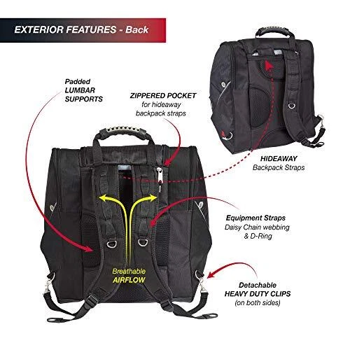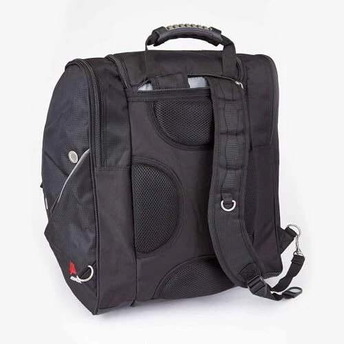 Description Pack a jacket, helmet, boots, and all your must have gear in this bag for your next outdoor adventure. The "Everything" Ski Boot Bag is loaded with features to suit your active lifestyle. The boot bag features zippered, ventilated side pockets for boots, a center section for a jacket, helmet, or clothing, an MP3 pocket on the front with headphone port, and clips in each pocket for gloves, keys, and other small accessories. There are bottom drainage grommets, a waterproof PVC bottom, a bungee cord on the front to hold a jacket or clothing layers, and reflective piping for increased visibility. Other features of this ski boot bag include padded hidden backpack straps, four padded lumbar back pads for comfort, and versatile top and front carry handles. ADVENTURE TRAVEL READY – pack a jacket, helmet, boots, and all your must have gear in this bag for your next outdoor adventure. The "Everything" Boot Bag is loaded with features to suit your active lifestyle AMAZING STORAGE – the boot bag features zippered, ventilated side pockets for boots, a center section for a jacket, helmet, or clothing, an MP3 pocket on the front with headphone port, and clips in each pocket for gloves, keys, and small accessories COMFORT FEATURES – this bag include padded hidden backpack straps, four padded lumbar back pads for comfort, and versatile top and front carry handles SPECIAL FEATURES – bottom drainage grommets, a waterproof PVC bottom, a bungee cord on the front to hold a jacket or clothing layers, and reflective piping for increased visibility DIMENSIONS: 17" x 15" x 14" / Capacity = 3570 cu. in. (58.5 liters) / Weight = 3.8 lbs. / Fits boots up to Size 13 men’s Constructed of high density polyester with waterproof backing Separate side entry zippered boot sections. Linear inches: 46 inches Reinforced, padded hidden backpack straps Bottom waterproof tarp to keep bag and contents from getting wet Contour shape fits boots and provides effortless transportation