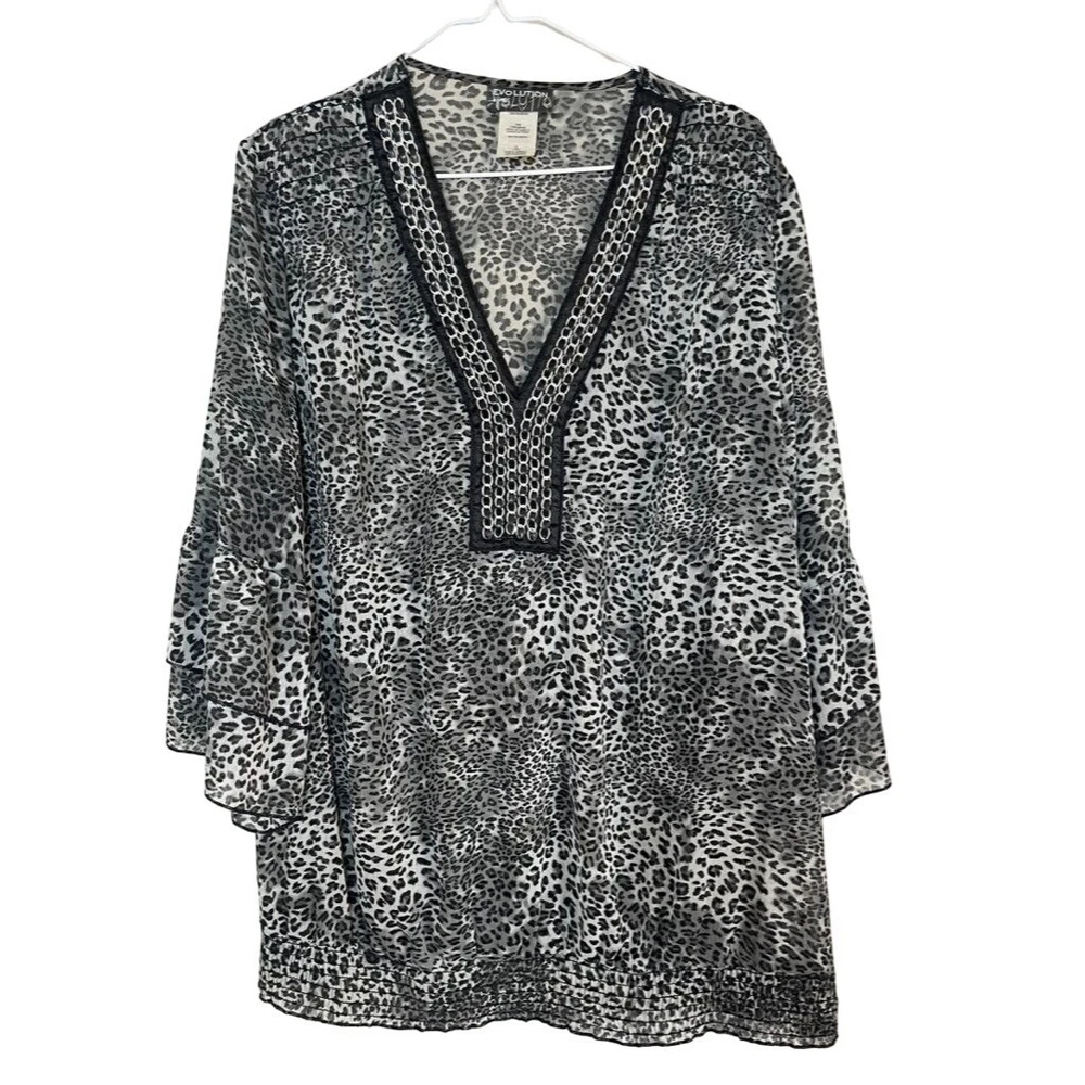 Accents: Strap Country/Region of Manufacture: Unknown Theme: 80s, Art, Biker, Bohemian, Classic, Cowboy, Gothic, Grunge, Hippie, Hipster, Holiday Features: Sheer Neckline: V-Neck Material: Polyester Size Type: Plus Character: Animal Print MPN: N Pattern: Animal Print Brand: Evolution Style: Basic Season: Fall, Spring, Summer Seller Notes: “Good” Department: Women Strap Type: Na Personalize: No Vintage: No Type: Blouse Color: Black Sleeve Type: Casual Sleeve Size: 1X Fabric Type: Polyester Fit: Regular Handmade: No Sleeve Length: Short Sleeve Occasion: Business, Casual, Travel, Workwear Closure: Pullover Garment Care: Machine Washable